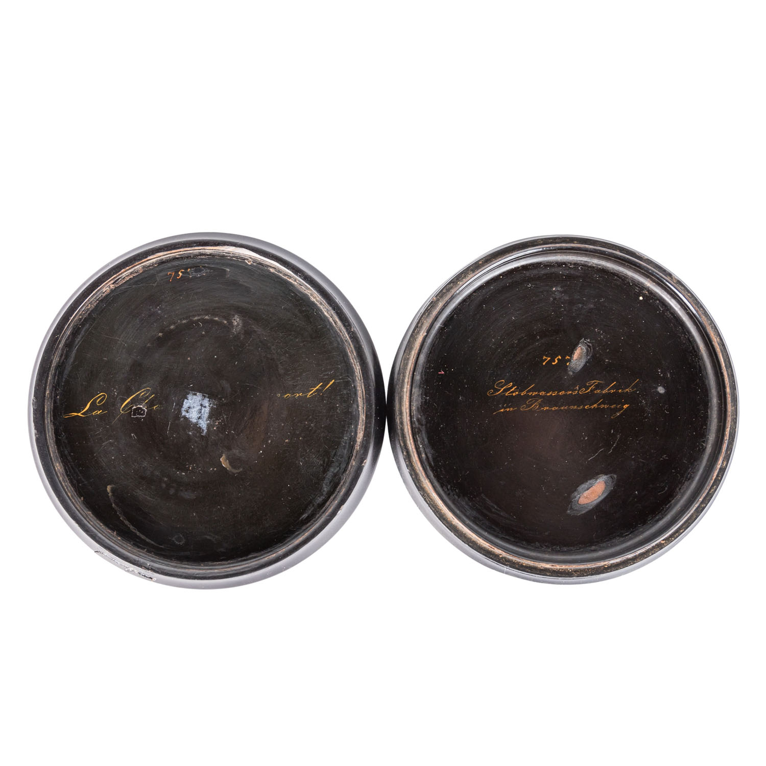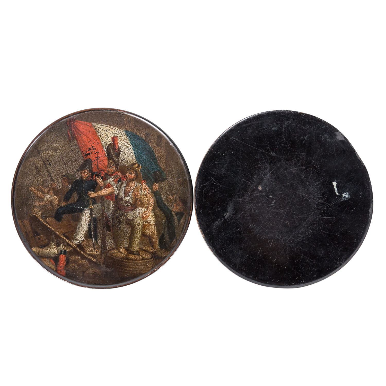 Braunschweig, 1. Viertel 19. Jh., Papiermaché, Öl-Lackmalerei, innen bezeichnet „757? Stobwasser Fabrik in Braunschweig“ und betitelt (unleserlich) 'La Charte ou la Mort' ('Die Verfassung oder der Tod'). D: 9,5 cm. Alters und Gebrauchsspuren.