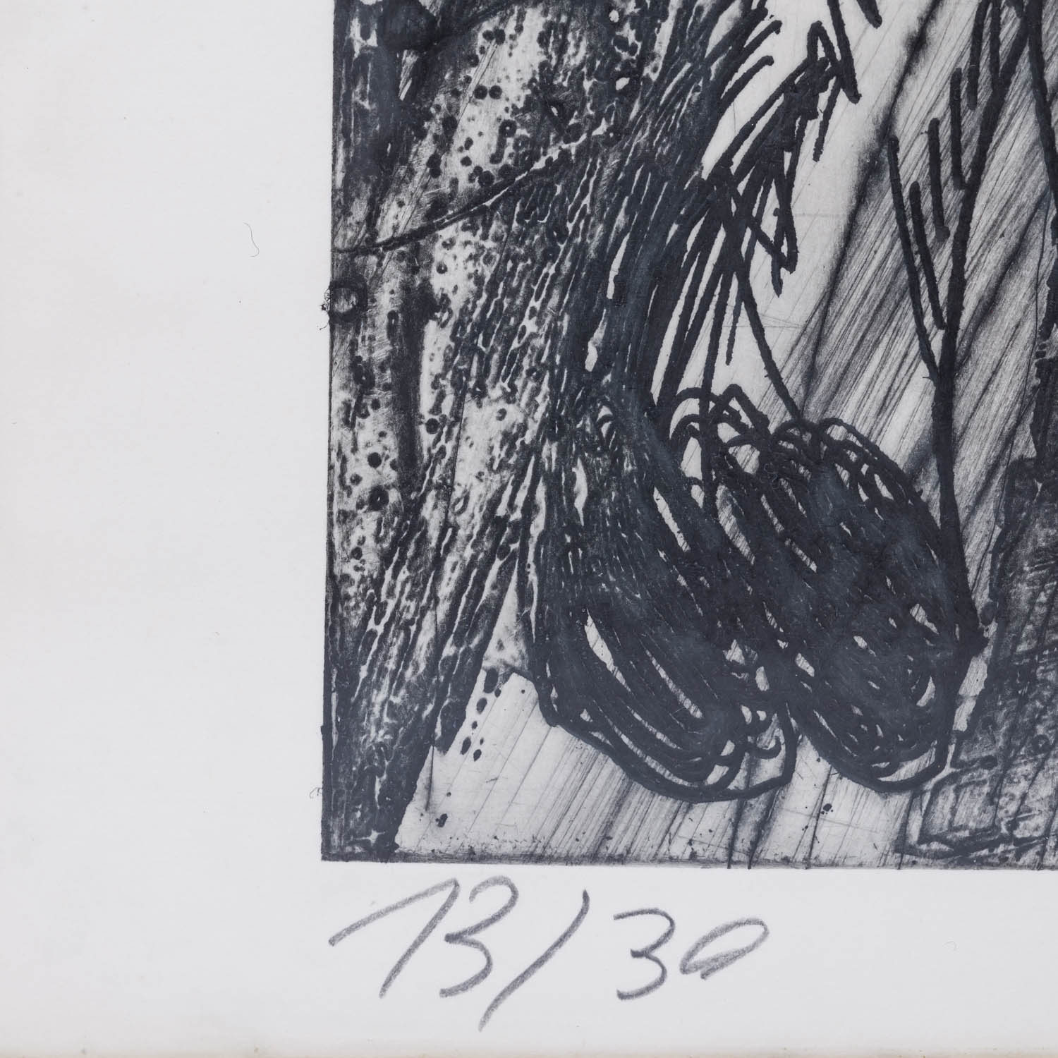 1.) Kaltnadelradierung/Bütten, mit Bleistift von Hand signiert und datiert, mit Bleistift num. 13/30, HxB: Platte ca. 36,5x22 cm, Blatt ca. 39,5x28,5 cm; 2.) Kaltnadelradierung/Bütten, mit Bleistift signiert und datiert, mit Bleistift num. 13/50, HxB: Platte ca. 26x18 cm, Blatt ca. 29,5x20,5 cm. Je Altersspuren und gebräunt, part. wenige Flecken. Je mit verglastem Rahmen (Altersspuren).