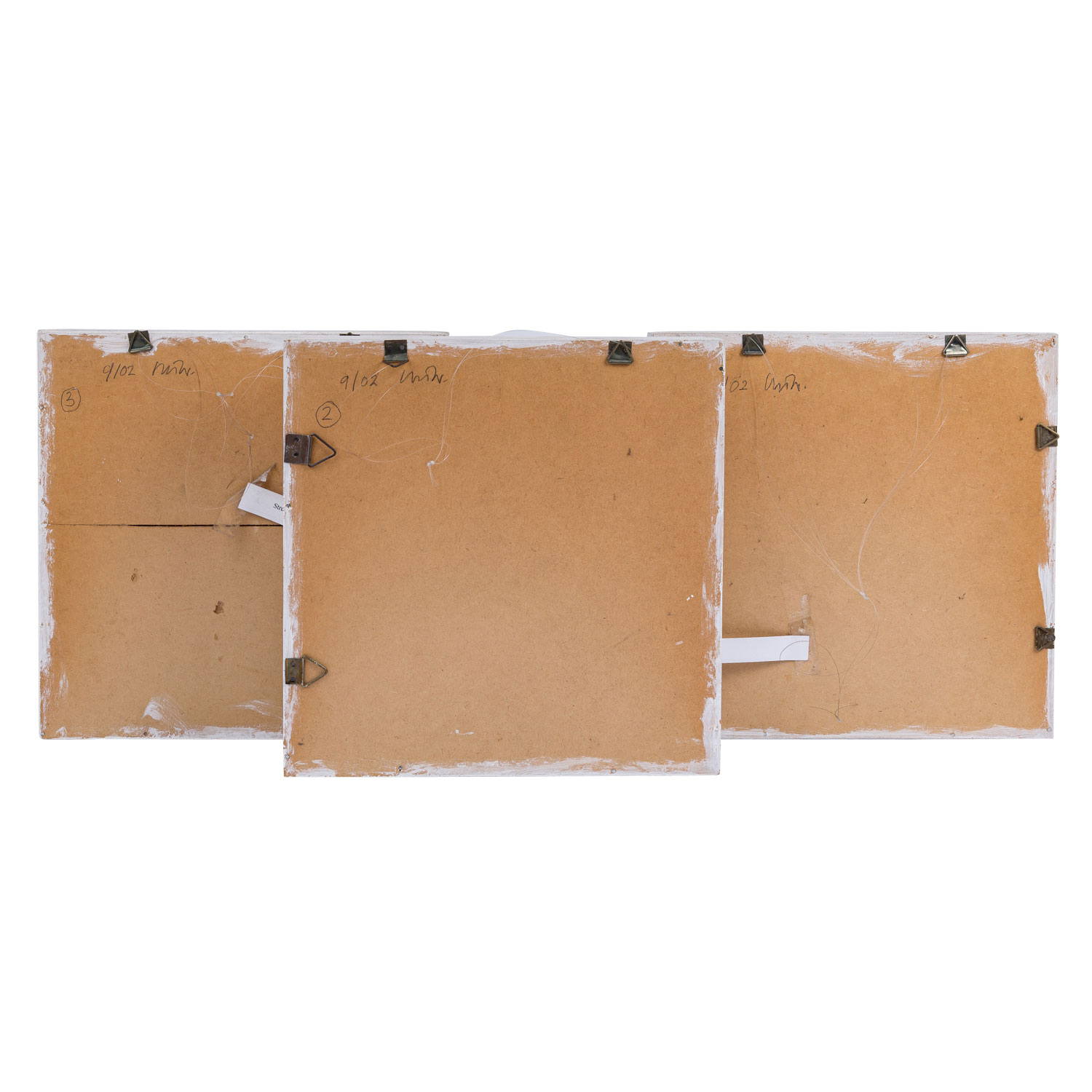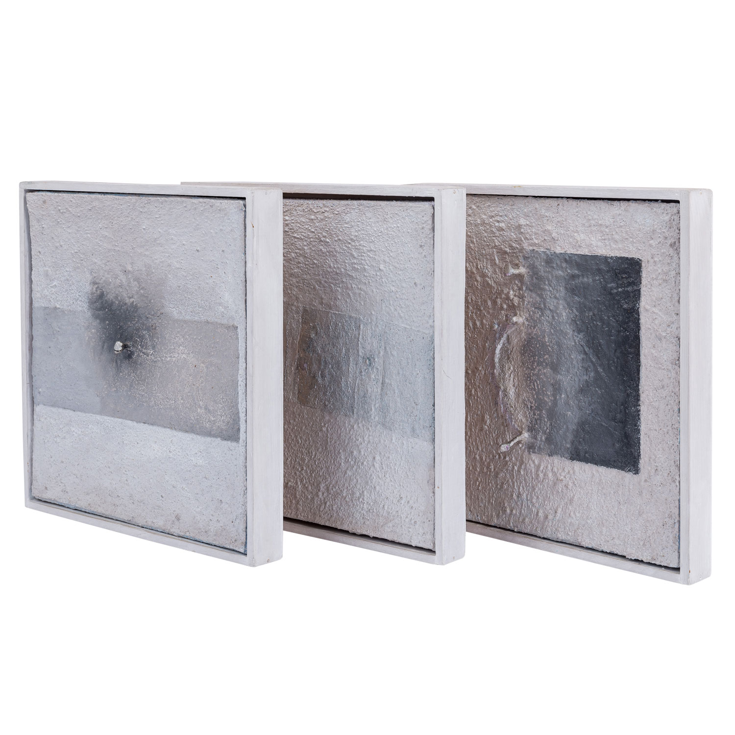Objektbilder in Grau- und Silbertönen, je Mischtechnik/Leinwand/Platte, davon 2x mit nagelförmigen Erhöhungen, je verso datiert 9/02 und signiert, HxB: Außenmaße je ca. 32x32 cm. Je Alters- und Beriebspuren. Je mit fest montierten Rahmenleisten.