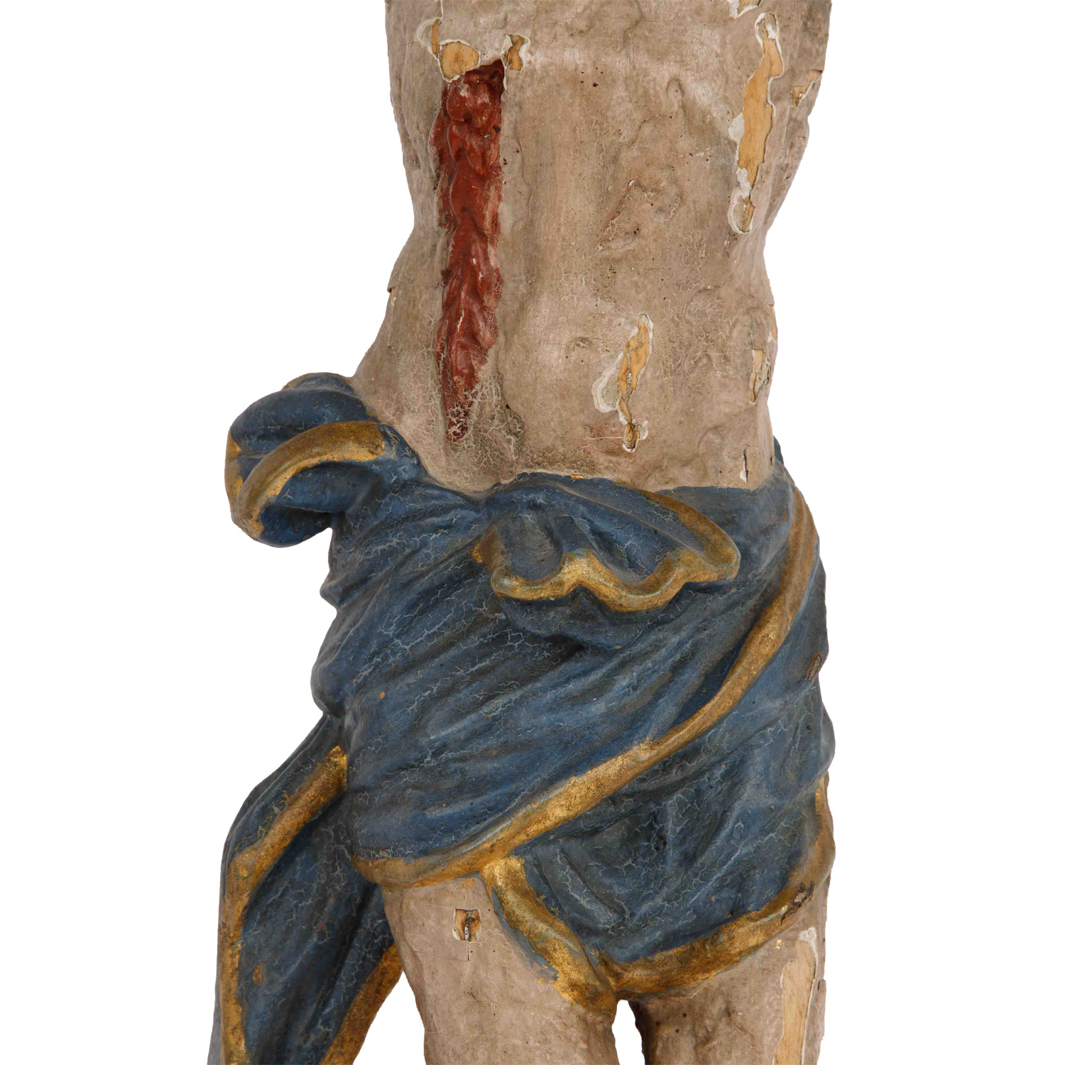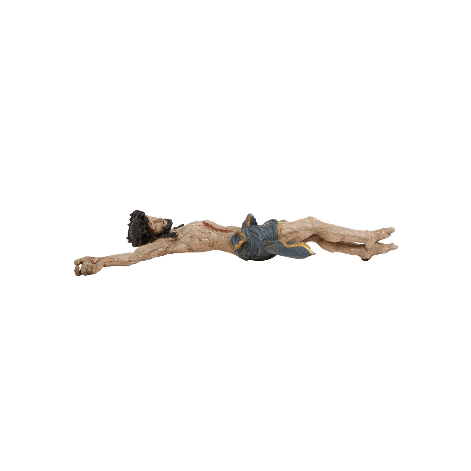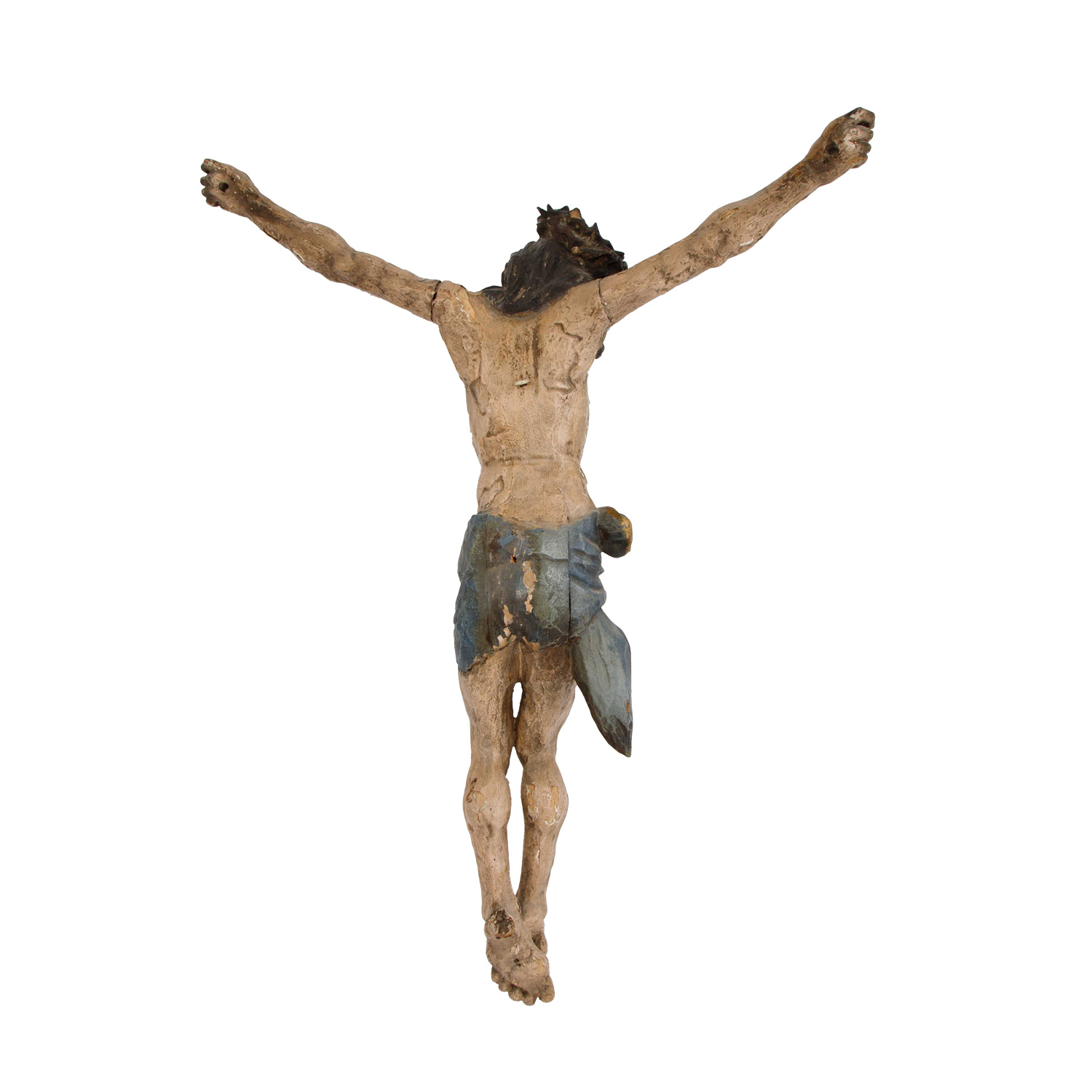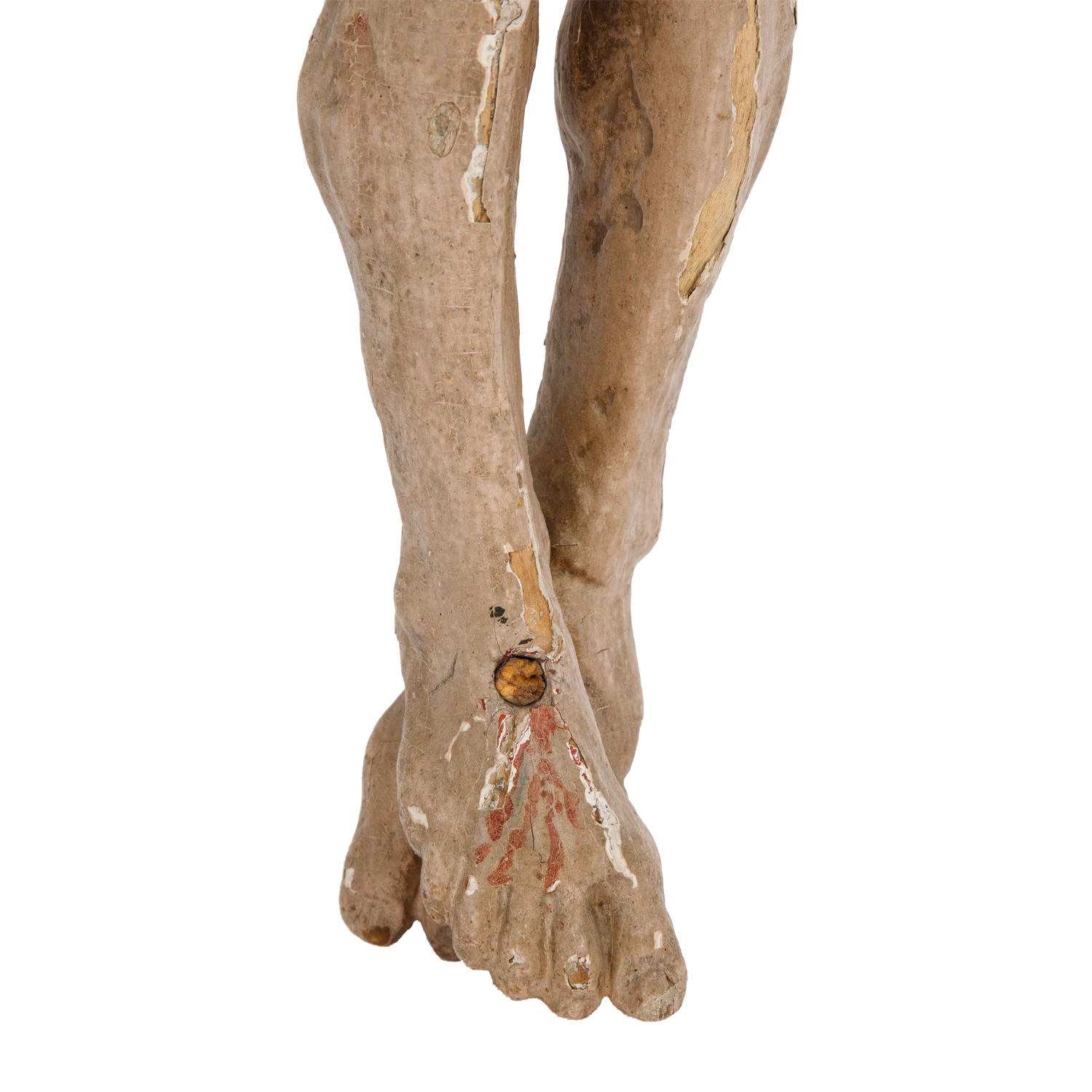 Lindenholz, farbig gefasst, vollplastische Figur des Gekreuzigten im Dreinageltypus, HxBxT: ca. 70x56x12 cm. Fassung überarbeitet und beschädigt, Nagel an den Füßen abgebrochen.