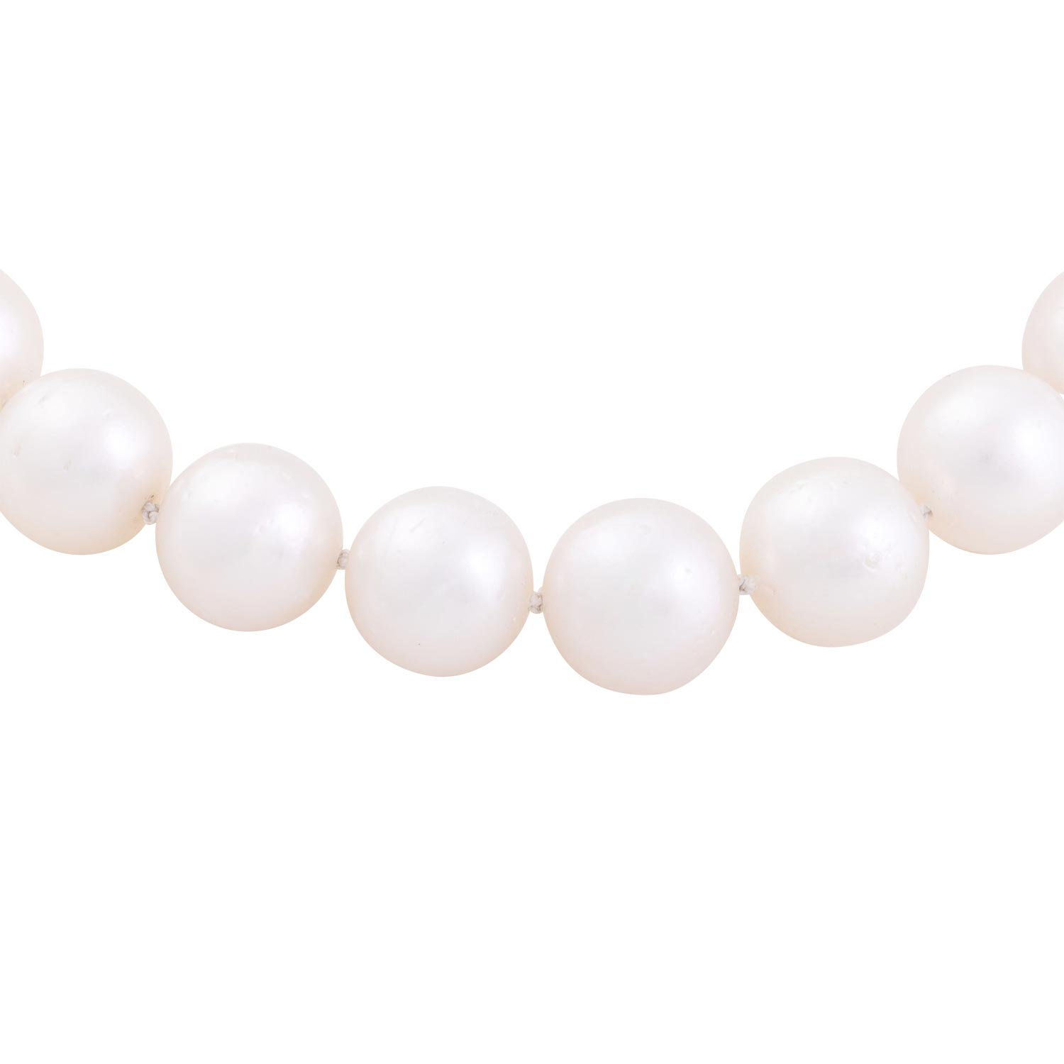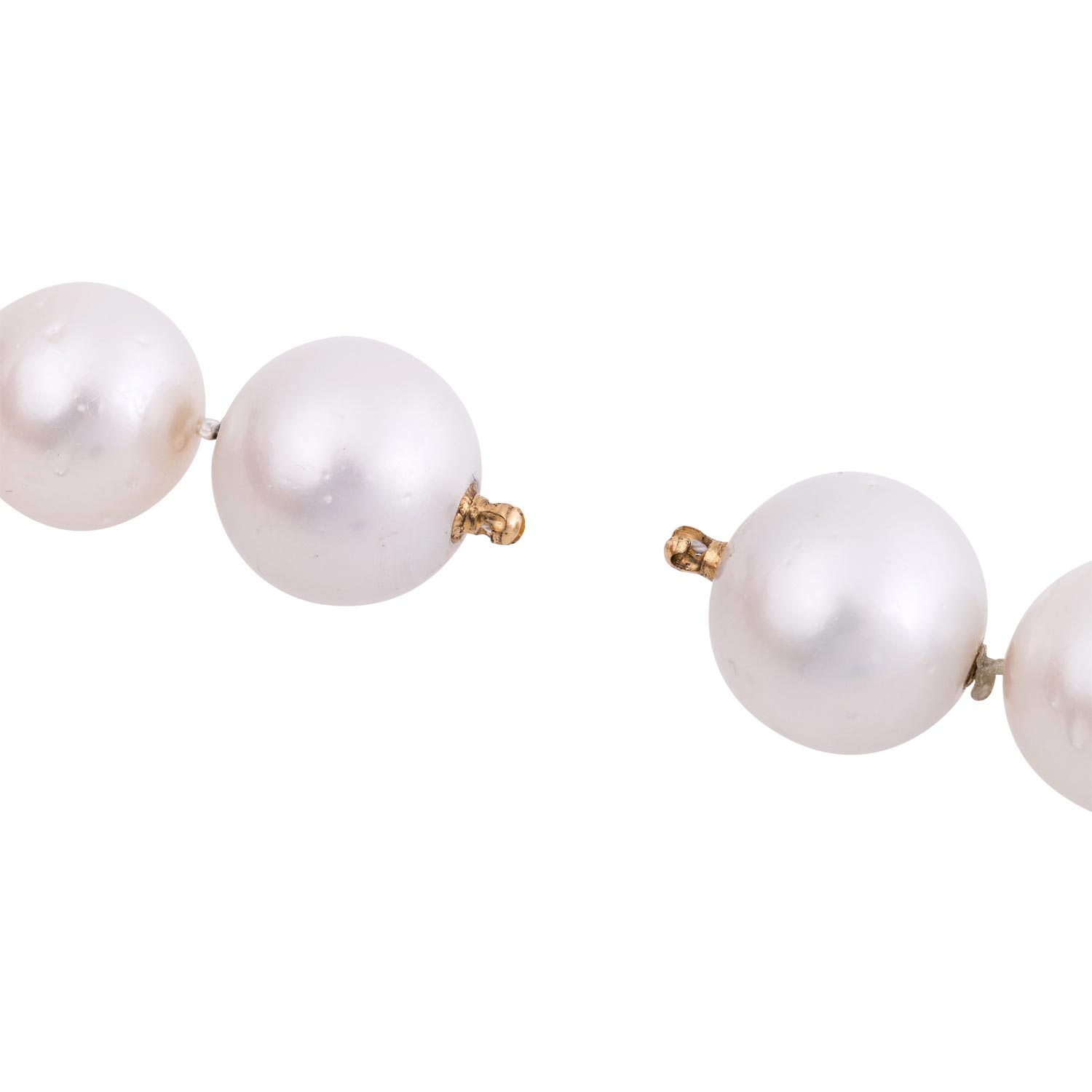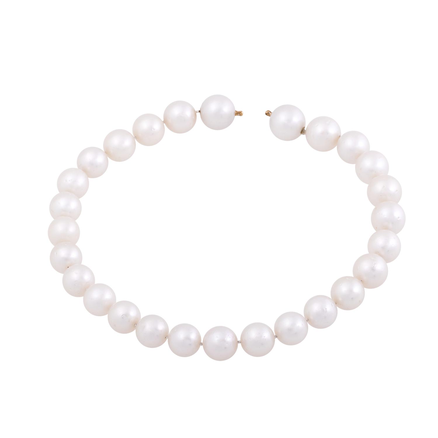 in WG 18 K. 27 weiße Perlen von ca. 13-16 mm. Feines Lüster und Oberton. Natürliche Wachstumsmerkmale.