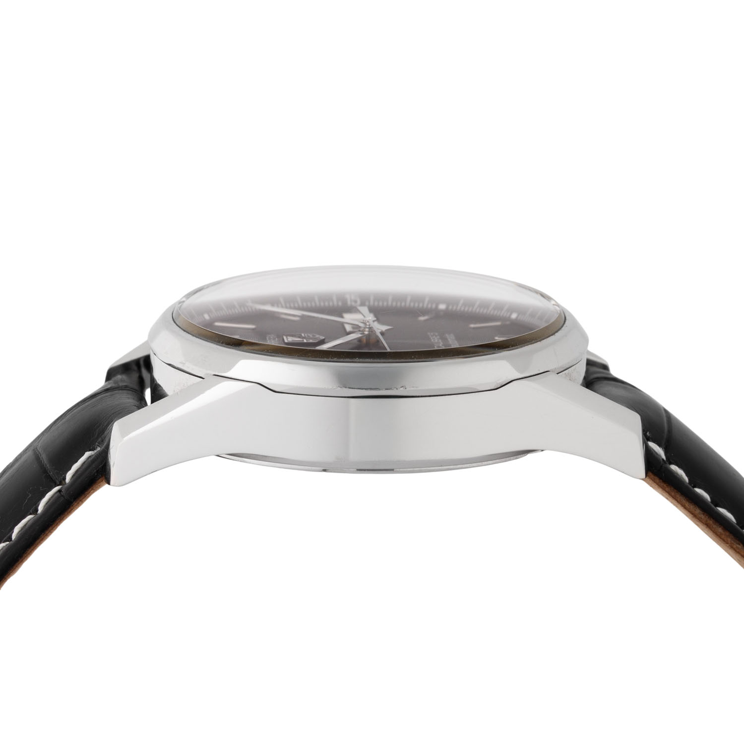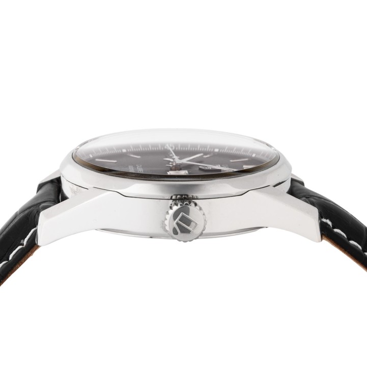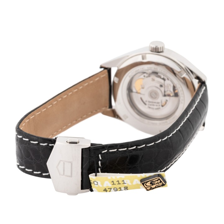 Edelstahl. Glasboden. Seriennummer 99537. Automatik Werk Kal. 5 mit sehr guten Gangwerten (+7 s/d. 301° Amplitude). Azuriertes, Schwarzes Zifferblatt mit aufgesetzten Indizes und Anzeige von Wochentag und Datum. Neues Lederband mit der originalen Tag Heuer Faltschließe azus Edelstahl. Guter Zustand mit Tragespuren. Original Box, Lieferschein, Rechnung und Zertifikat (Karte) von einem Gebrauchtkauf im August 2023 anbei. Durchmesser ca. 41 mm (gemessen ohne Krone). Passend bis zu ca. 21,5 cm Handgelenkumfang.