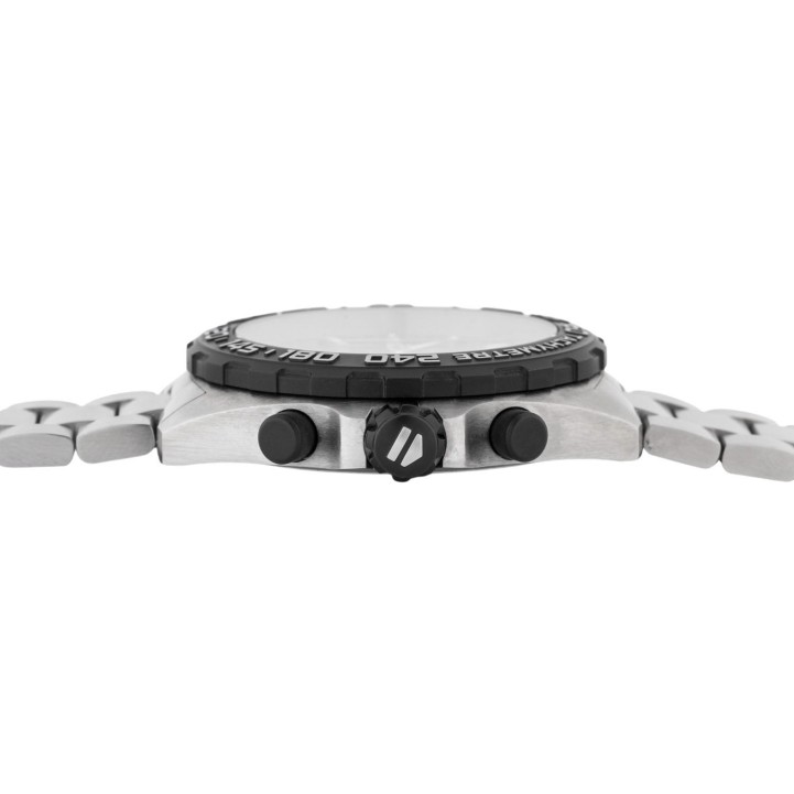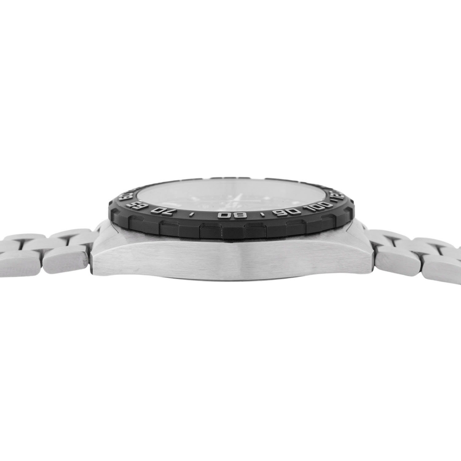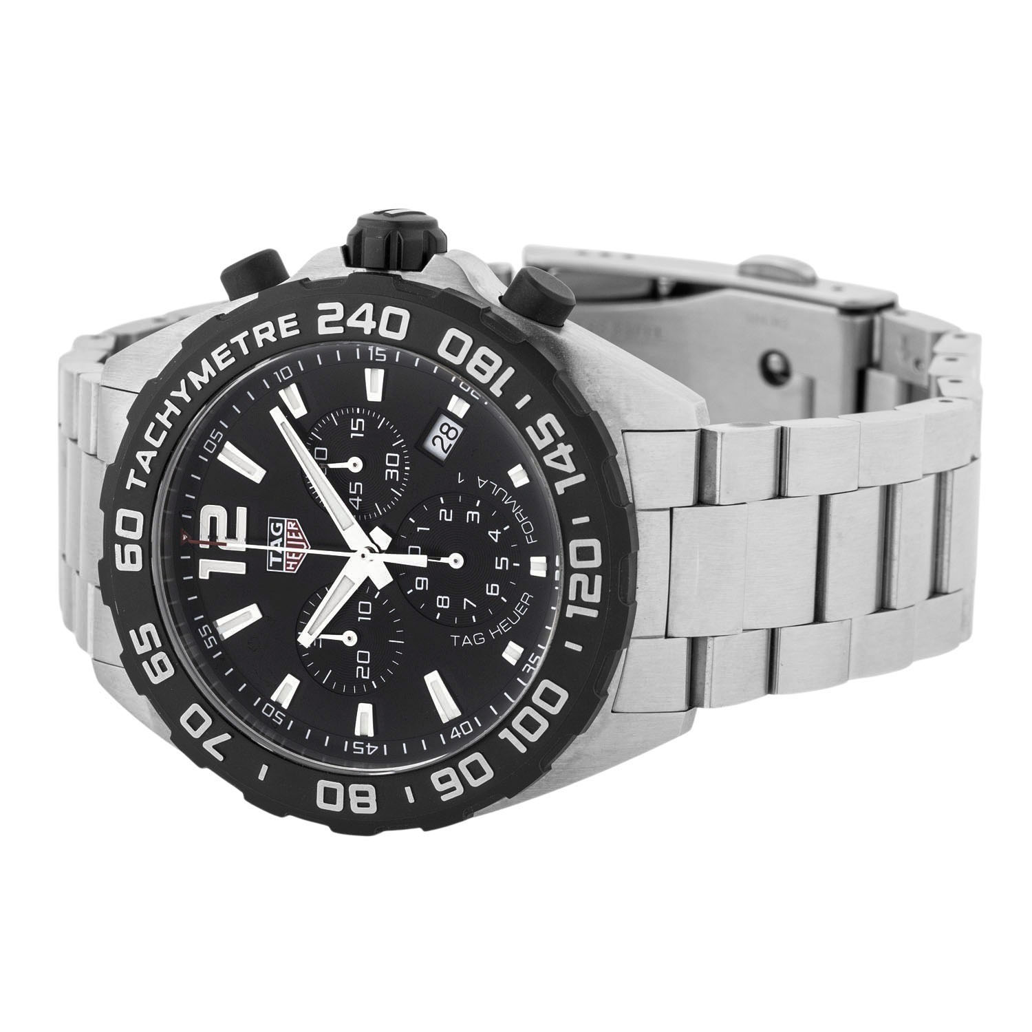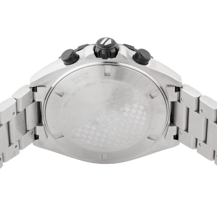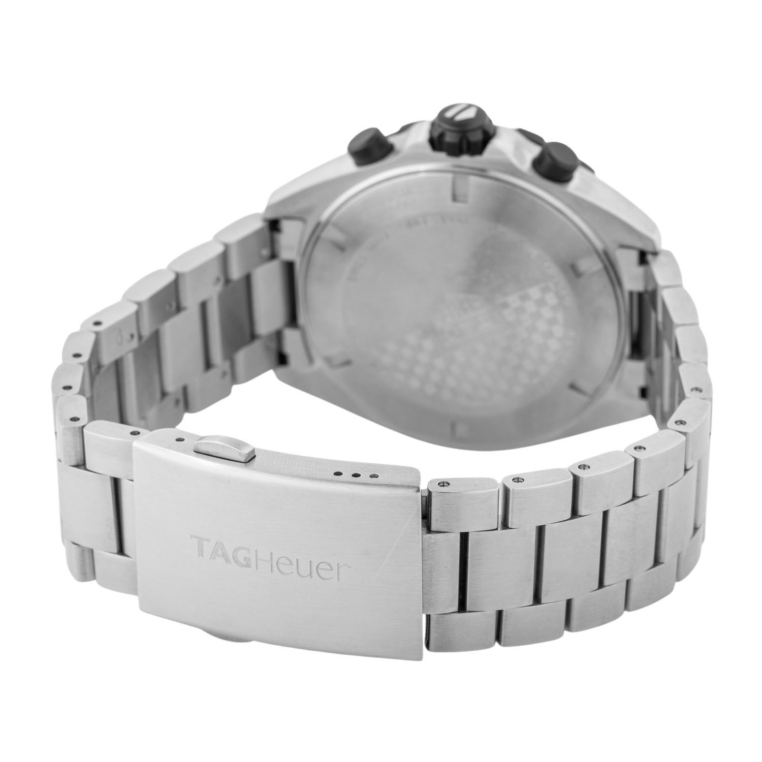 Edelstahl. Seriennummer WTZ6408. Quarzwerk in funktionsfähigem Zustand. Neue Batterie. Schwarzes Zifferblatt mit aufgesetzten Indizes, 3 Totalisatoren, kleiner Sekunde und Datumsanzeige bei 4 Uhr. Tachymeter Lünette. Guter Zustand mit leichten Tragespuren. Original Box, Anleitung, Tag Heuer Garantiekarte, Mikrofasertuch, Lieferschein, Rechnung vom April 2024 und Zertifikat (Karte) von Chronext anbei. Durchmesser ca. 43 mm (gemessen ohne Krone). Passend bis zu ca. 21,5 cm Handgelenkumfang.