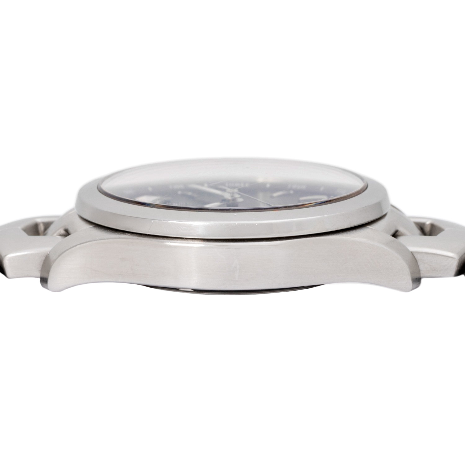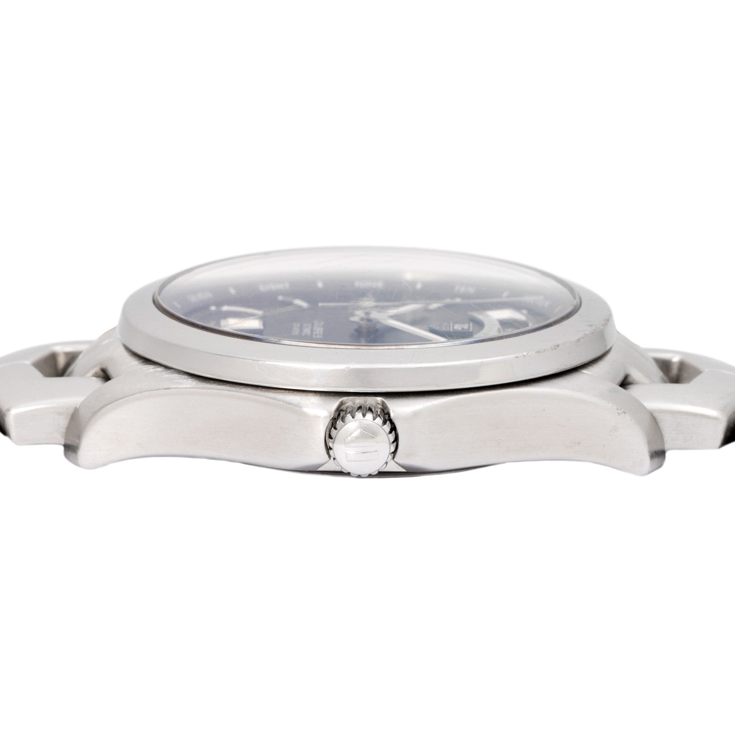 Edelstahl. Glasboden. Automatik-Werk Kal. 5 mit guten Gangwerten (+5s/d. 237°). Schwarzes Zifferblatt mit Pfeilindizes und Anzeige von Wochentag (Englisch) und Datum. Tag Heuer Edelstahl Armband mit Faltschließe. Gehäuseboden mit Schutzfolie. Gebraucht, sichtbare Tragespuren am Gehäuse, Lünette, Glas und Armband. Original Box, Anleitung, Erstkaufrechnung und Garantiekarte anbei. Gekauft im August 2008 bei Juwelier Madler in Mainz. Durchmesser ca. 40 mm (gemessen ohne Krone). Passend bis zu ca. 19,5 cm Handgelenkumfang.