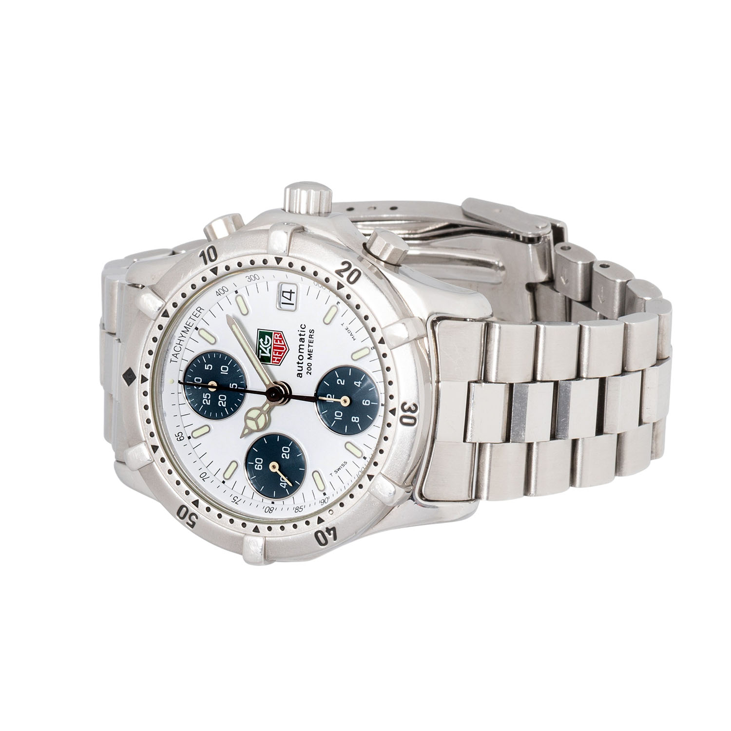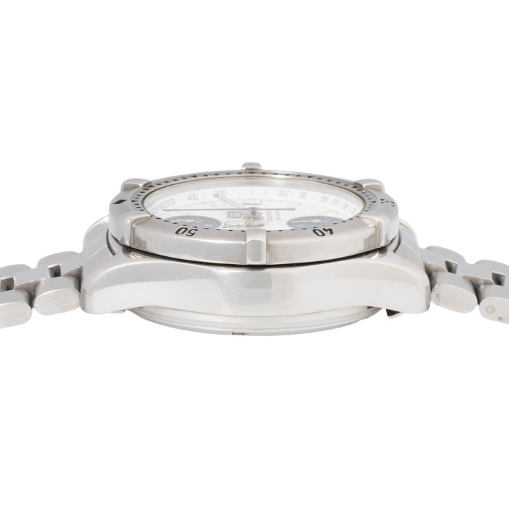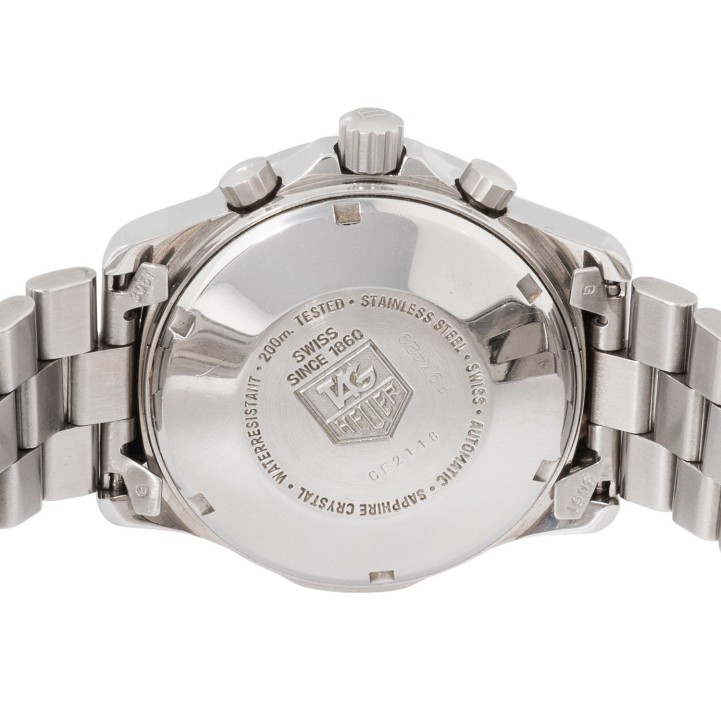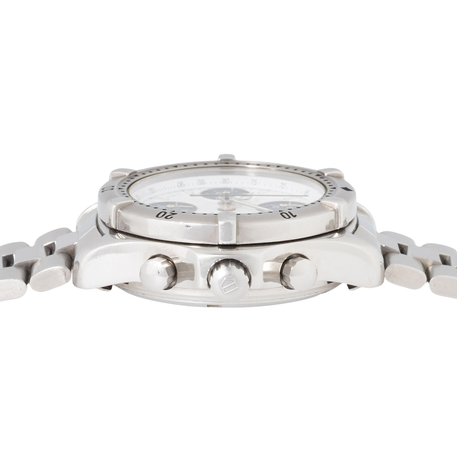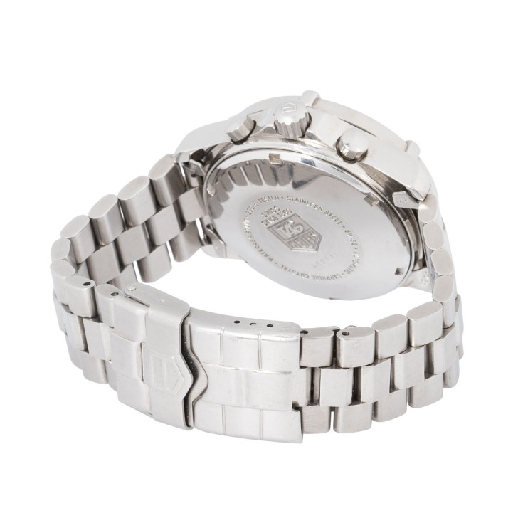 Edelstahl. Automatik-Werk Kal. ETA 7750 mit sehr guten Gangwerten (+/- 0 Sek., 271° Amplitude). Weißes Tritium Zifferblatt mit aufgesetzten Indizes, 3 Totalisatoren, kleiner Sekunde, Tachymeter Skala und Datumsanzeige. Tag Heuer Stahlband (mit Stretch) mit Faltschließe. Guter Zustand mit Tragespuren. Durchmesser ca. 38 mm, gemessen ohne Krone. Passend bis zu ca. 16 cm Handgelenksumfang.