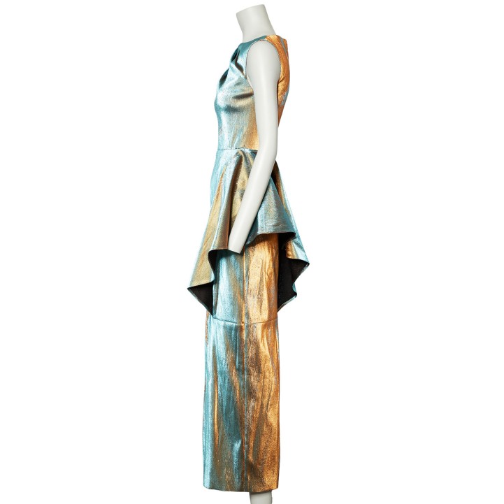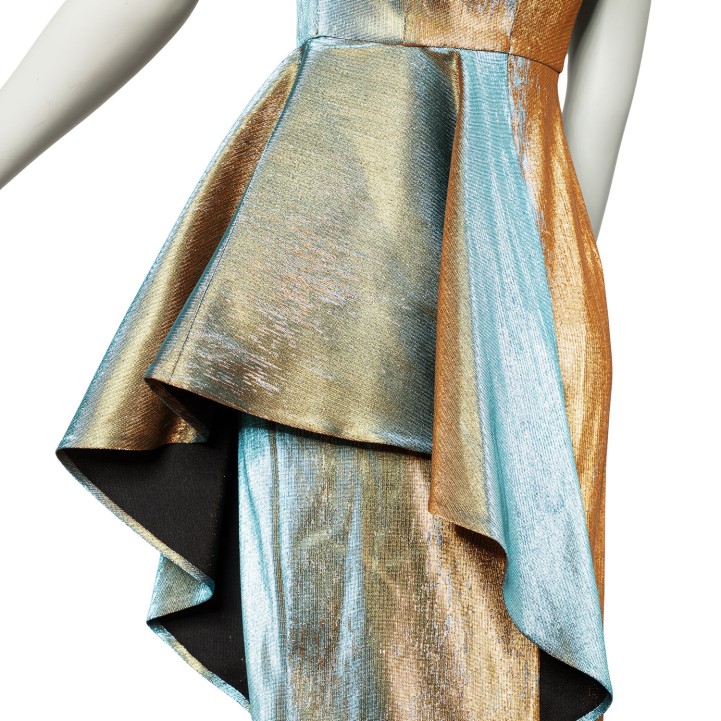 Changierendes Textil in Metallic-Blau und Orange mit dekorativem Faltendekor und Volant. In sehr gutem Erhaltungszustand.