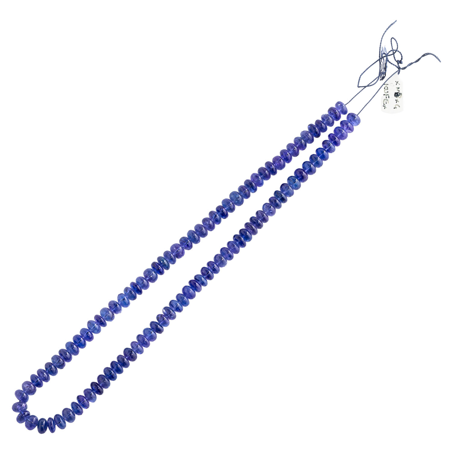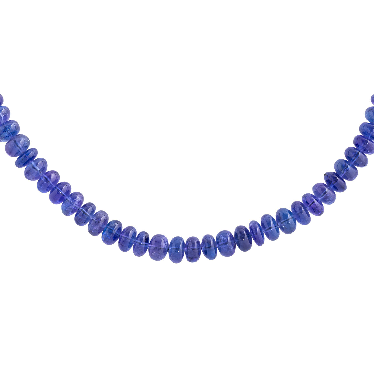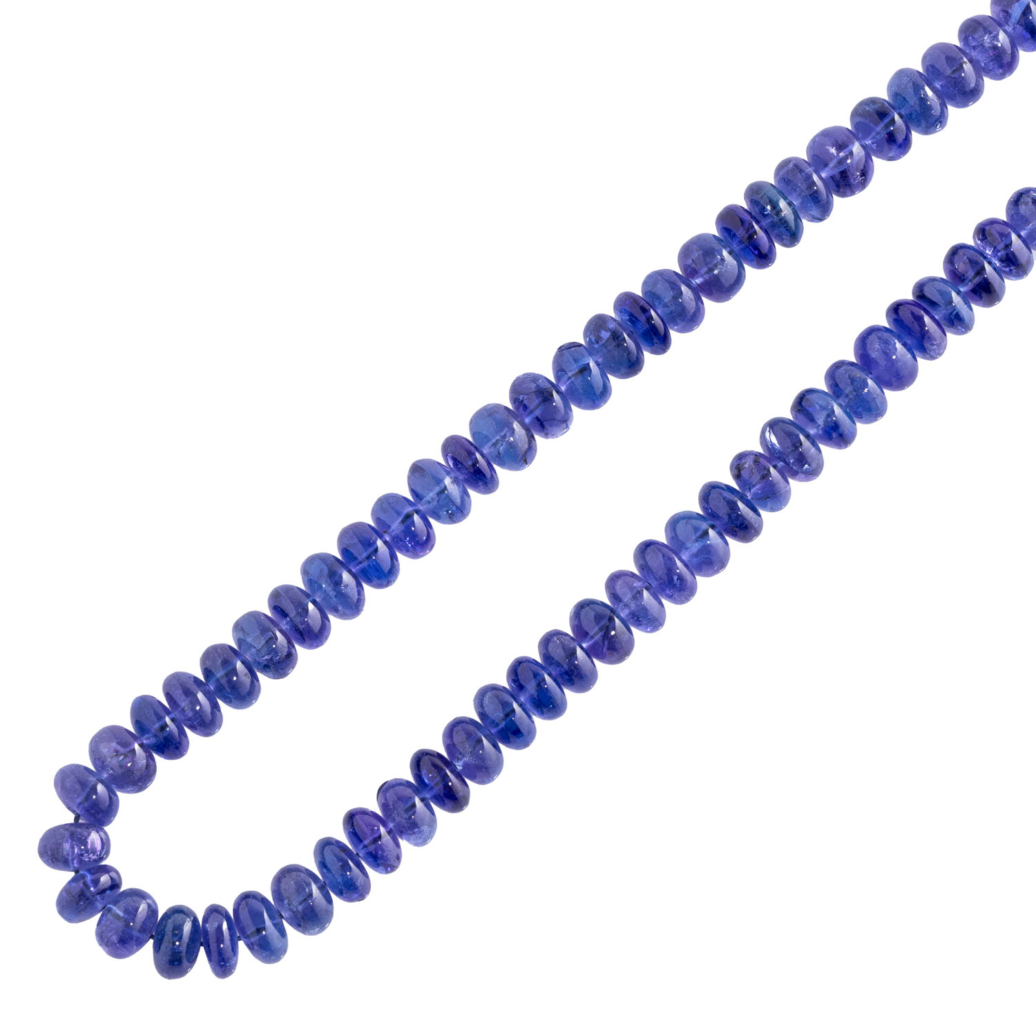 aus 97 flachen Tansanitperlen, zus. ca. 187 ct (inkl. Schnur), D: ca. 7 mm, L: ca: 43 cm, gefädelte Linie ohne Verschluss, 21. Jh., neuwertiger Zustand. Tansanite von intensiver blau-violetter Farbe mit leichter Variation und unterschiedlicher Ausformungen.