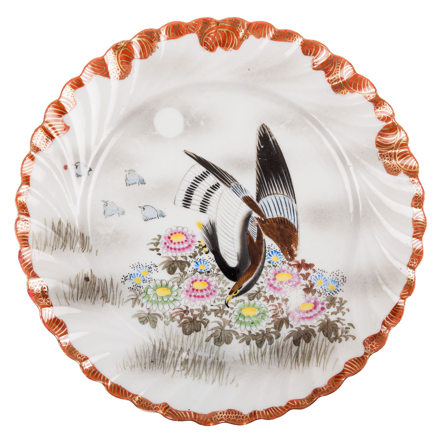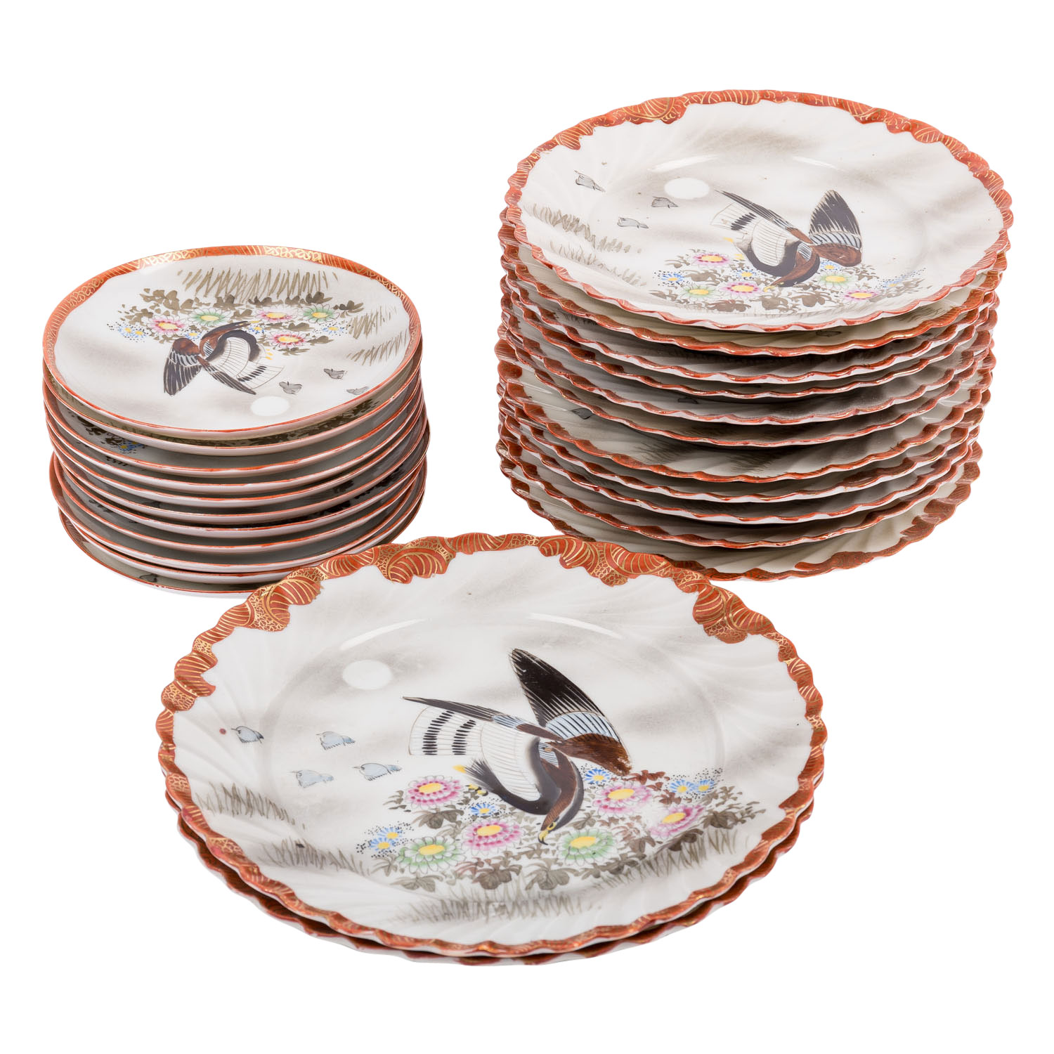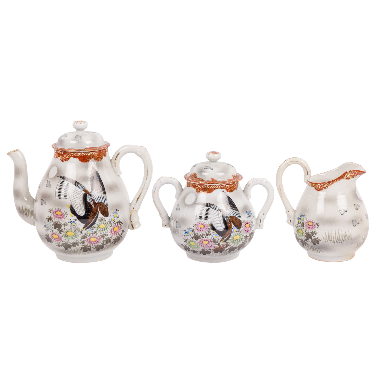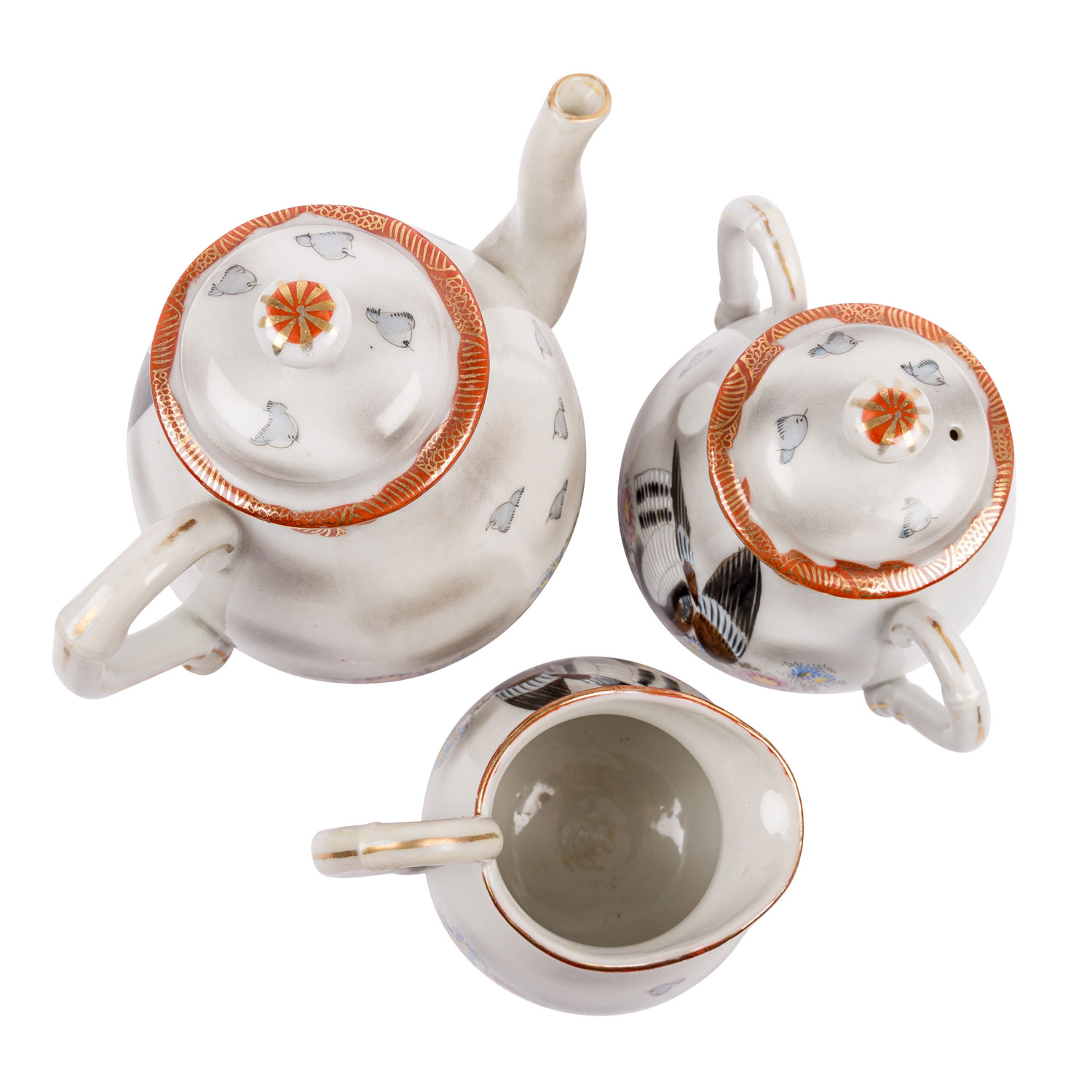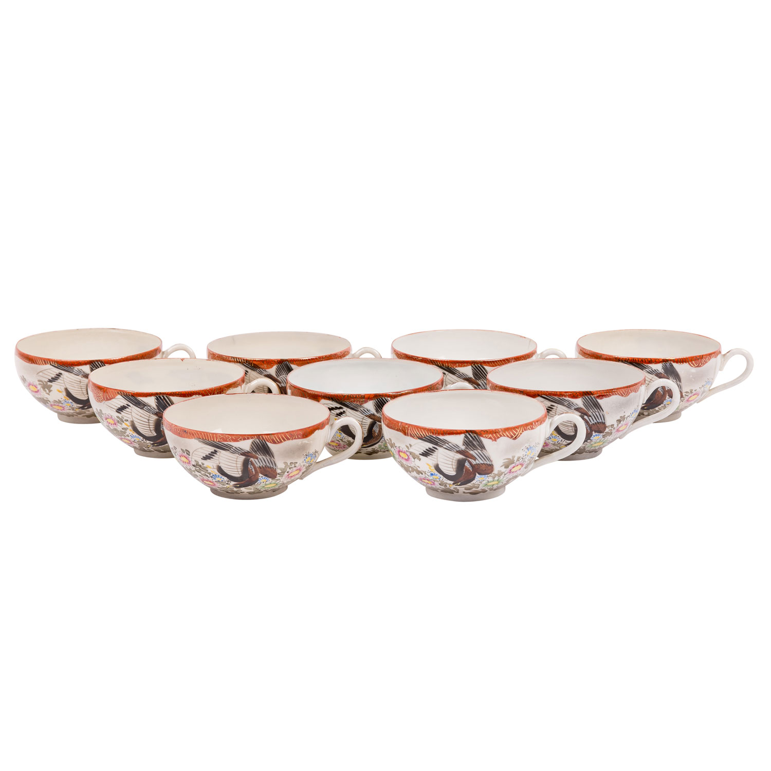 Bemalt im Kutani-Stil. Jedes Teil ist mit einem eisenroten Rand verziert und mit dem Hauptmotiv eines jagenden Adlers im Anflug über bunten Blumen bemalt. Bestehend aus: 1 Teekanne, 1 Sahnekännchen, 9 Tassen mit 11 Untertassen, 11 Tellern, 2 Gebäcktellern. Tlw. min.besch. Erworben im Jahr 1907 in Tokyo.