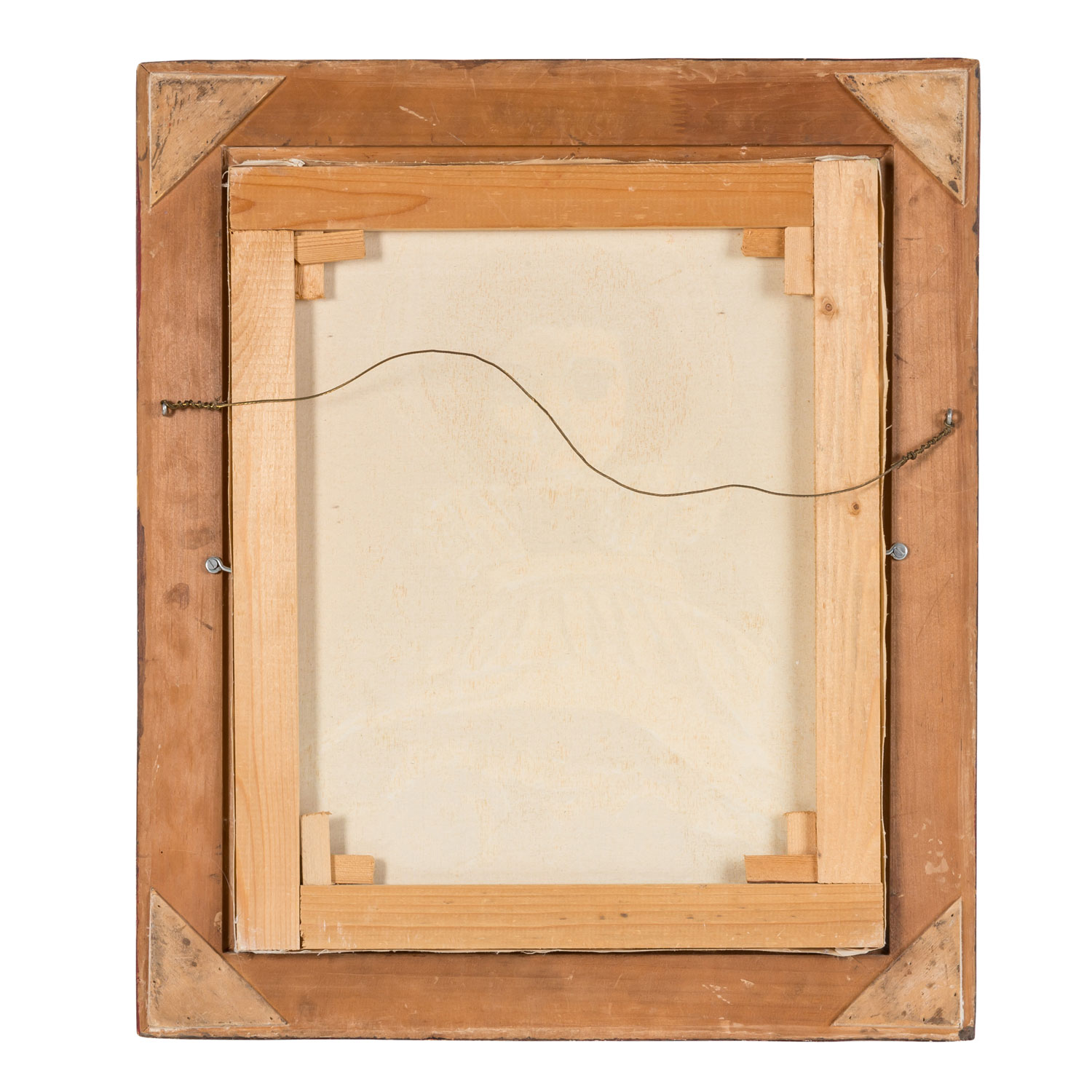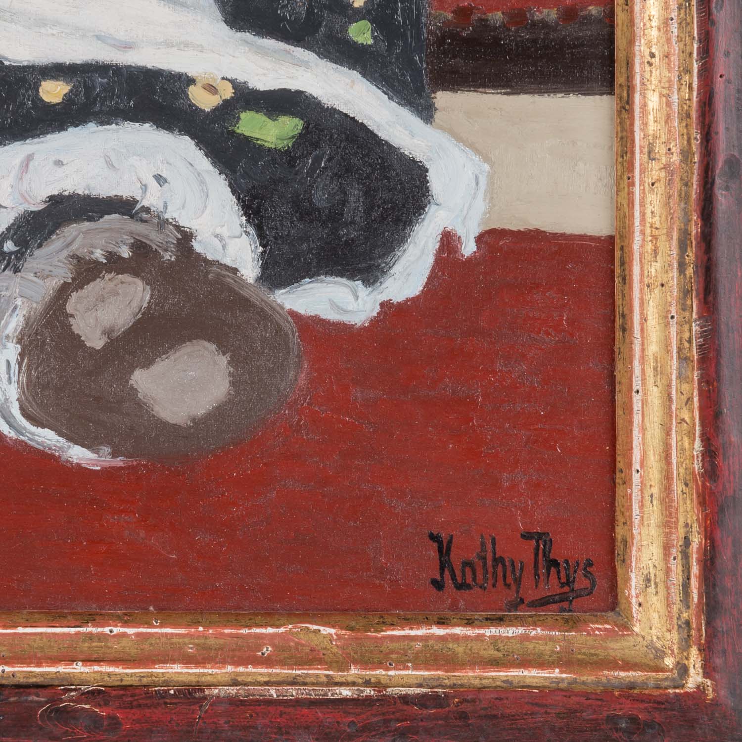 unten rechts signiert: 'Kathy Thys'. Öl auf Leinwand, HxB: ca. 38 x 46 cm (HxB Rahmen: ca. 57,5 x 49 cm). Alters- und Beriebsspuren. Mit Rahmen (Leichte Beschädigungen).