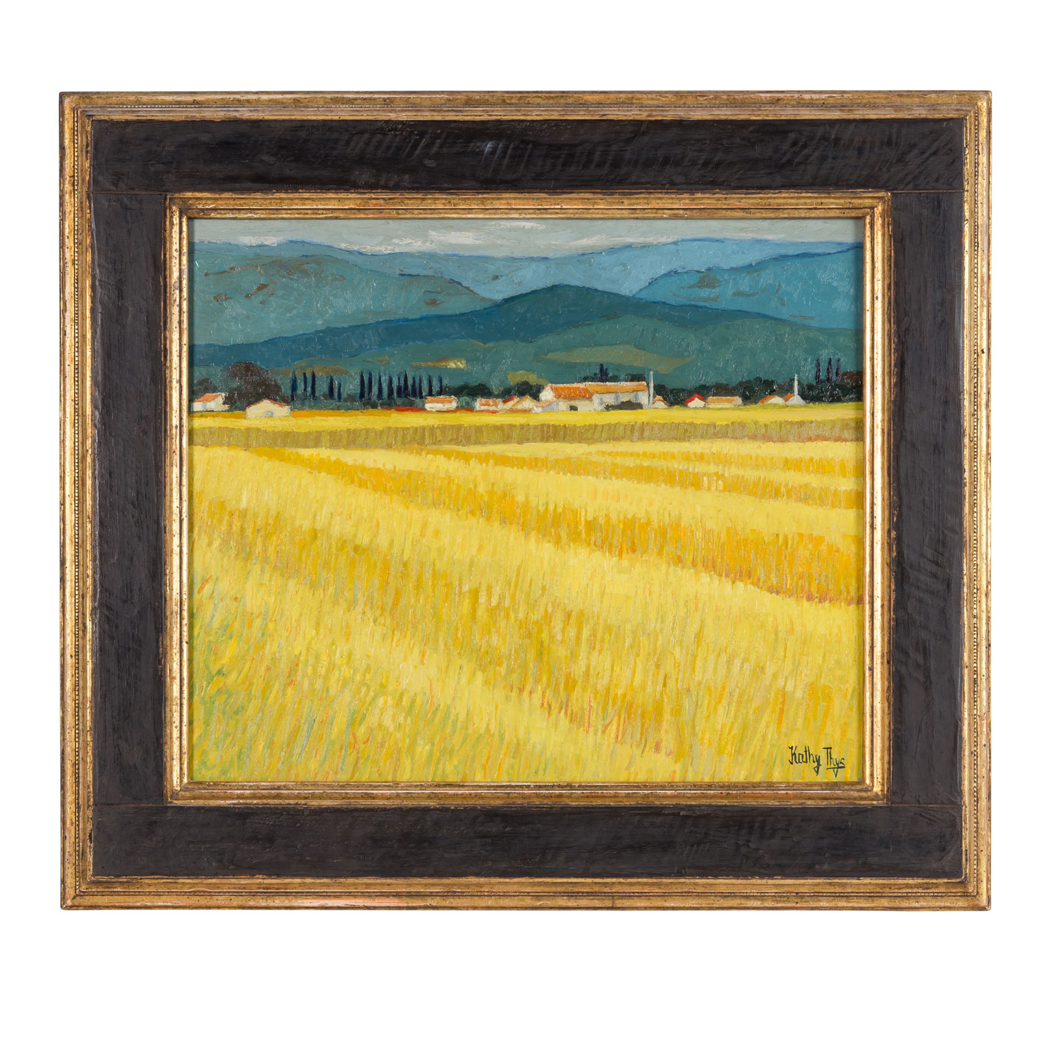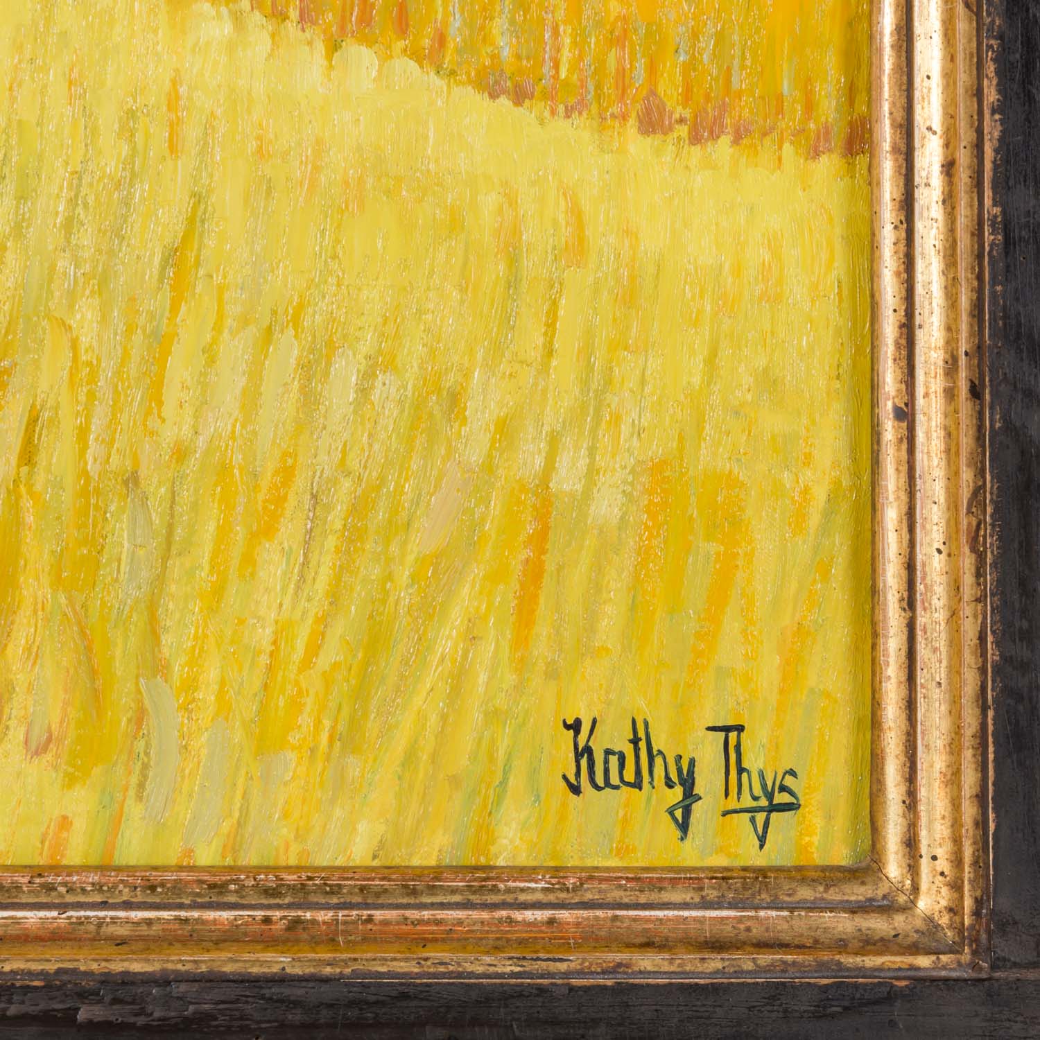 unten rechts signiert: 'Kathy Thys'. Öl auf Leinwand, HxB: ca. 46 x 55 cm (HxB Rahmen: ca. 66 x 75 cm). Alters- und Beriebsspuren. Mit Rahmen (Altersspuren).