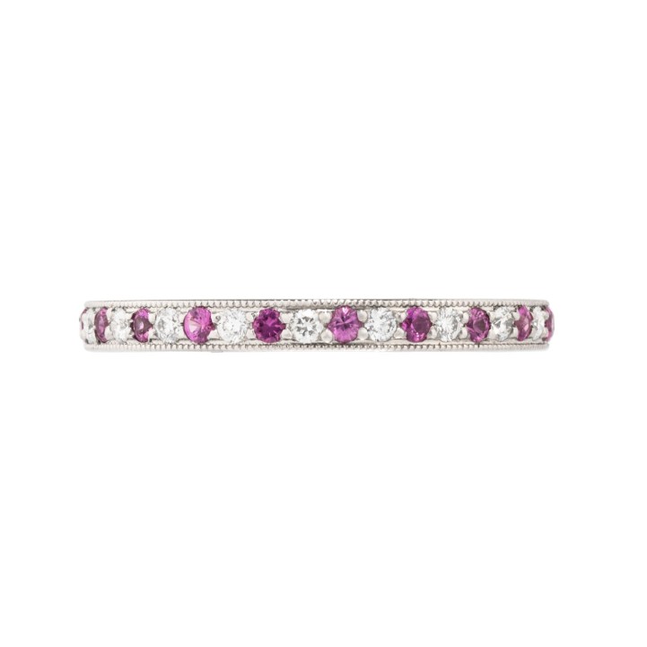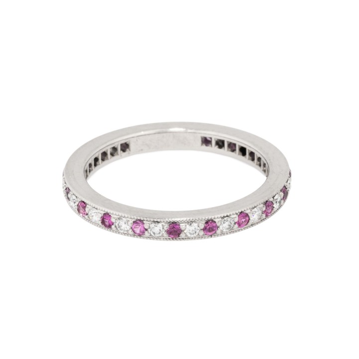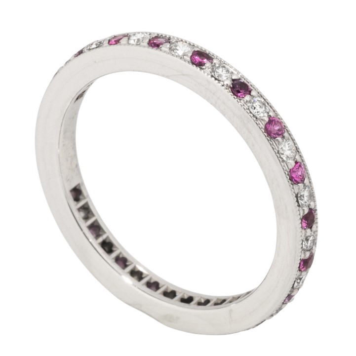 zus. ca. 0,4 ct, sehr gute Farbe und Reinheit, Rubine zus. ca. 0,5 ct, Platin 950, 3,9 g, RW: 52, Kauf in 2014, Tragespuren, graviert 'TIFFANY & Co', mit Kaufbeleg 3.100 CHF, Etui und Box.