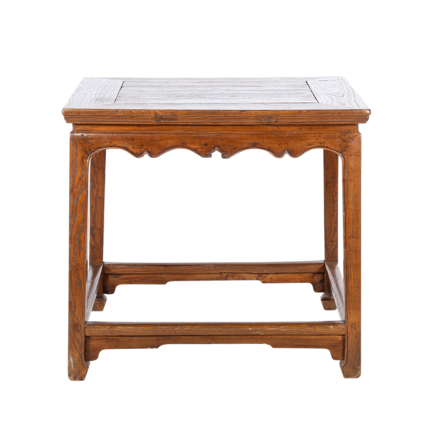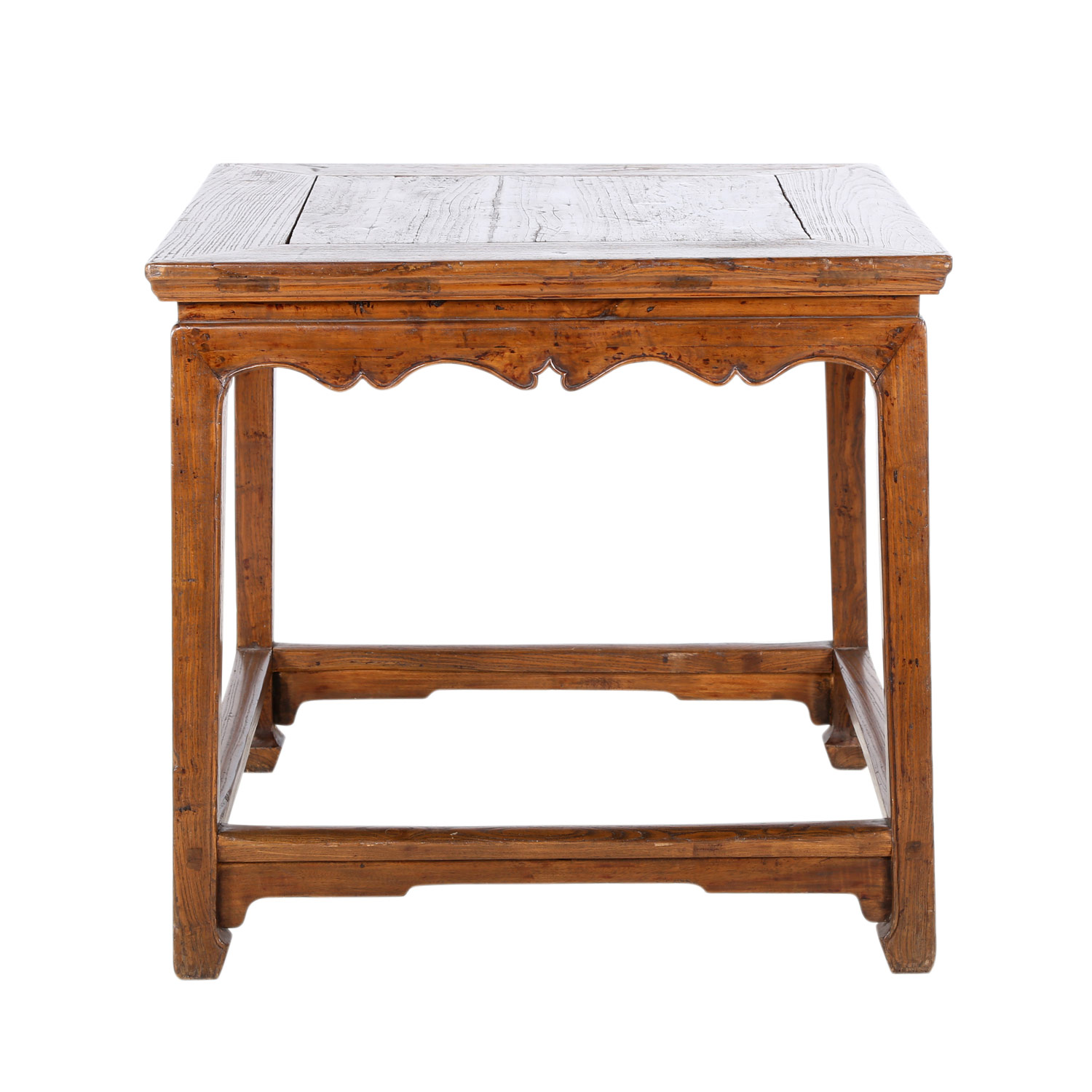 Tisch.CHINA. Anfang 20. Jh.. Hartholz, auf vier Vierkantbeinen, die mit Streben verbunden sind. Die Füßchen sind nach innen gebogen, Tischplatte in Rahmen mit abgerundeten Seiten und eingezogener Taille, H 86xB 92xT 95 cm. Rest...