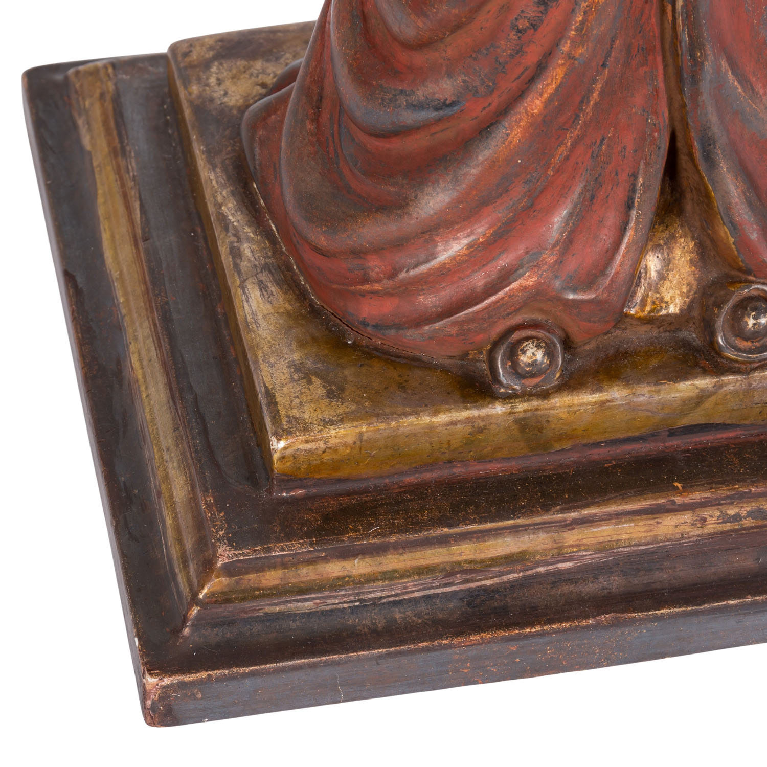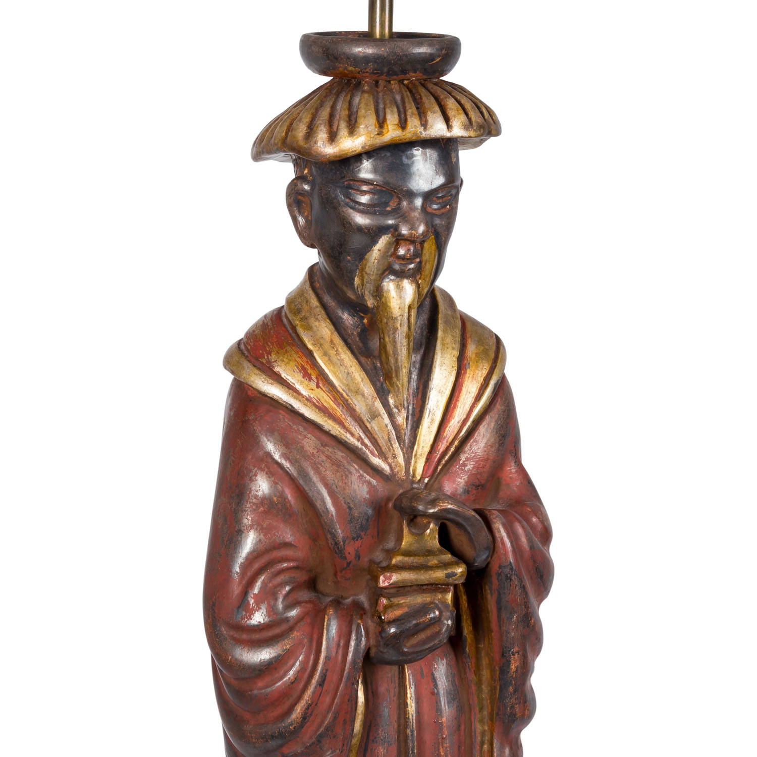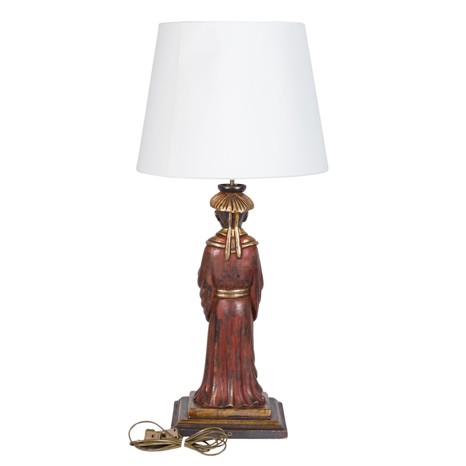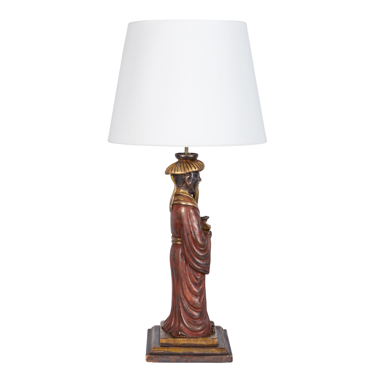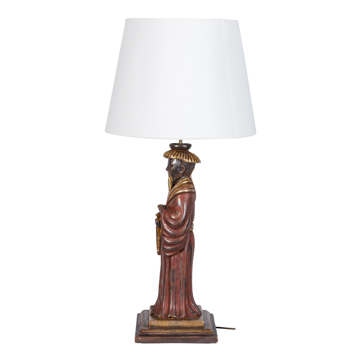 Lampenfuß in Form eines vollplastisch ausgearbeiteten chinesischen Gelehrten, der auf einem quadratischen, getreppten Sockel steht. Mit dabei: weisser, nicht originaler Lampenschirm, H gesamt: ca. 89 cm. Gebrauchsspuren, besch.