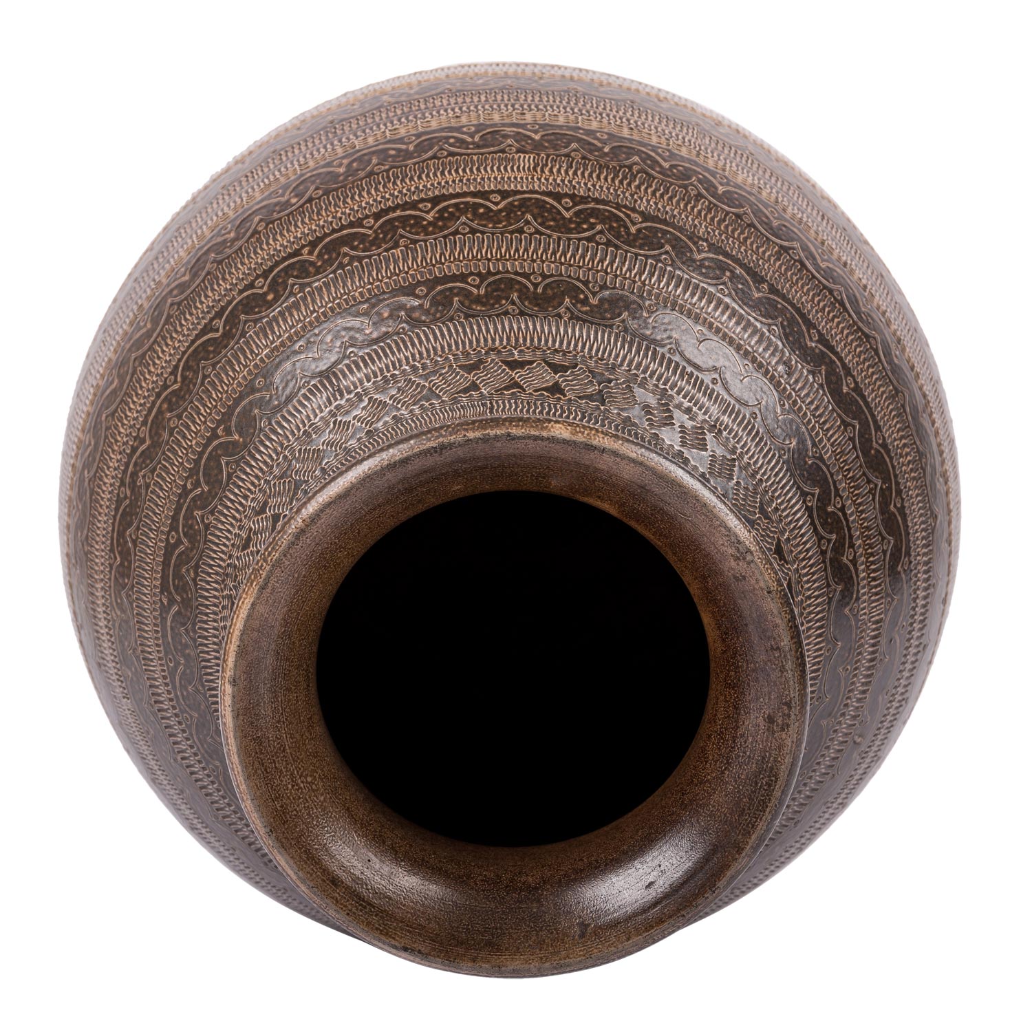 Heller Scherben braun glasiert, mit umlaufenden ornamentalen Musterbändern, unterseitig bezeichnet, H. ca. 44,5 cm. Gut erhalten.