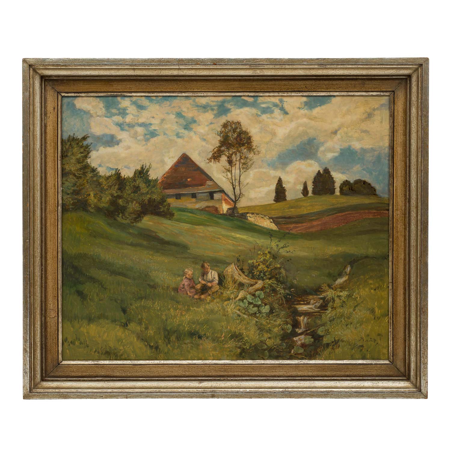 TRAUB, GUSTAV (1885-1955), "On the mountain", children playing in the meadow by the brook, in the background a homestead, signed, titled verso, inscribed and dated 'Munich 1947', oil / painting board, HxW: ca. 50 x 60 cm (61 x 72 cm with frame). Some patches and light varnish gilb. With frame. Signs of age.