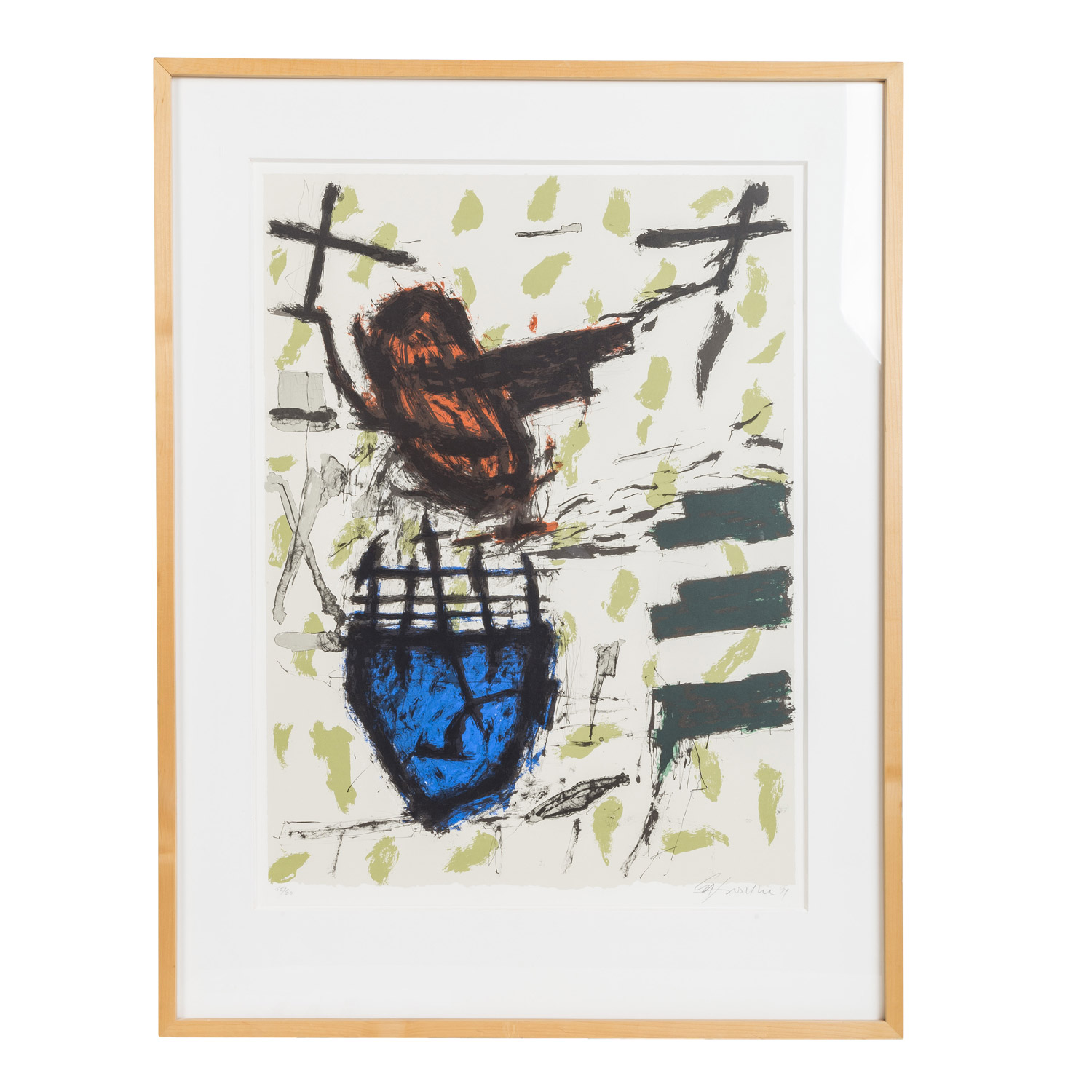 TROSCHKE, WOLFGANG (geb. 1947), "ohne Titel", abstrakte Komposition vor grüntonigen Flecken, Lithographie und Siebdruck/Papier, u.li. mit Bleistift num. 55/60, u.re. mit Bleistift von Hand signiert und datiert (19)94, u.li. Trockenstempel 'Printed by Atelier, limited, ...' (tlw. vom Passepartout verdeckt), HxB: Platte ca. 74x55 cm, Passepartoutausschnitt ca. 78x58 cm, Außenmaße Rahmen ca. 102x78 cm. Im Passepartout hinter Glas gerahmt. Minim. Altersspuren.