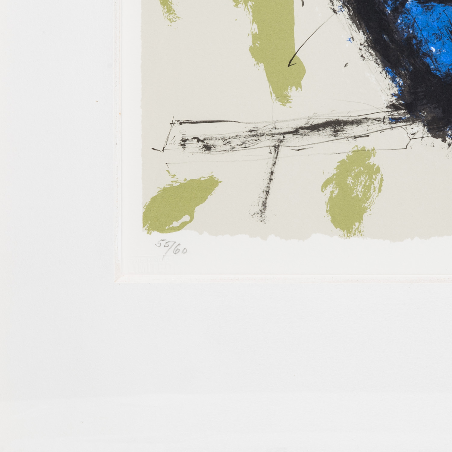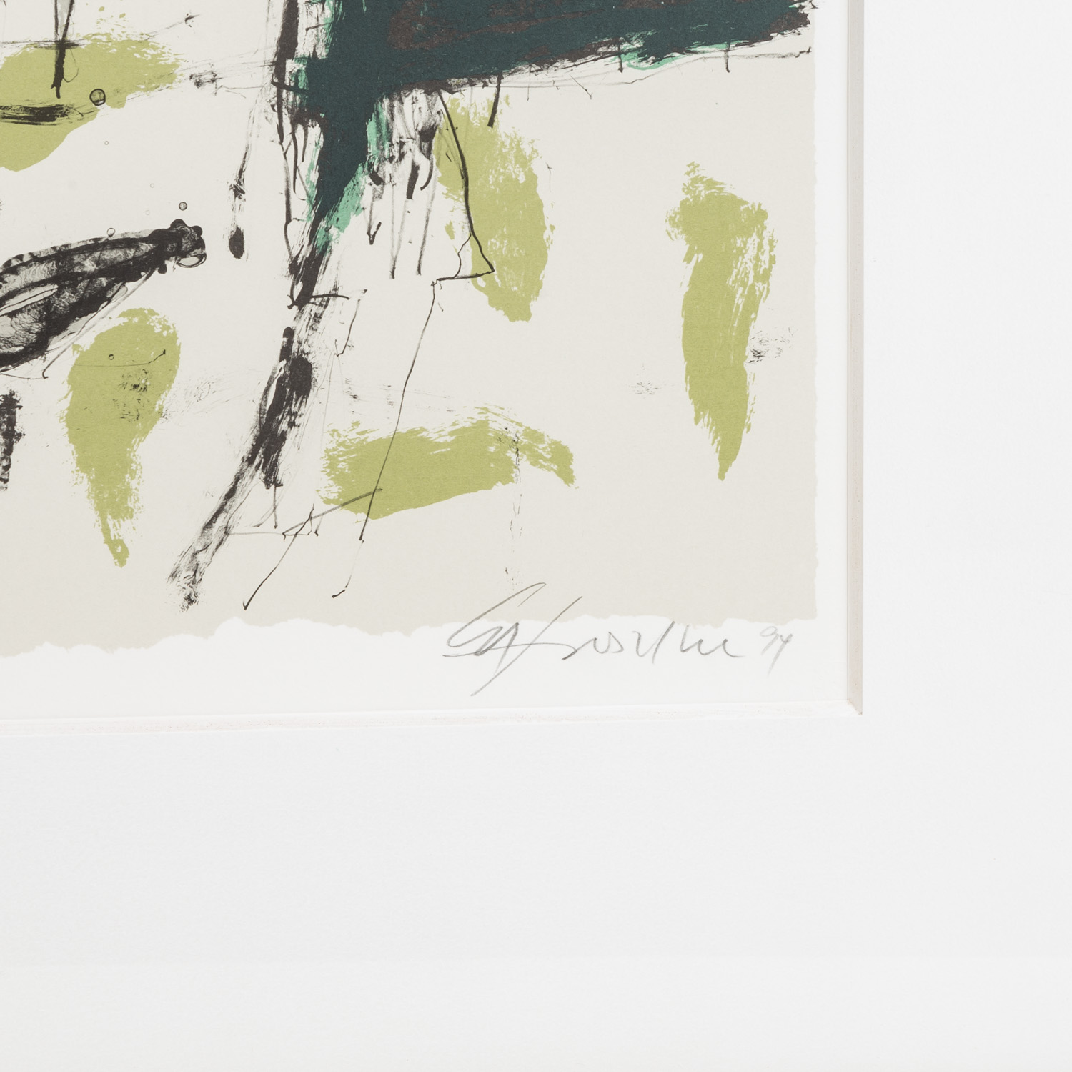 TROSCHKE, WOLFGANG (born 1947), "untitled", abstract composition in front of green tones, lithography and screen printing / paper, in pencil num. 55/60, signed and dated in pencil by hand (19) 94, Dry stamp 'Printed by Atelier, limited, ...' (partially covered by passe-partout), HxW: plate approx. 74x55 cm, passe-partout cutout approx. 78x58 cm, external dimensions frame approx. 102x78 cm. Framed in a mat behind glass. Minim. Signs of age.