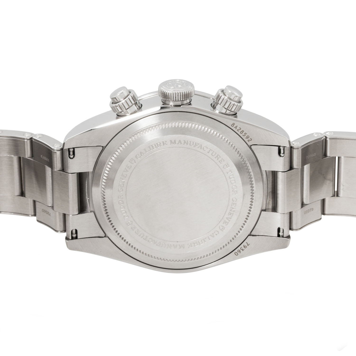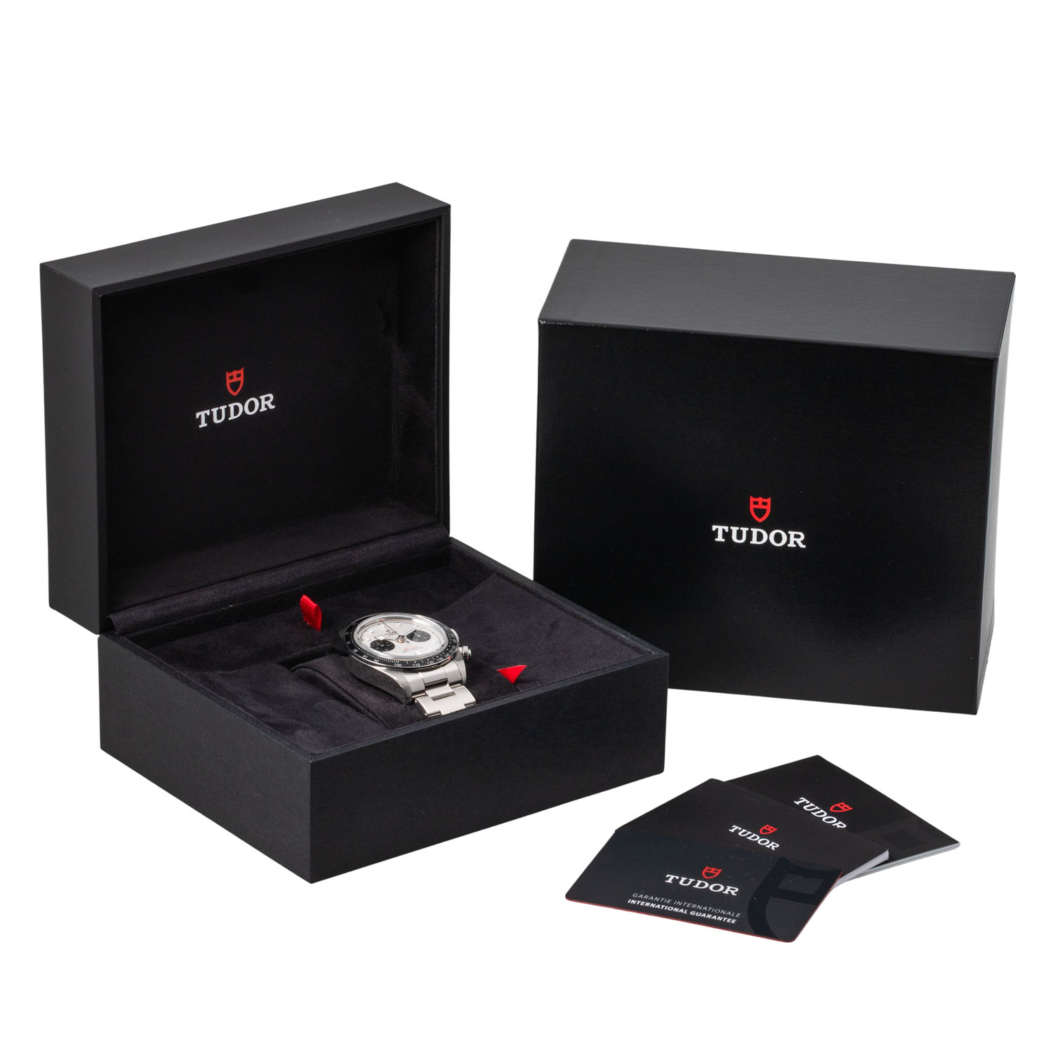 Edelstahl. Seriennummer 8A28592. Automatik-Werk Kal. MT5813 mit sehr guten Gangwerten (+1 s/d, 281° Amplitude). Weißes Panda Zifferblatt mit aufgesetzten Indizes, 2 Totalisatoren und Datumsanzeige bei 6 Uhr. Tachymeter Lünette. Tudor Oyster Armband mit Faltschließe. Neuwertiger / ungetragener Zustand mit minimalen Handlingspuren. Original Box, Anleitung, Garantieheft und Garantiekarte vom Kauf im Dezember 2022 anbei. Durchmesser ca. 41 mm gemessen ohne Krone. Passend bis zu einem Handgelenksumfang von ca. 21,5 cm.