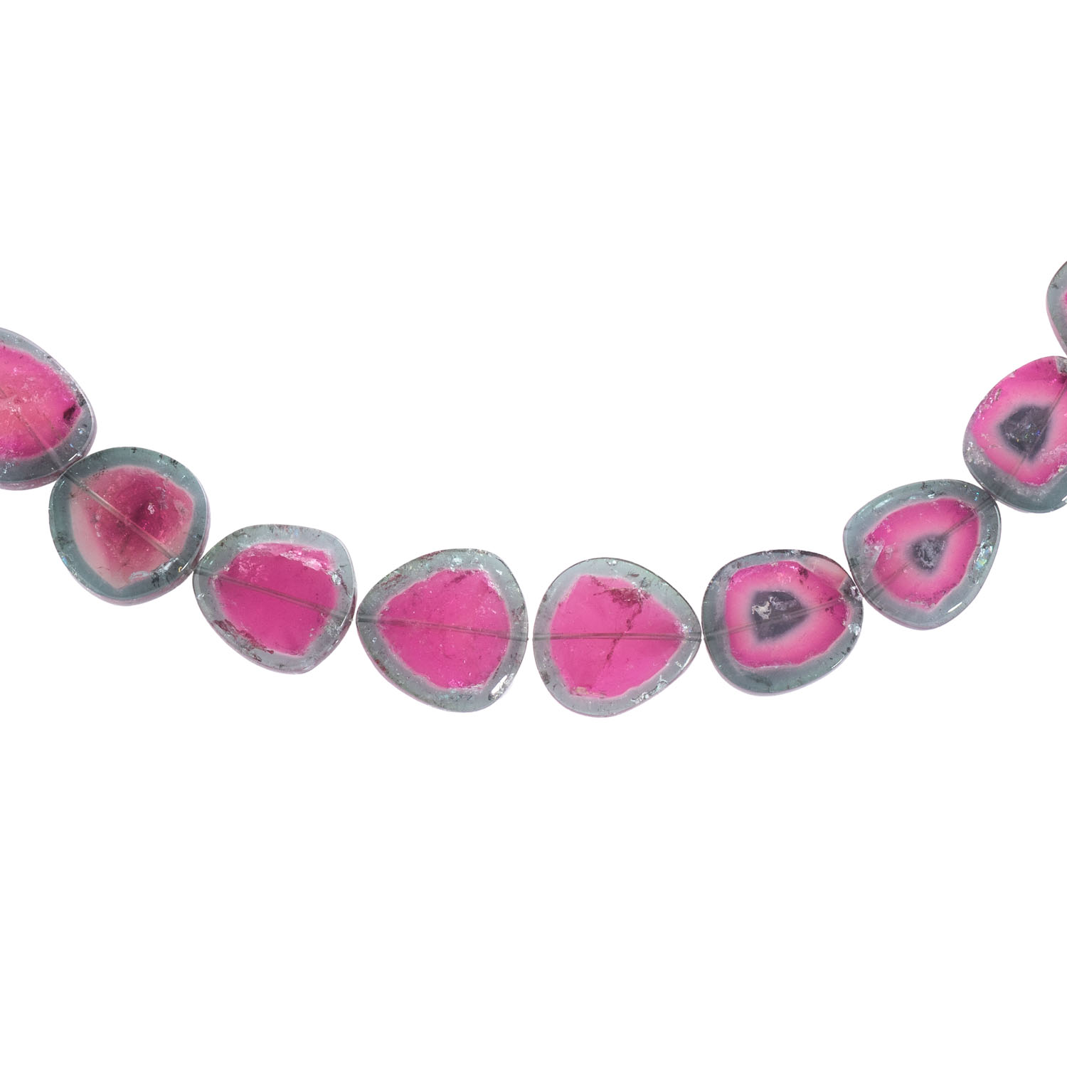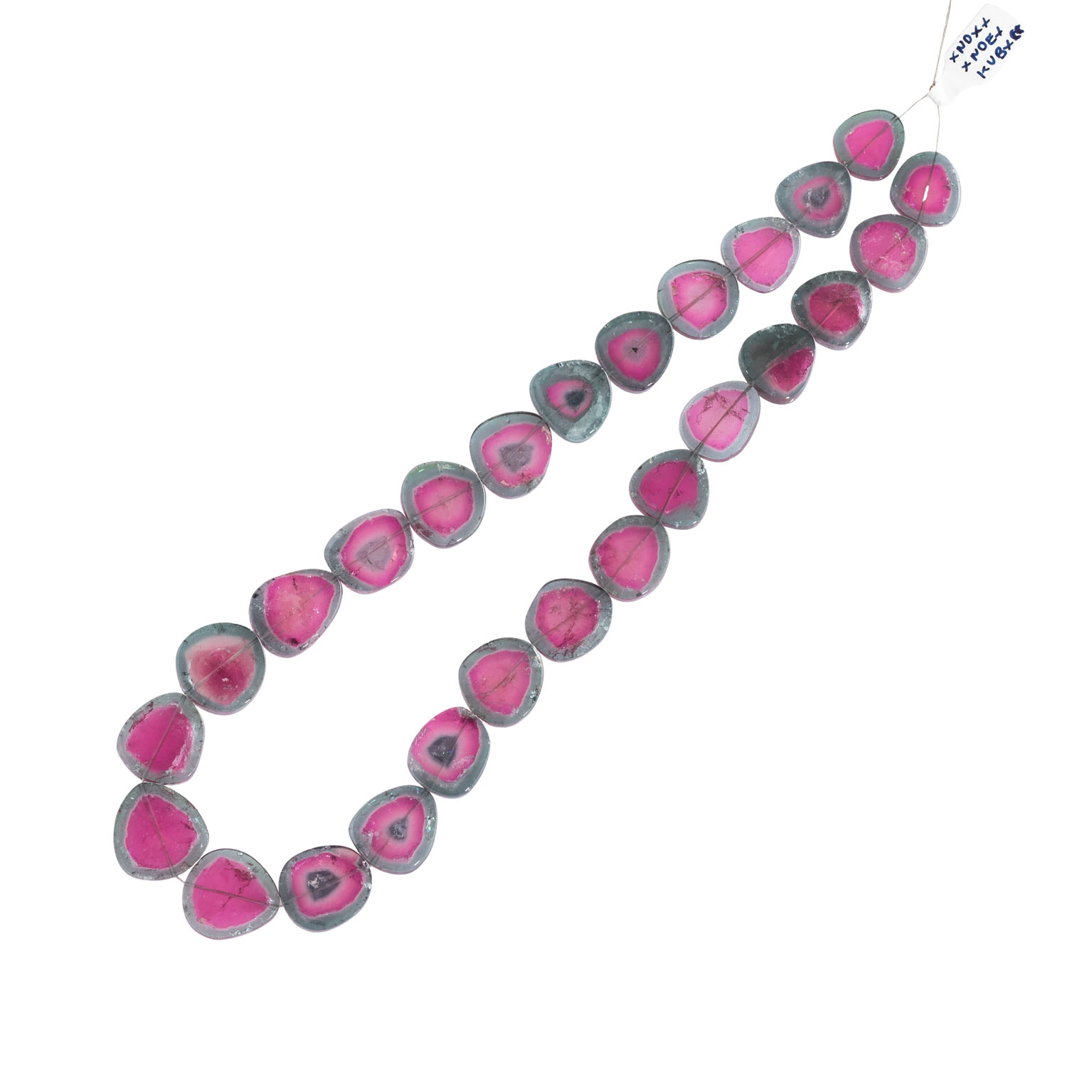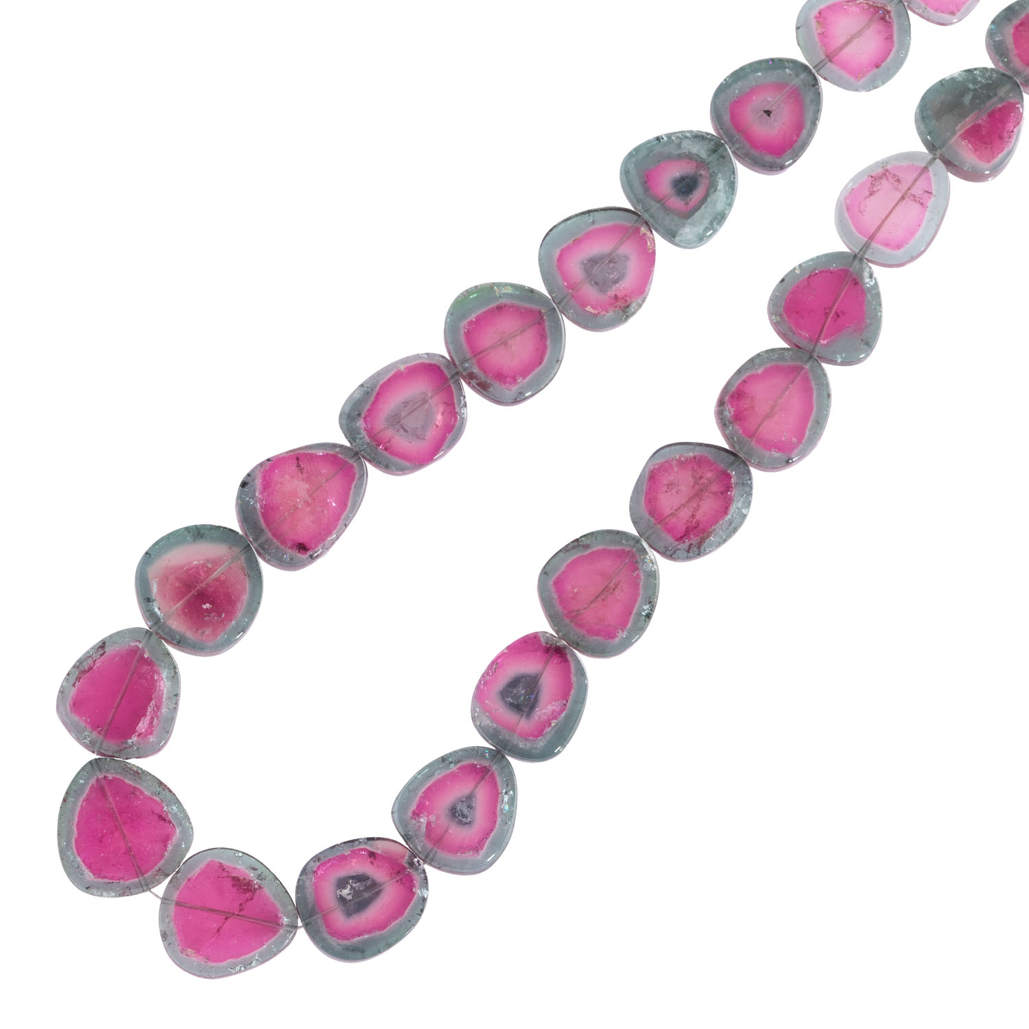 aus 26 polierten Turmalinscheiben, zus. ca. 271 ct (inkl. Schnur), D: Turmalinscheiben von ca. 14 bis 19 mm, L: ca. 43,5 cm, gefädelte Linie ohne Verschluss, 21. Jh., unterschiedliche Ausformungen, winzige Ausbrüche und Naturals.. Die zweifarbigen Turmaline sind aufgrund ihrer Farbe im Handel als 'Wassermelonenturmaline' bekannt.