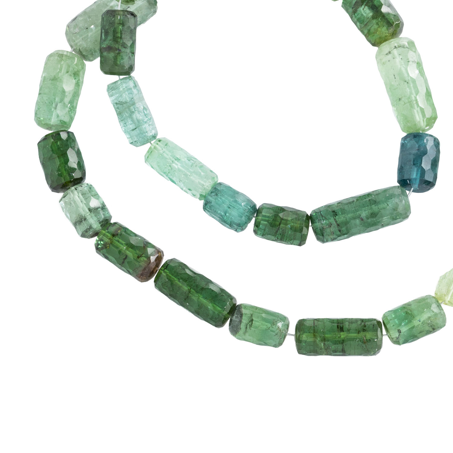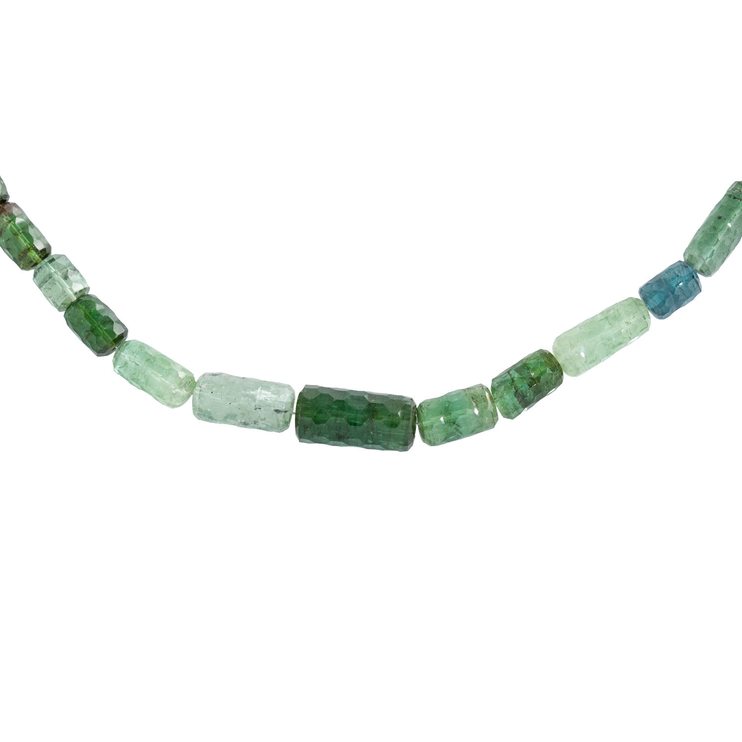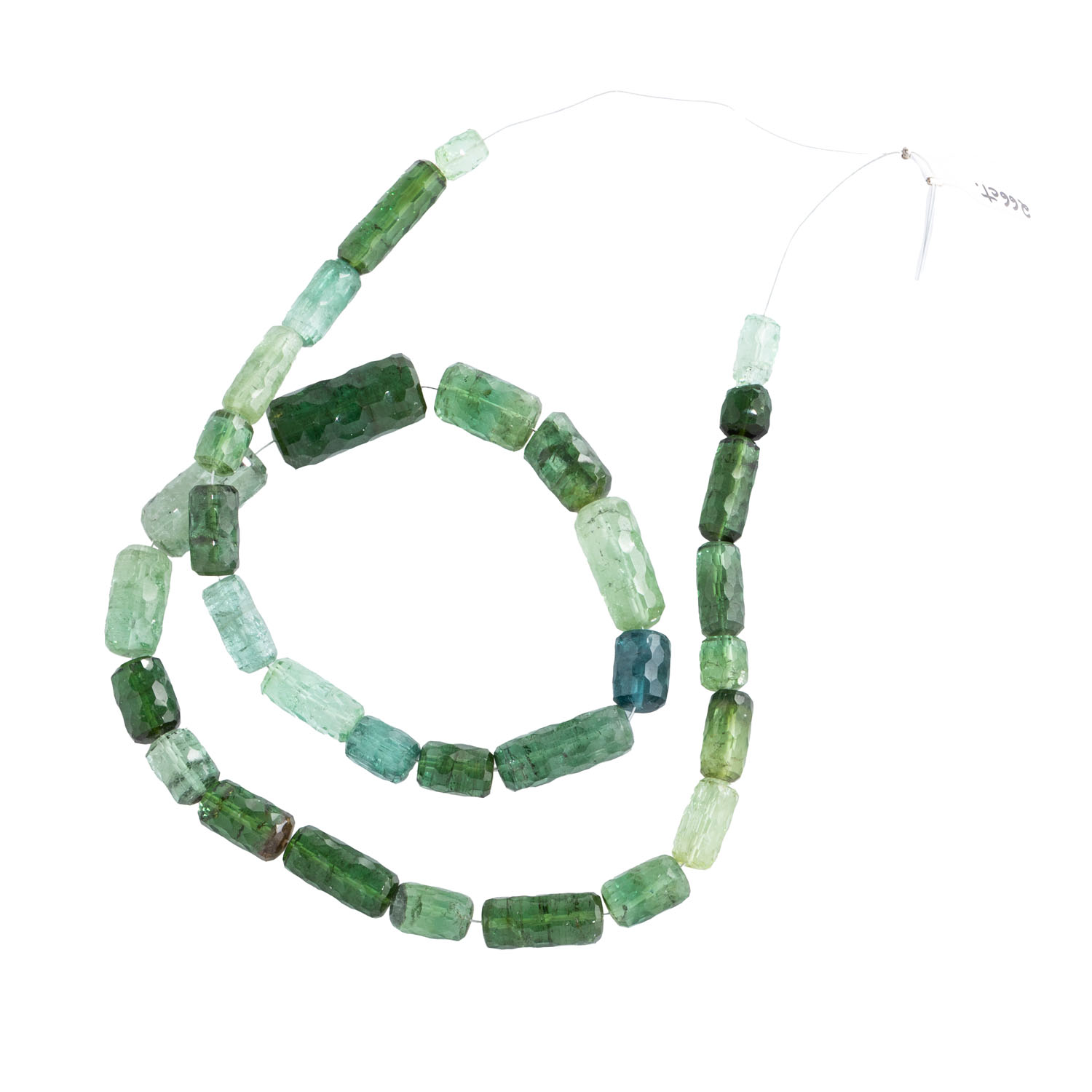 aus 32 facettierten Turmalinkristallen, vorwiegend in Grüntönen, zus. ca. 266 ct (inkl. Schnur), Turmaline von ca. 7,5 bis 22,7 mm, L: ca: 43 cm, gefädelte Linie ohne Verschluss, 21. Jh., neuwertiger Zustand. Turmaline in verschiedenen Grüntönen und Ausformungen.