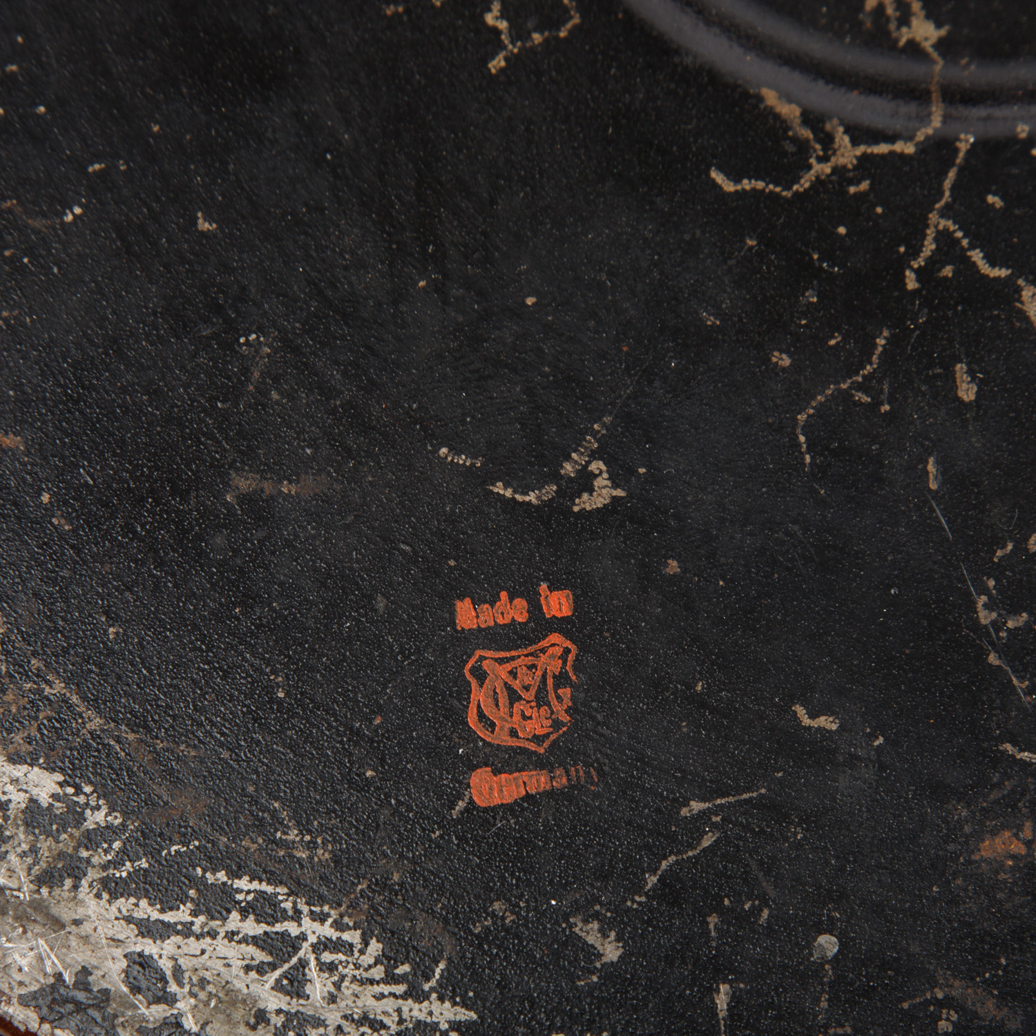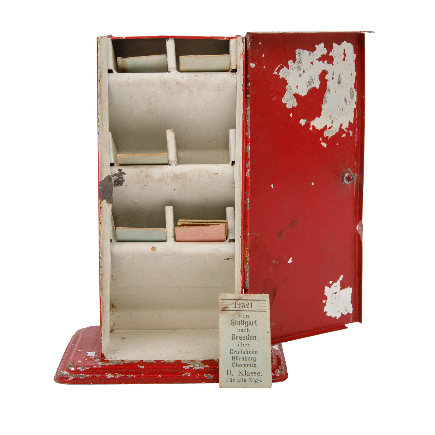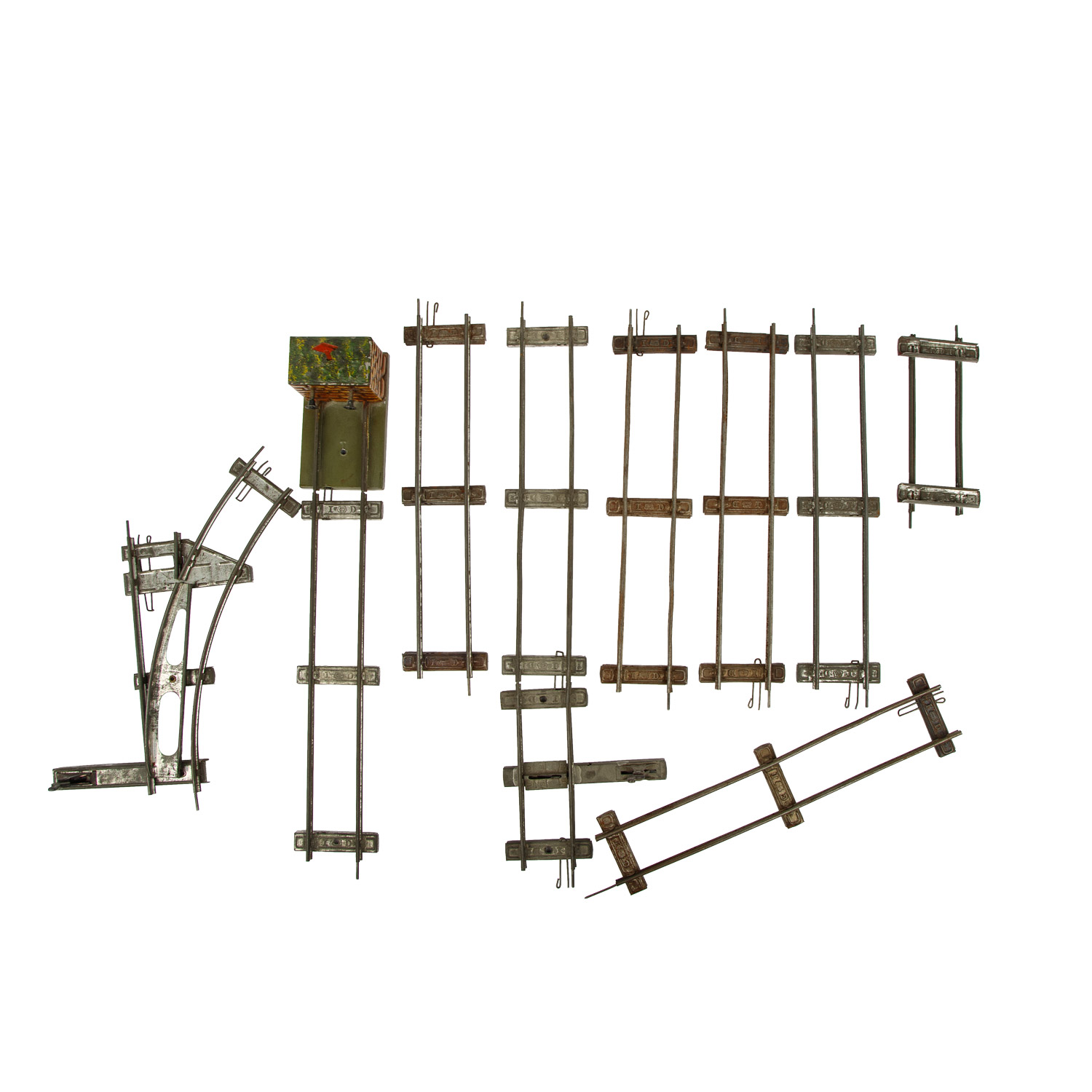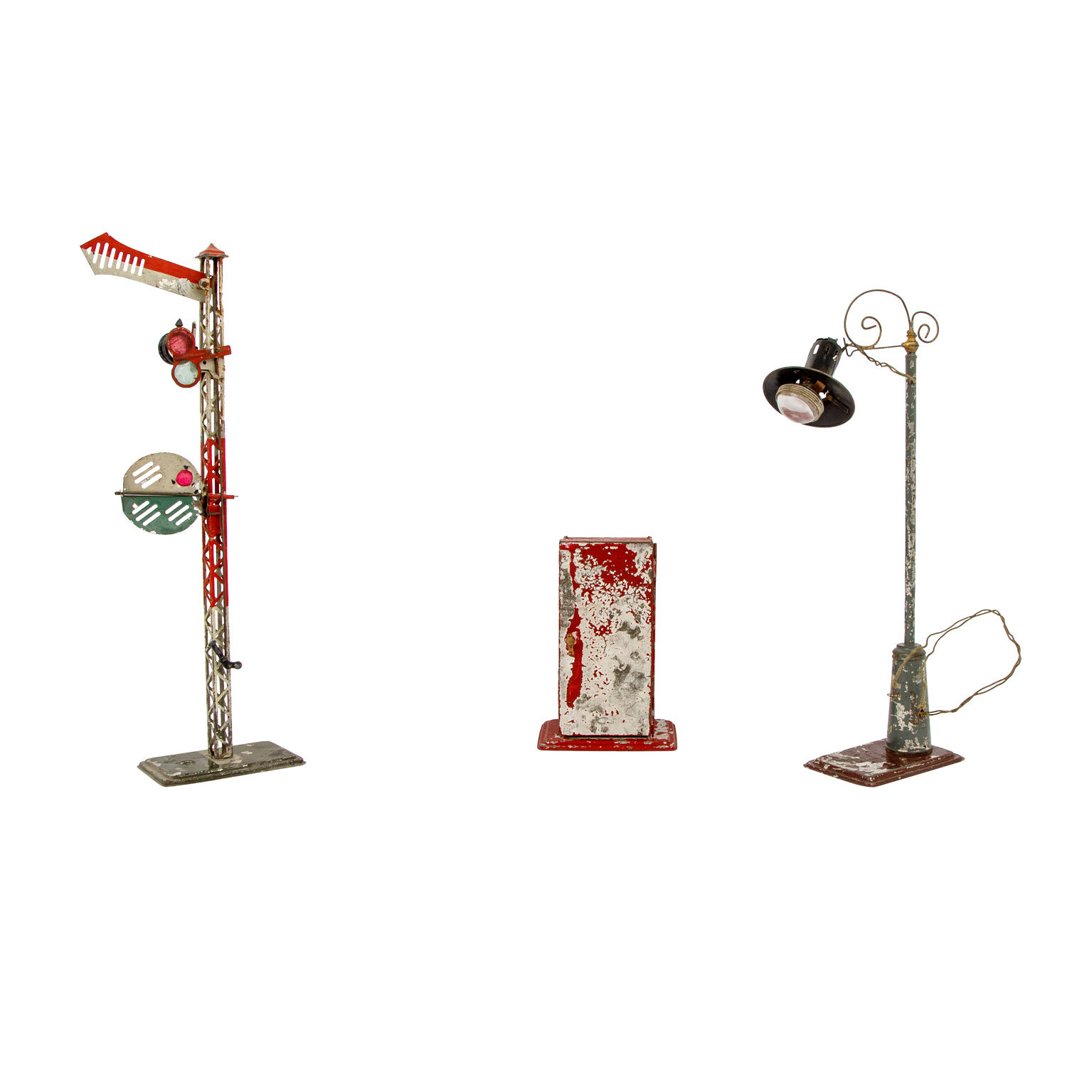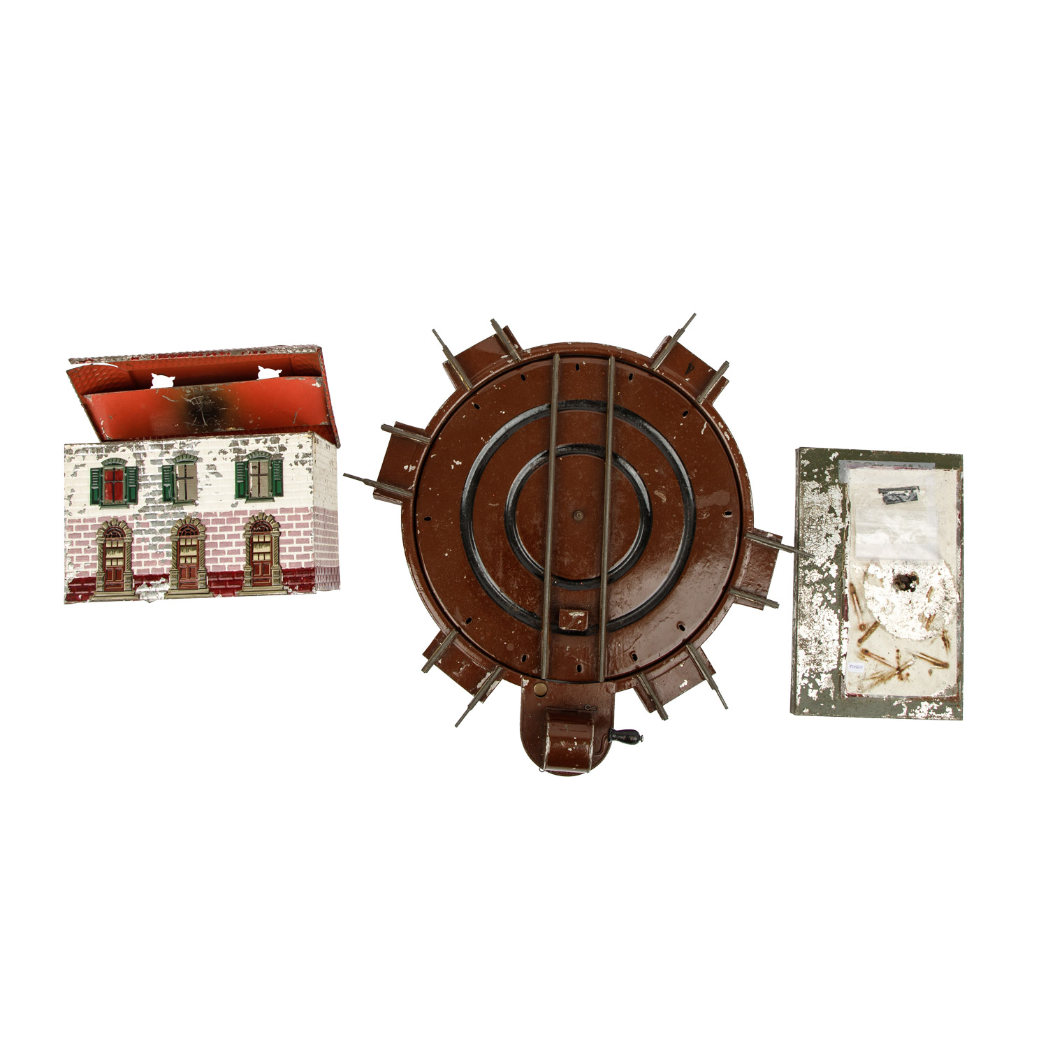 braune Drehscheibe 2131/I für Uhrwerk-Bahnen, 6 Anschlüsse, Handkurbel, 1909-24, D ca.40 cm; Prellbock mit Federpuffern, geprägtem Mauerwerk und Signalscheibe, farbig lithografiert, L 13, 5 cm, gerades Gleis befestigt, Drehscheibe und Prellbock mit rotem Märklin-Bodenstempel, je Lackschäden, Altersspuren. Dazu wohl BING 1 Gittermast Hauptsignal mit durchbrochenen Flügeln u. roter Scheibe u. durchbrochenem Vorsignal mit roter u. grüner Scheibe, H 40 cm; Fahrkartenschrank mit 6 Einlegefächern, 4 Städtenamen lesbar, die restlichen Beschriftungen sind durch die Lackschäden unleserl. 11 Fahrkarten anbei, H 16, 5 cm; Bogenlampe auf zylinderförmigem Blechfuß, flache Bodenplatte, Mast mit einfachen Drahtverzierungen, Blechschirm über halbrunder Glaslampe, Draht zur Elektrifizierung, H 36, 5 cm und ein Stadthaus, geprägtes Mauerwerk, 6 Fensteröffnungen (3 Fensterläden gebrochen, 2 lose anbei, 6 lithografierte und aufgesetzte Türen, Dach abnehmbar, Haus steht lose auf einer rechteckigen Bodenplatte mit kleinem Kerzenhalter, H 18, 5 cm. Je starke Lackschäden, Altersspuren, beschädigt. 7 gerade Schienen und 1 Weiche anbei.