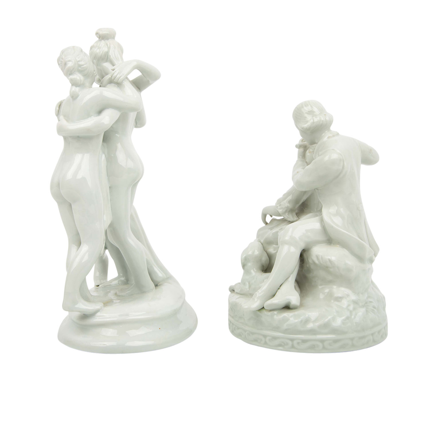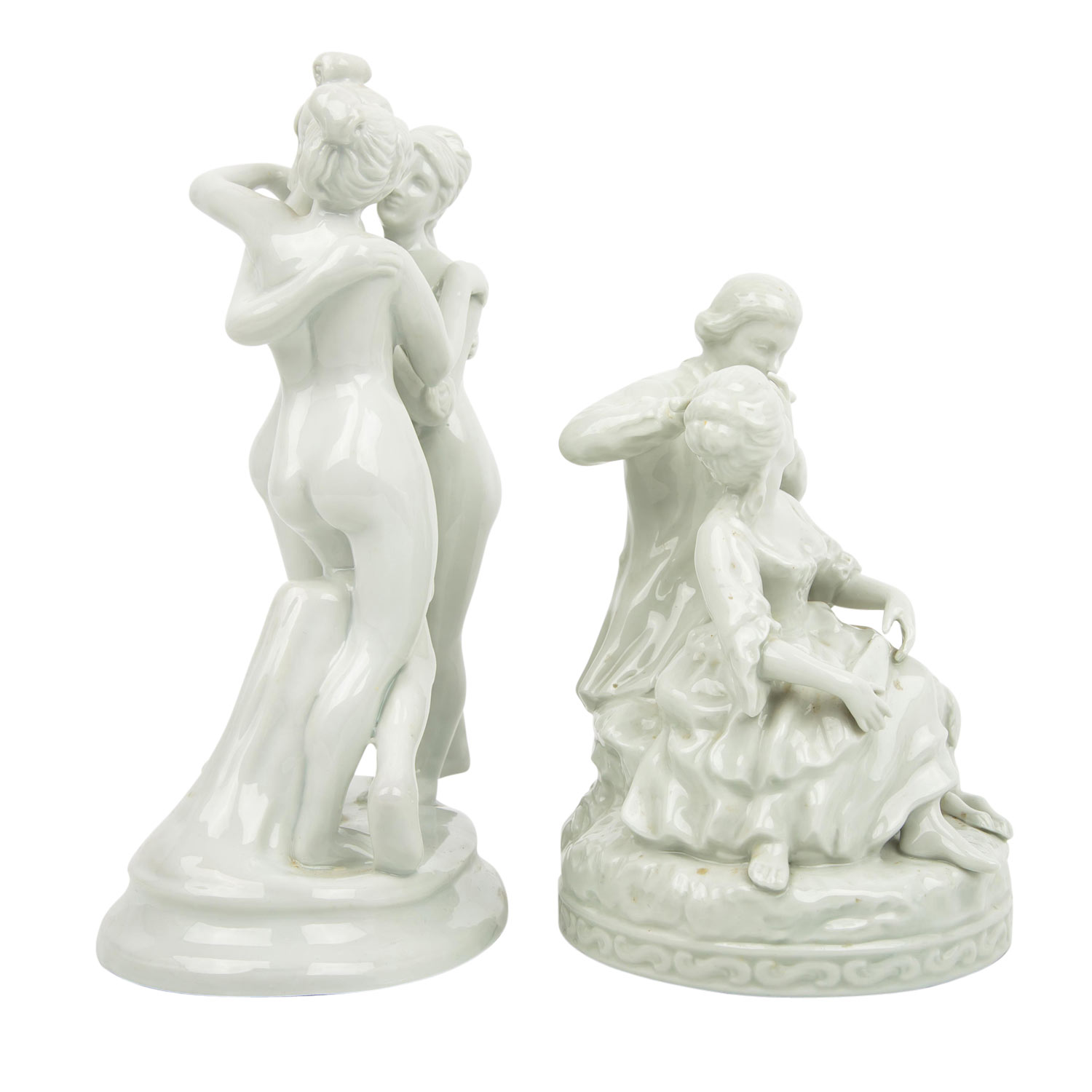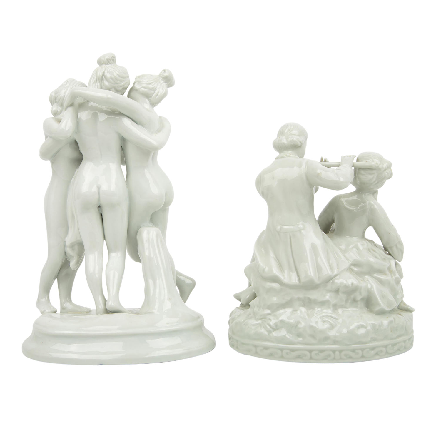 Je Weißporzellan, bestehend aus 'Die drei Grazien' auf ovalem Sockel, H 28, 5 cm, us. Stempel 'Made in Germany' (vermutlich Thüringen, min. herstellungsbedingter Brandriss) dazu eine Figurengruppe 'Galantes Paar mit Hund', musizierender Jüngling mit Dame und Hund auf ovalem Sockel, H 21 cm, Manufakturstempel von Potschappel, je mit Altersspuren.