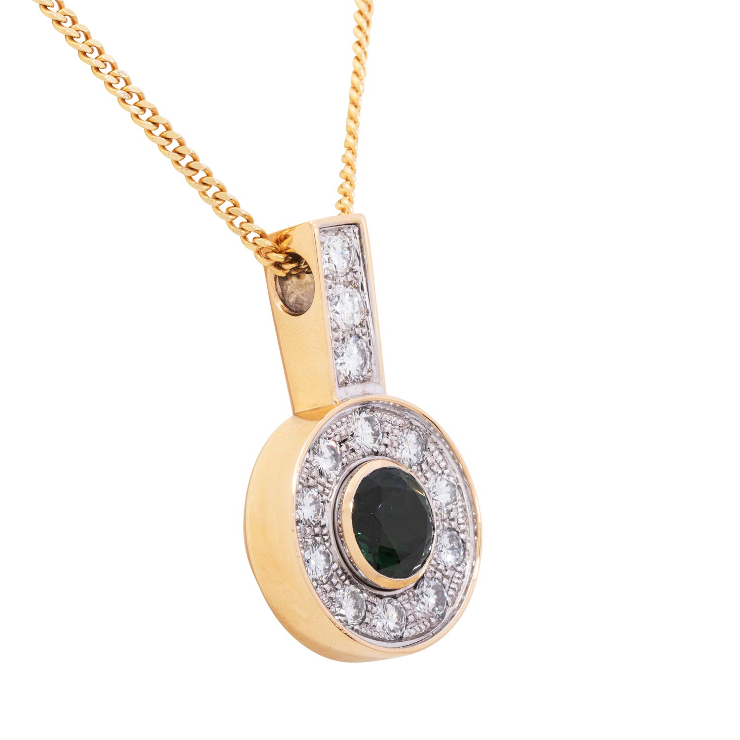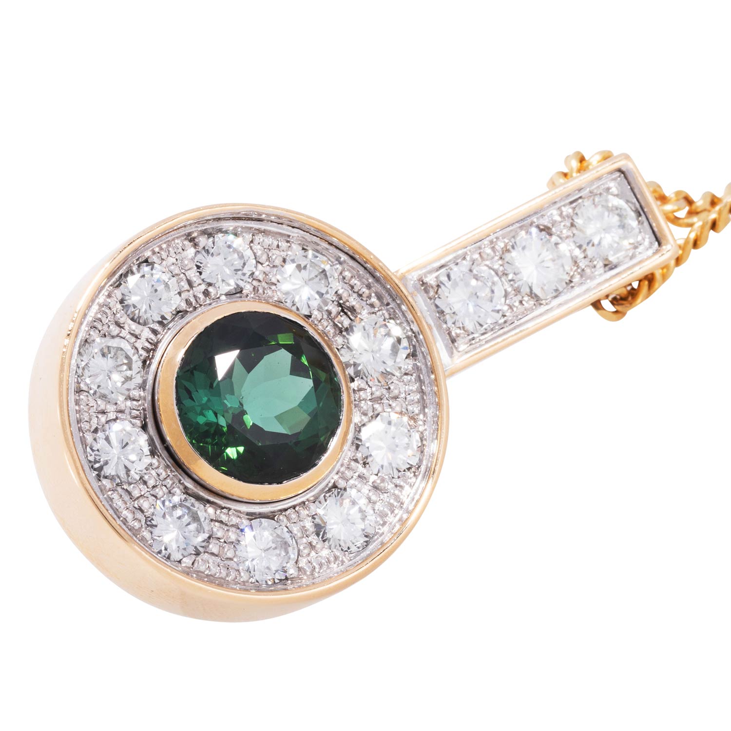 13 Brillanten von je ca. 0,26 ct, ca. WEISS (H)/VS-SI und grüner Turmalin, rund facettiert, ca. 4 ct, hochwertig gearbeitet aus GG/WG 18K, 4x2,3x0,7 cm, an Panzerkette aus GG 18K, L: 60 cm, 32,3 g, 20./21. Jh., guter Erhalt, punziert Unikat.