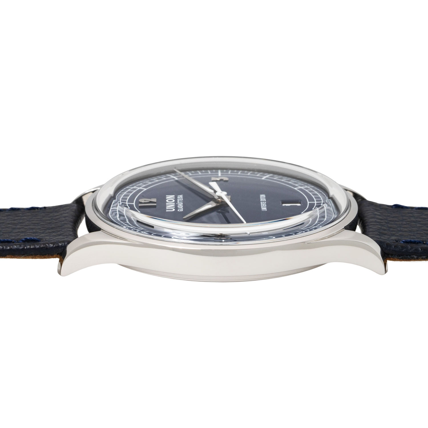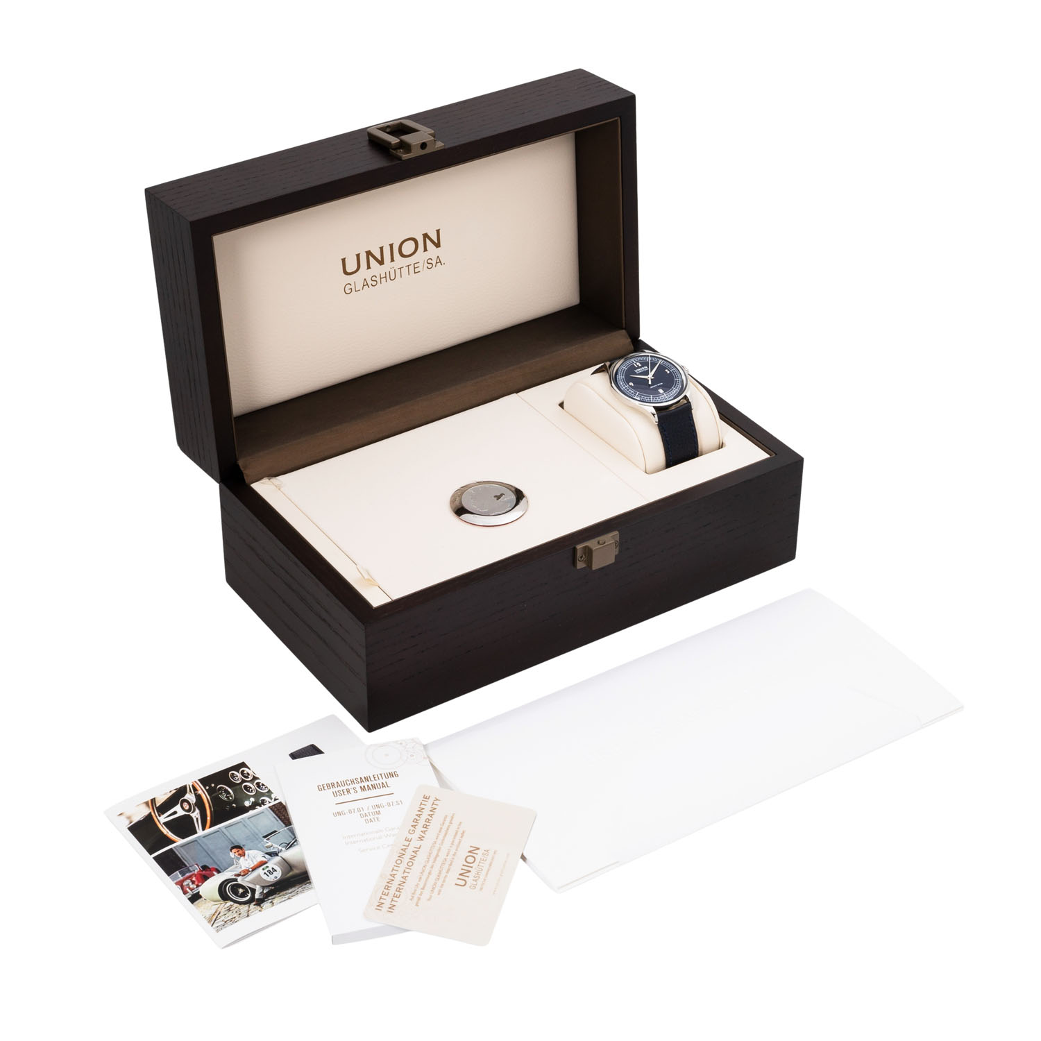 Edelstahl, Seriennummer 92611, Sonderedition zur ADAC Deutschland Klassik 2021, limitiert auf 200 Stück (Nr. 193). Automatikwerk Kal. UNG-07.01 / UNG-07.S1 auf Basis von ETA 2892 mit guten Gangwerten (+5 s/d, 258° Amplitude). Dunkelblaues Sektor-Zifferblatt mit arabischen Zahlen, Zentralsekunde und Datumsanzeige. Dunkelblaues Original-Lederarmband mit Edelstahl-Butterflyschließe. Sehr guter Zustand, wenige, leichte Tragespuren an Band und Gehäuse. Original Box und Papiere von 07/2021, zweiter, geschlossener Gehäuseboden und Erstkaufrechnung anbei, gekauft bei Brinckmann & Lange in Stuttgart. Durchmesser ca. 40 mm gemessen ohne Krone.