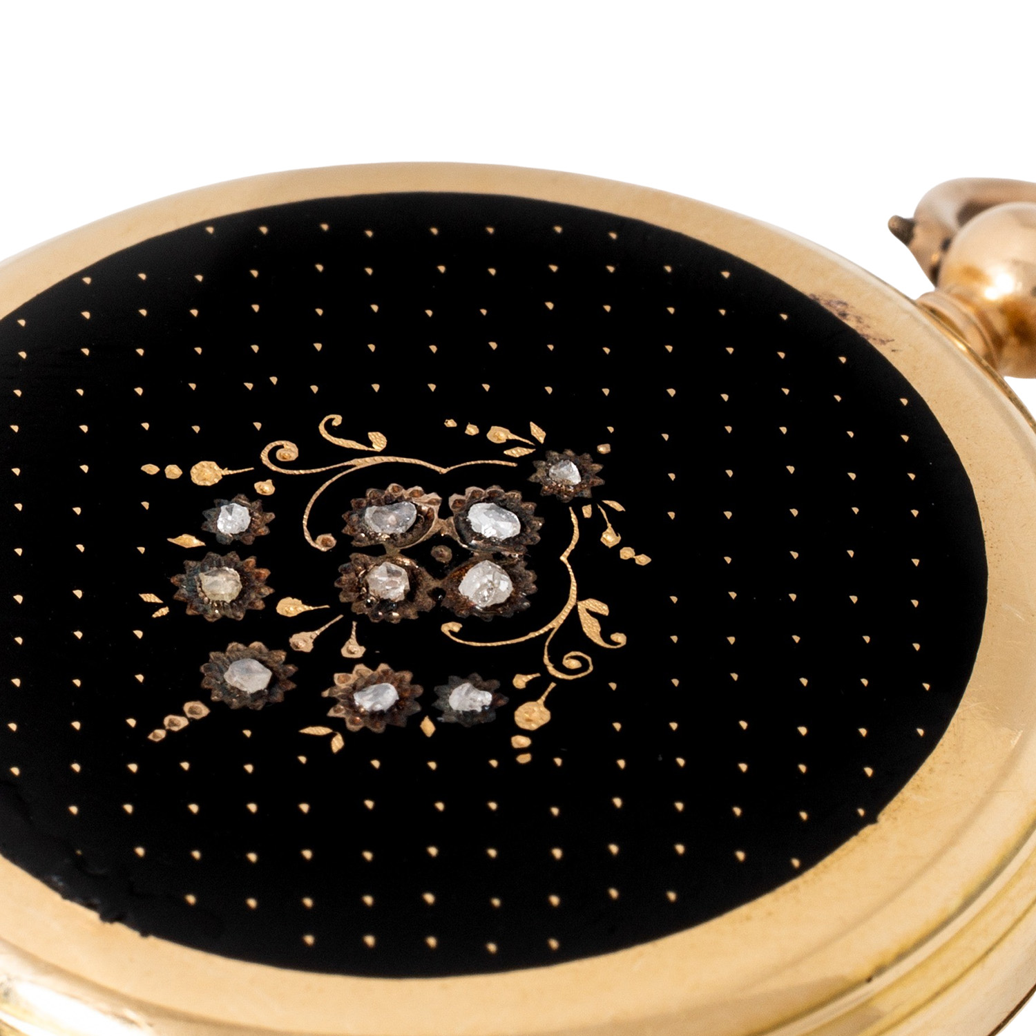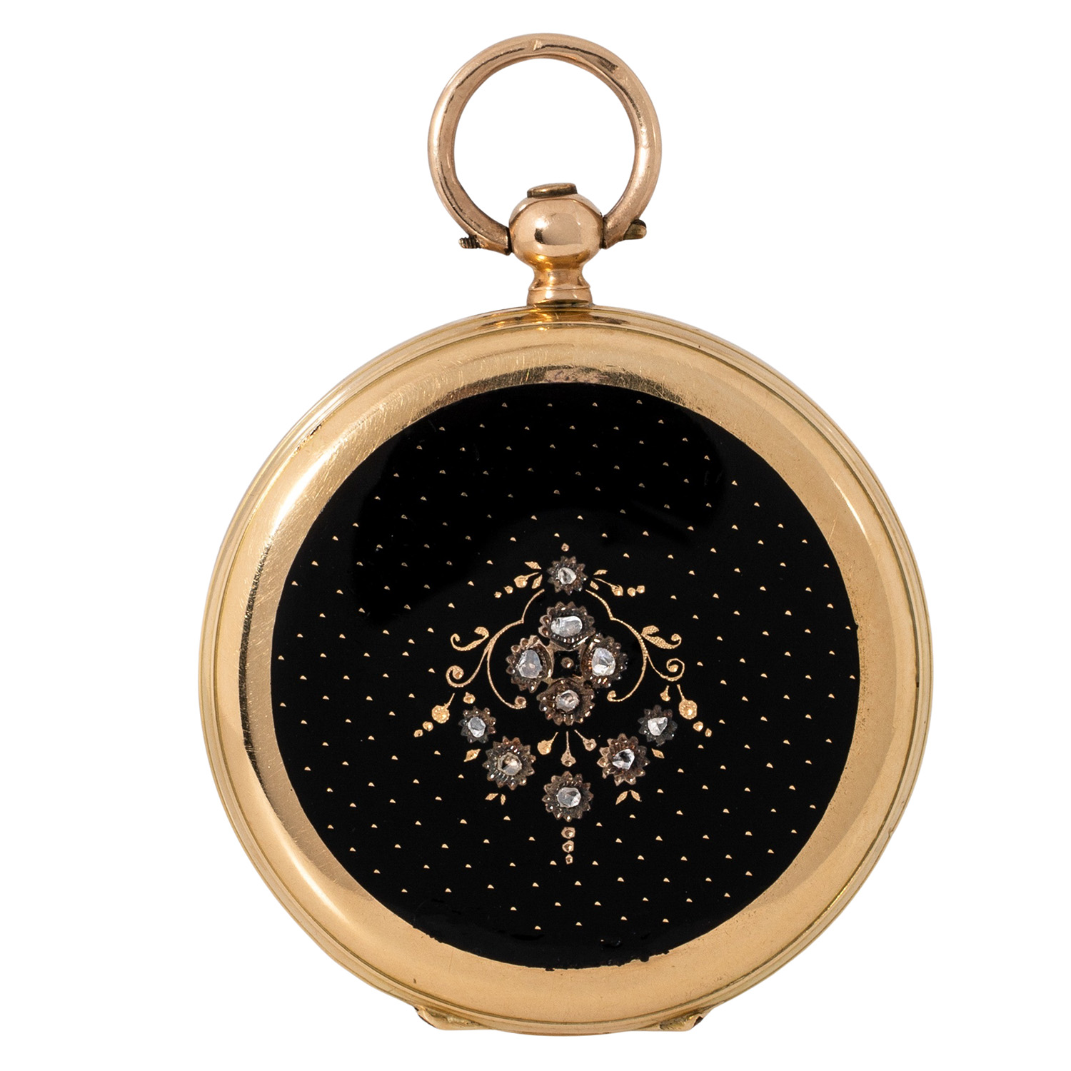 18K Gelbgold mit Brillantbesatz und schwarzer Emaillierung, Gehäuse nummeriert 3596-5. Mechanisches Werk mit Schlüsselaufzug in funktionsfähigem Zustand mit Feinregulierung. Weißes Zifferblatt mit römischen Zahlen und Eisenbahnminuterie. Gebraucht mit Tragespuren. Durchmesser ca. 34 mm gemessen ohne Krone.