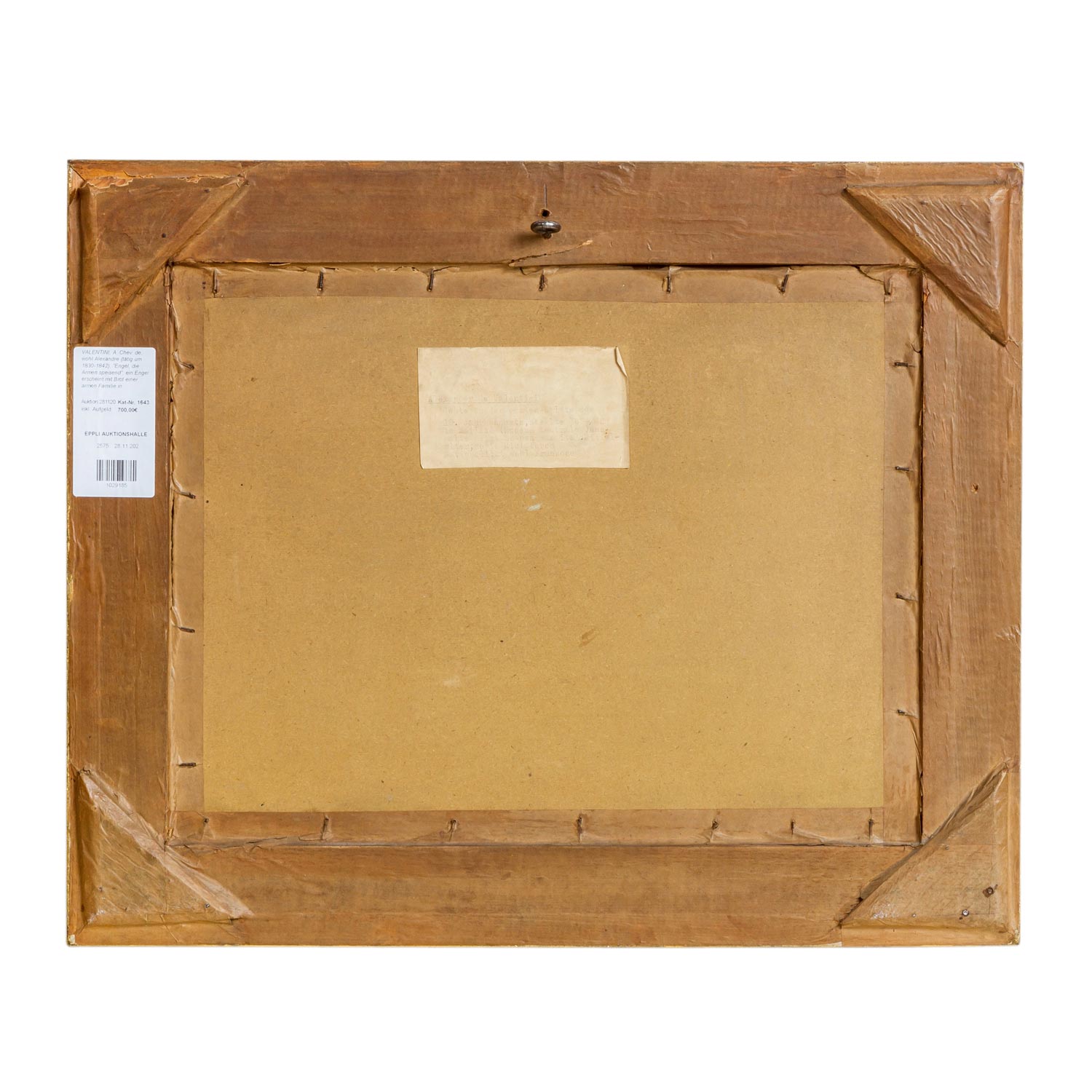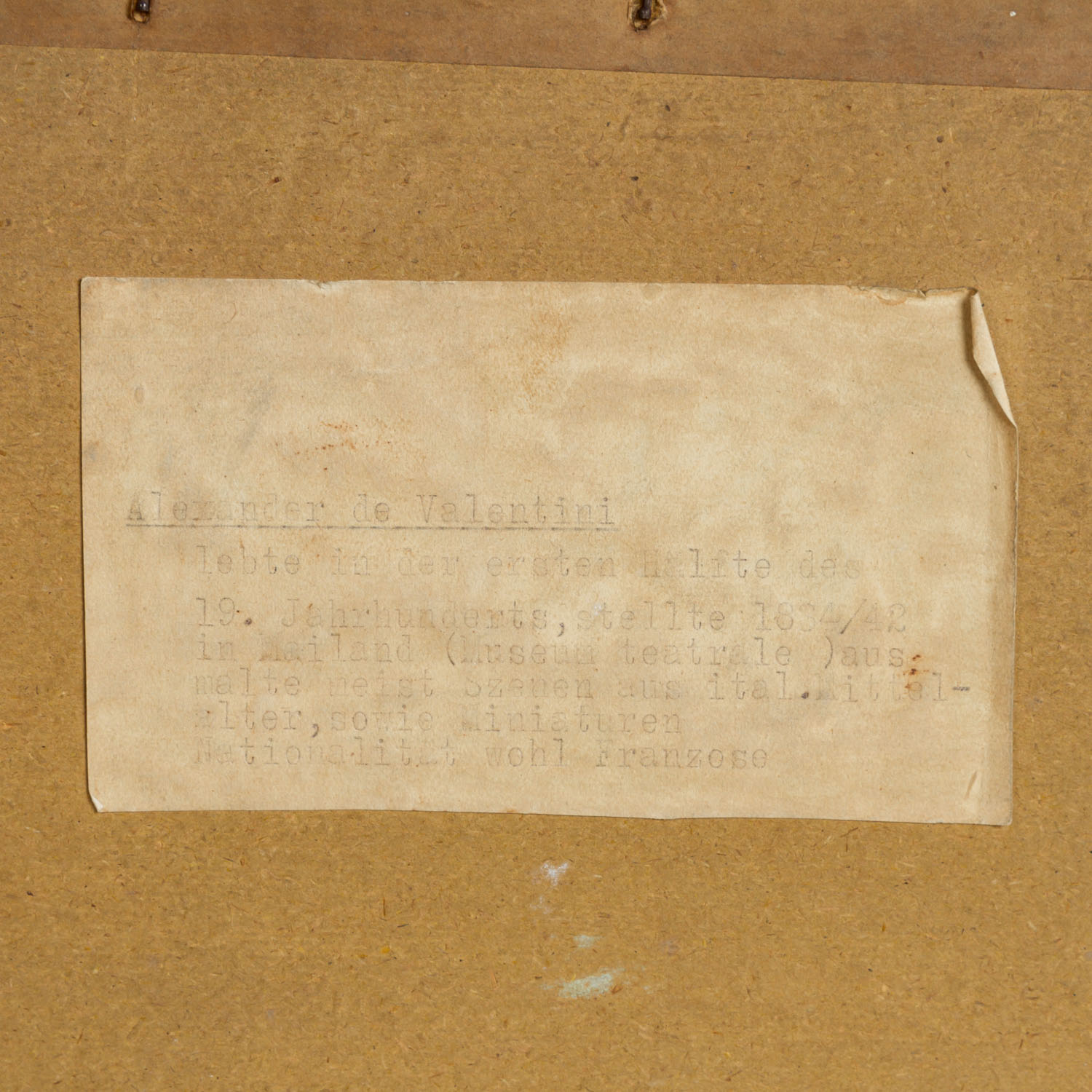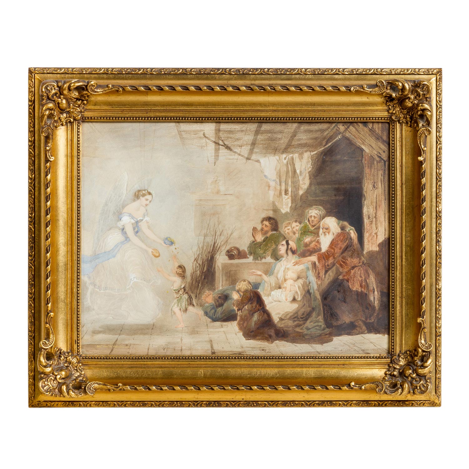 VALENTINI, A. Chev. de, wohl Alexandre (tätig um 1830-1842), ""Engel, die Armen speisend"", ein Engel erscheint mit Brot einer armen Familie in Kücheninterieur, bezeichnet und datiert u.li. 'Alex. Chev. de Valentini 1843' und u.re. 'A. Chev. de Valentini 1843', Mischtechnik/Papier, HxB: ca. 31x40 cm (42x51 cm mit Rahmen). Leicht gebräunt, gewellt, Farbabplatzer. Hinter Glas gerahmt. Altersspuren.