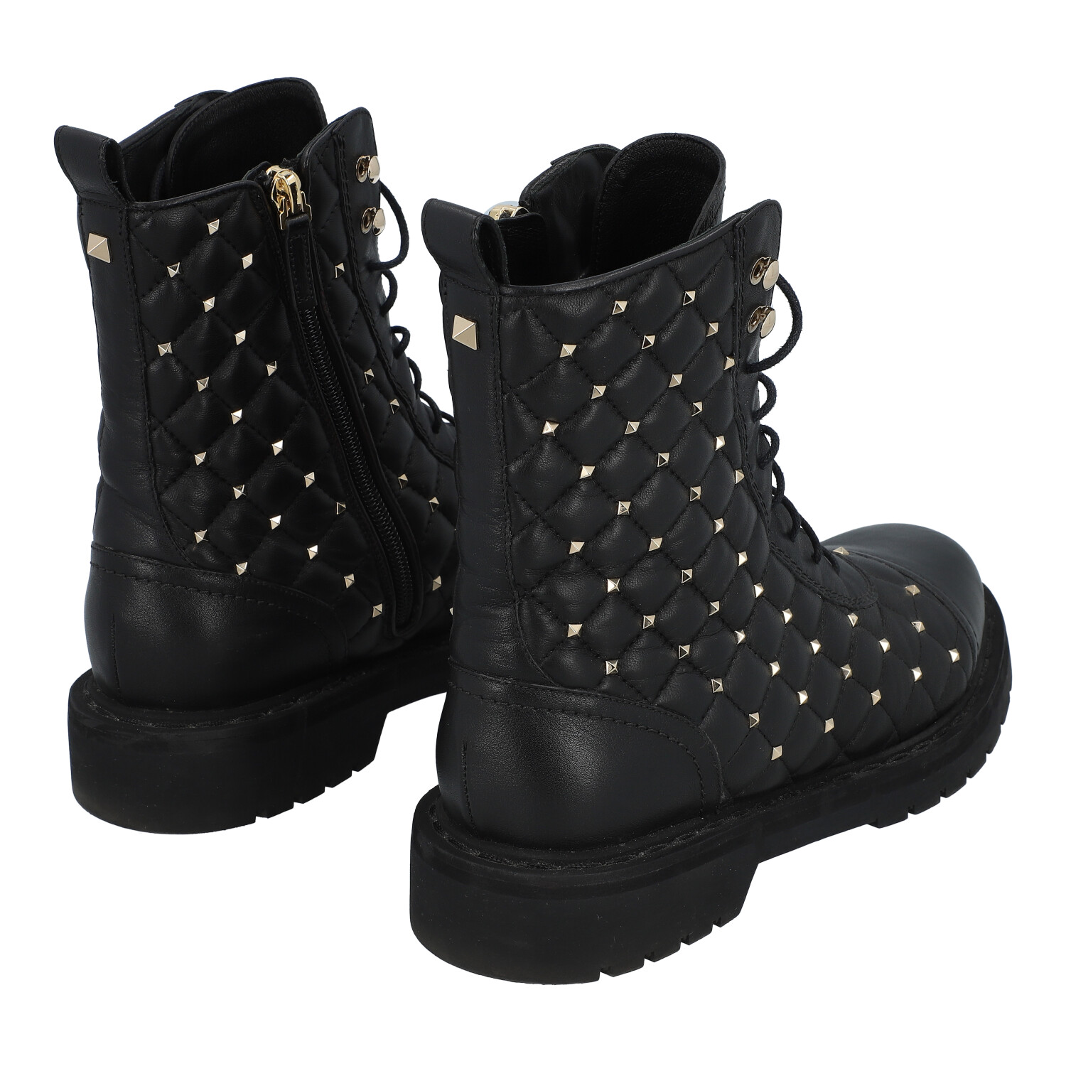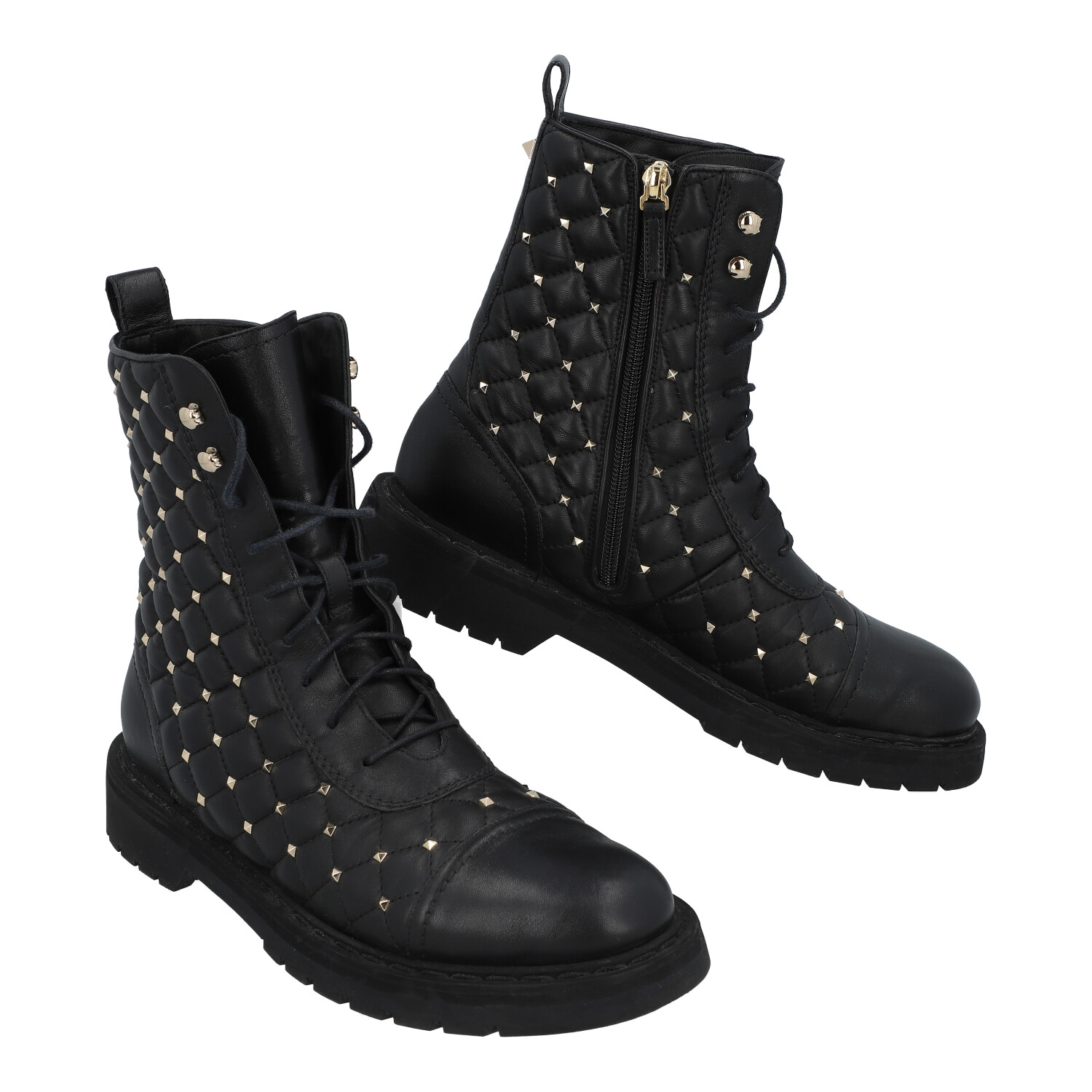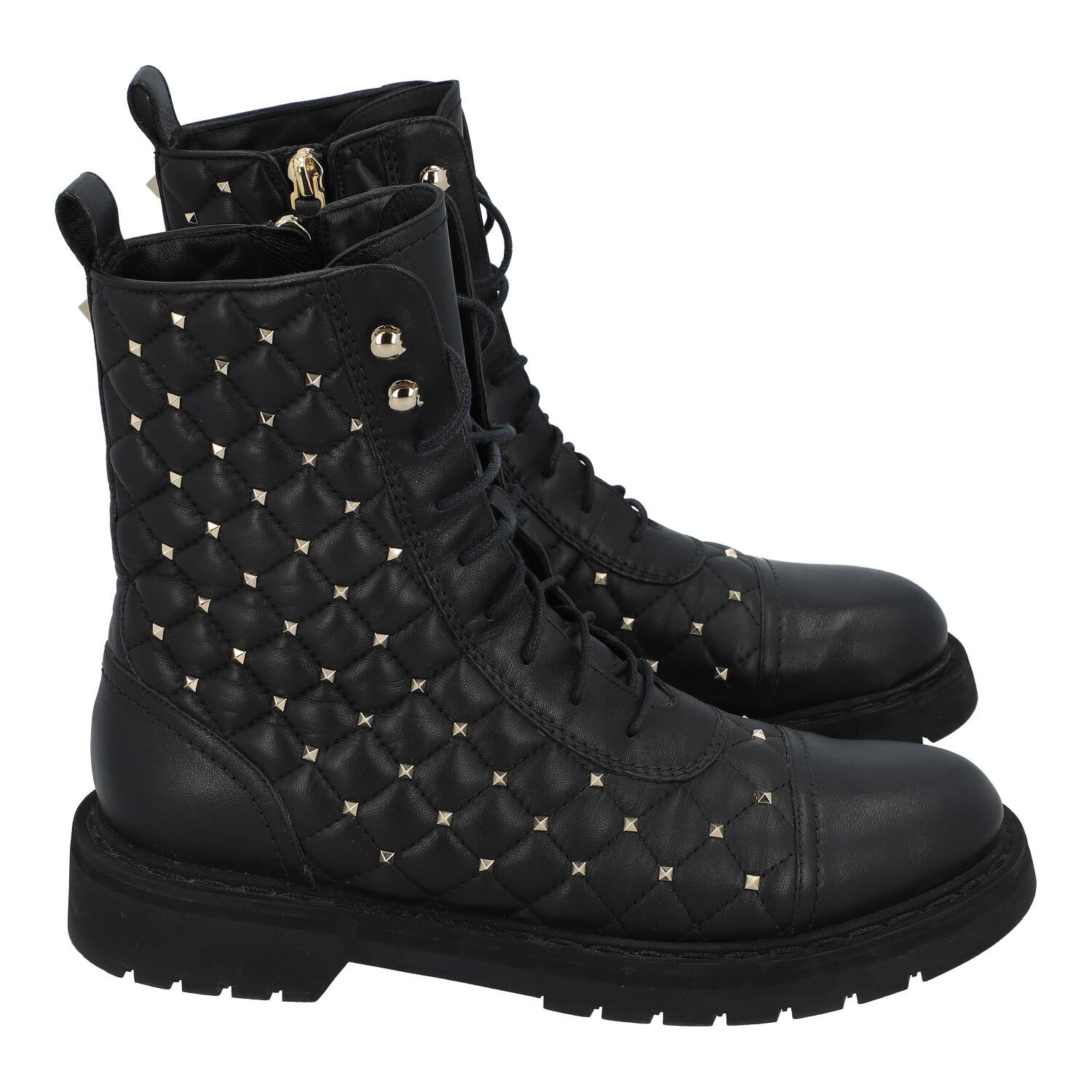 Aus fein genarbtem Leder in Schwarz mit Diamantsteppung und goldfarbenem Nietenbesatz. Schnürverschluss und seitlicher Reißverschluss. Gummierte Laufsohle. Leichte Tragespuren vorhanden.
