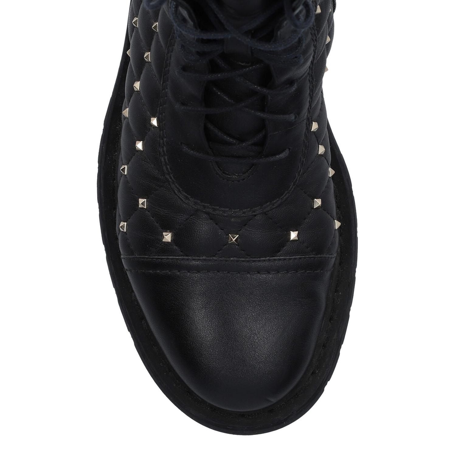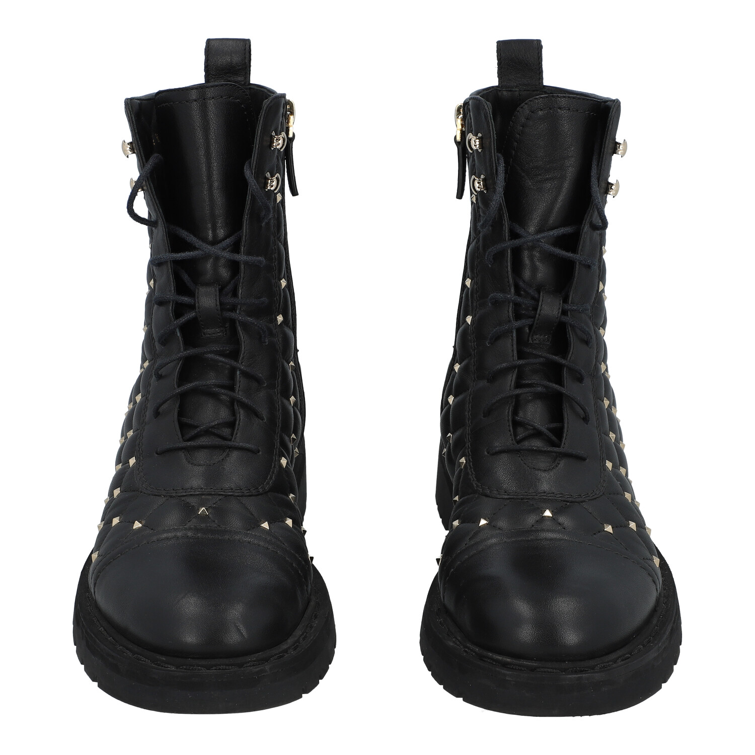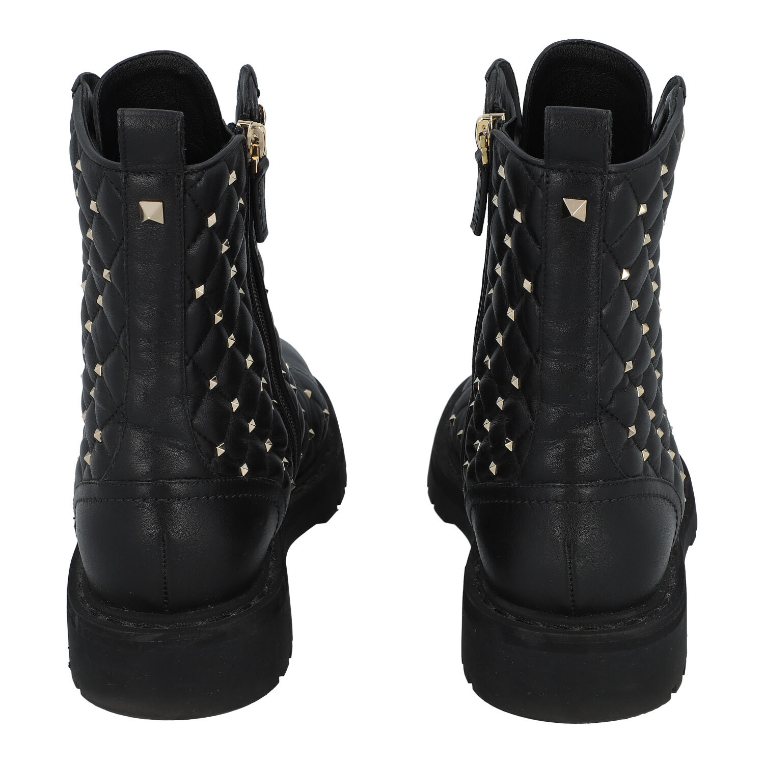 Aus fein genarbtem Leder in Schwarz mit Diamantsteppung und goldfarbenem Nietenbesatz. Schnürverschluss und seitlicher Reißverschluss. Gummierte Laufsohle. Leichte Tragespuren vorhanden.