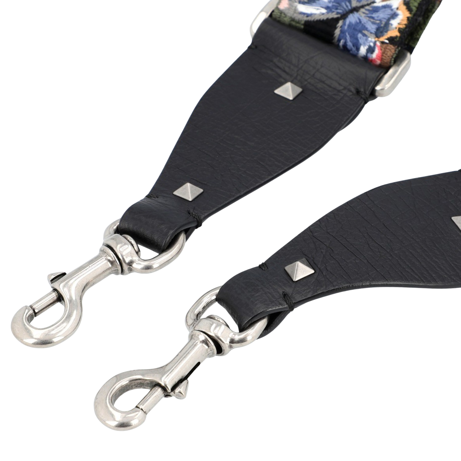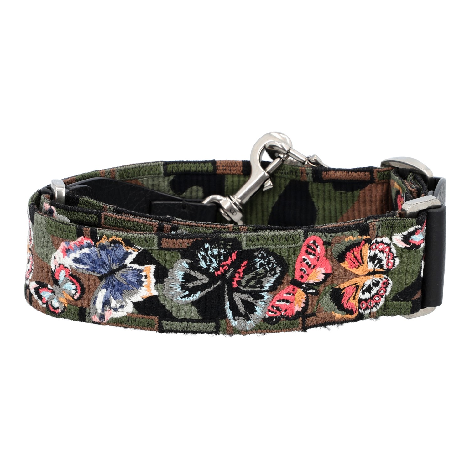 Camouflage-Design mit gestickten Schmetterlingen, silberfarbene Hardware, schwarzes Leder, Nieten-Dekor und Karabiner. Box und Staubbeutel anbei. Tragespuren vorhanden. B.: 5 cm.