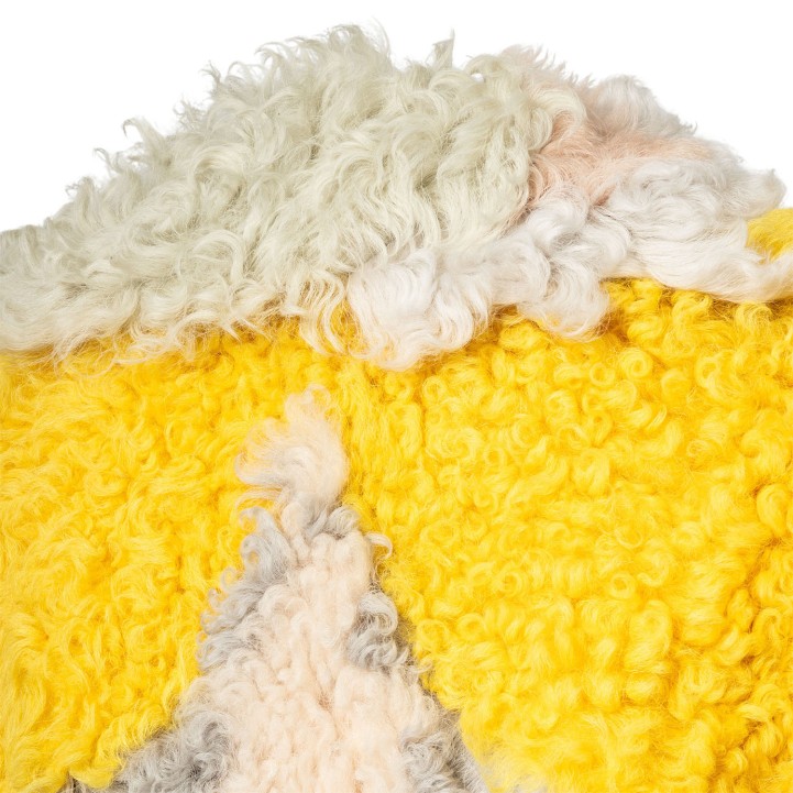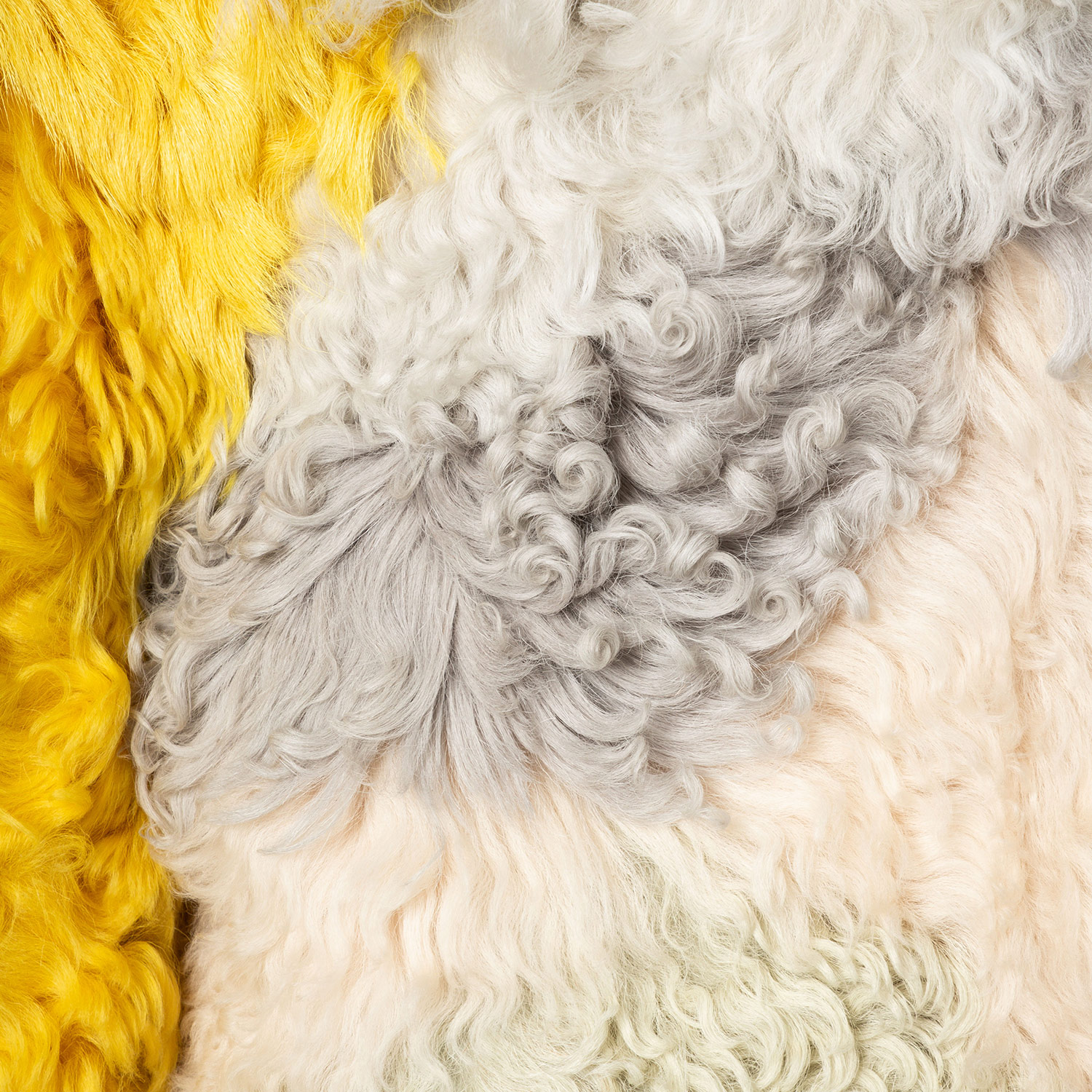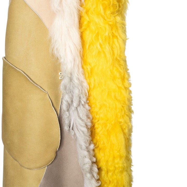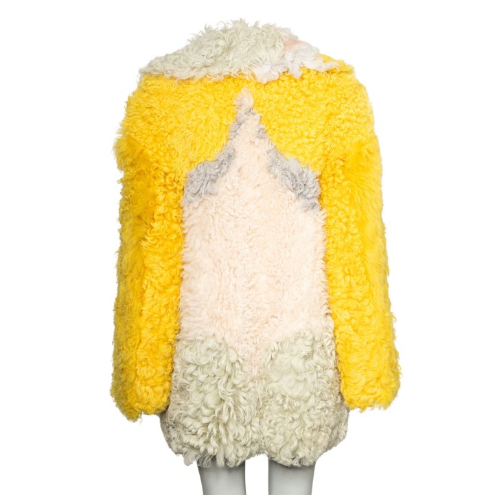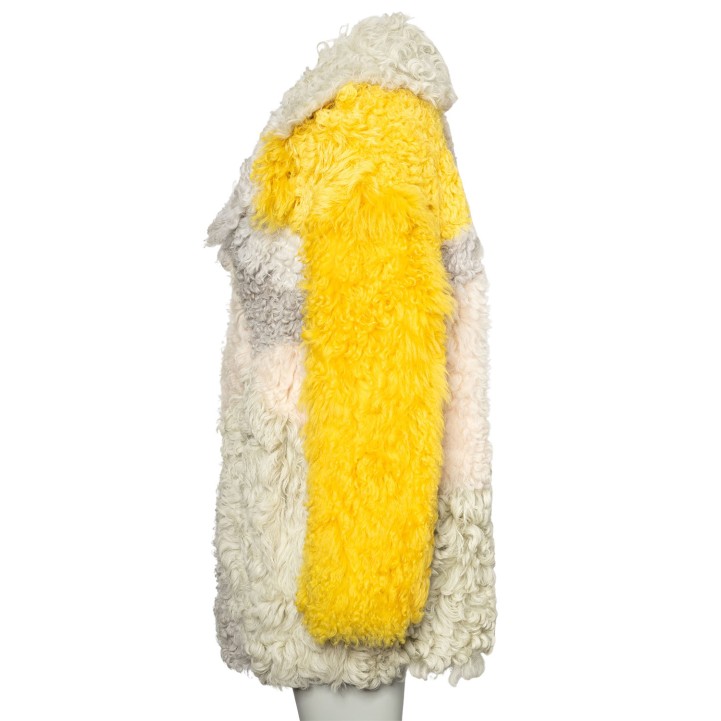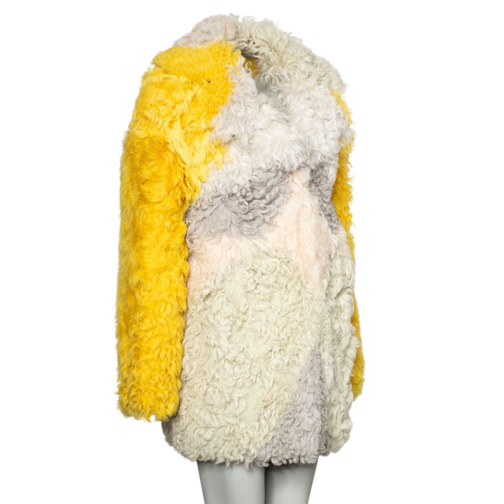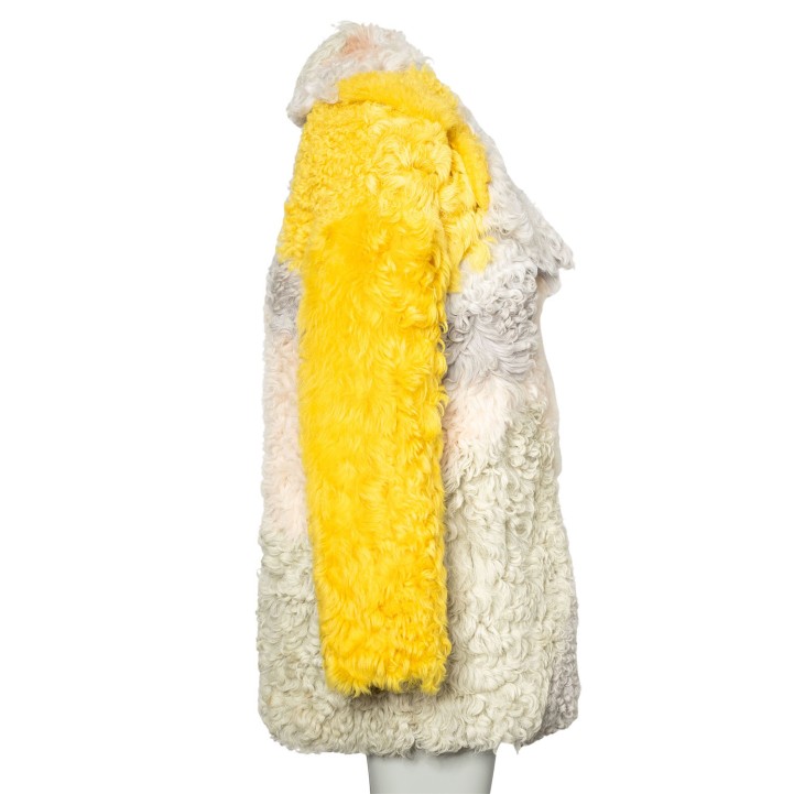 Felle in Gelb, Hellblau, Grau und Weiß gefärbt mit Reverkragen und Hakenverschluss. Innenseite aus Leder. Guter Erhalt.