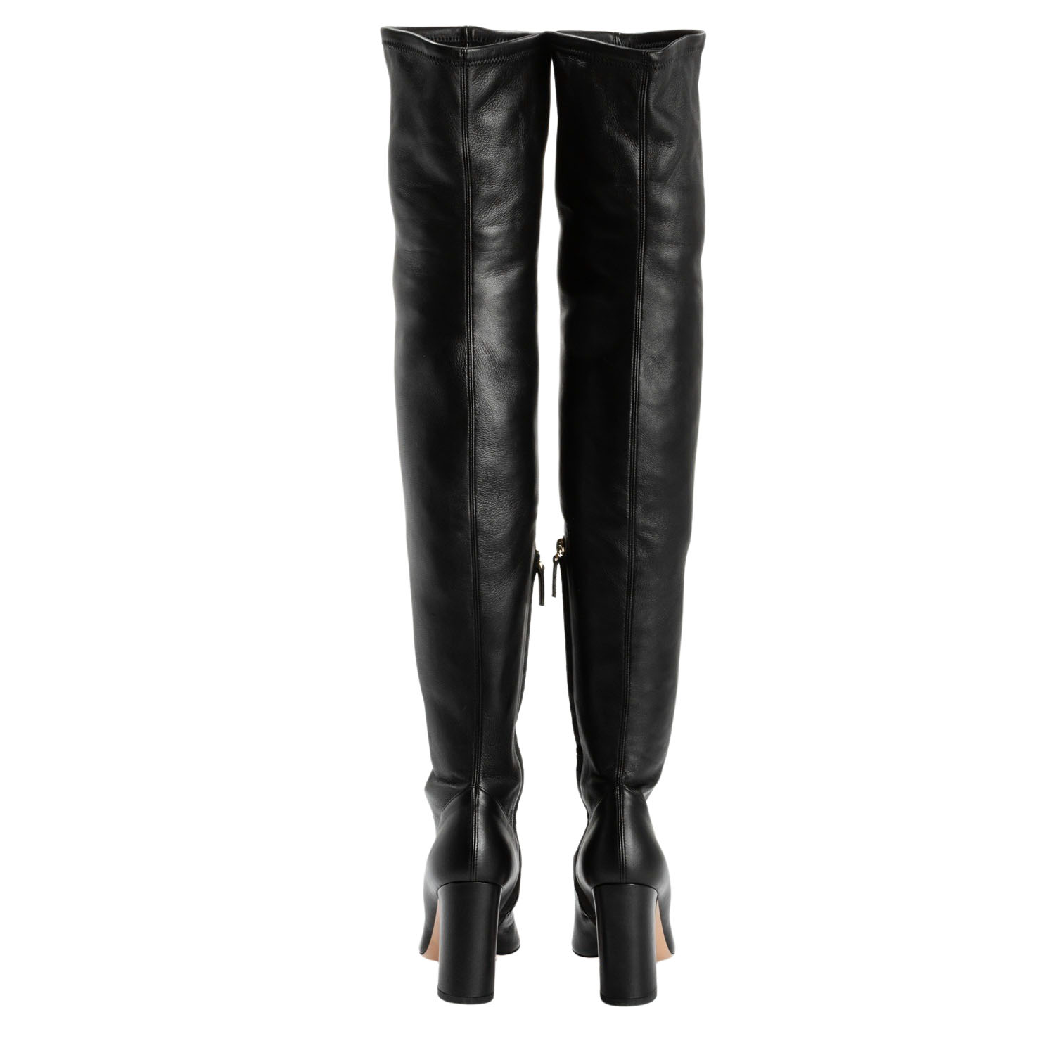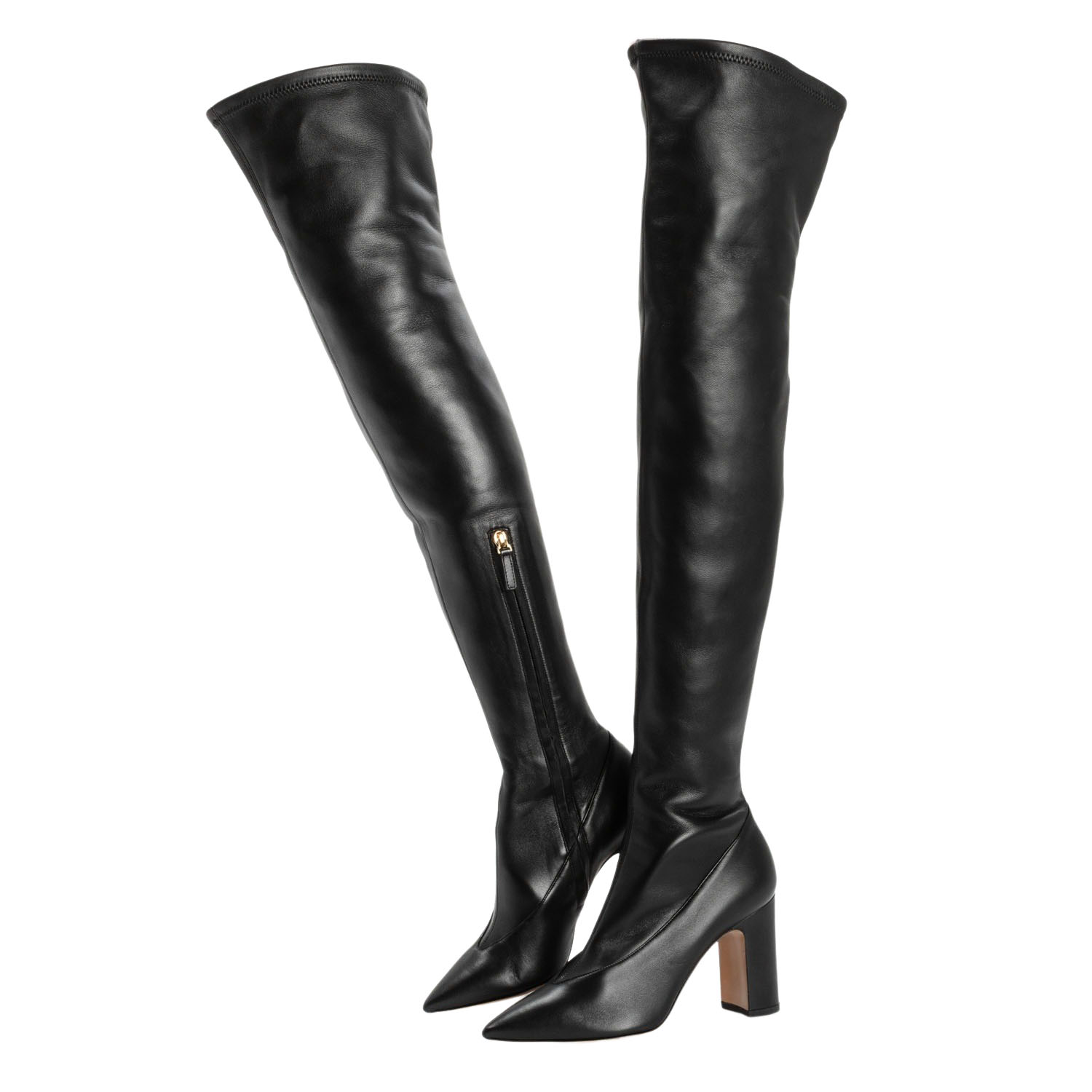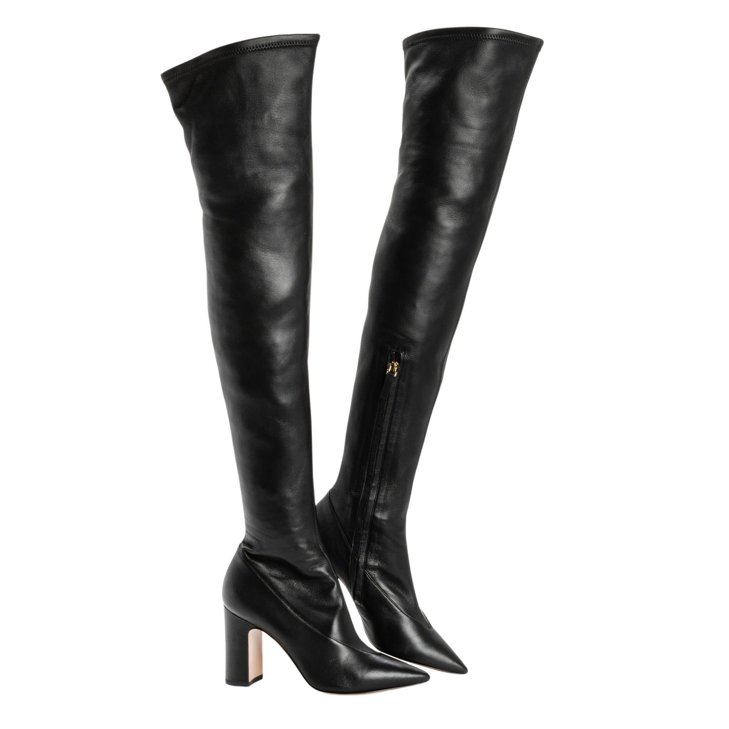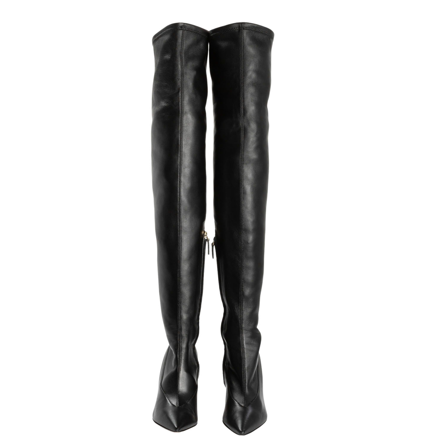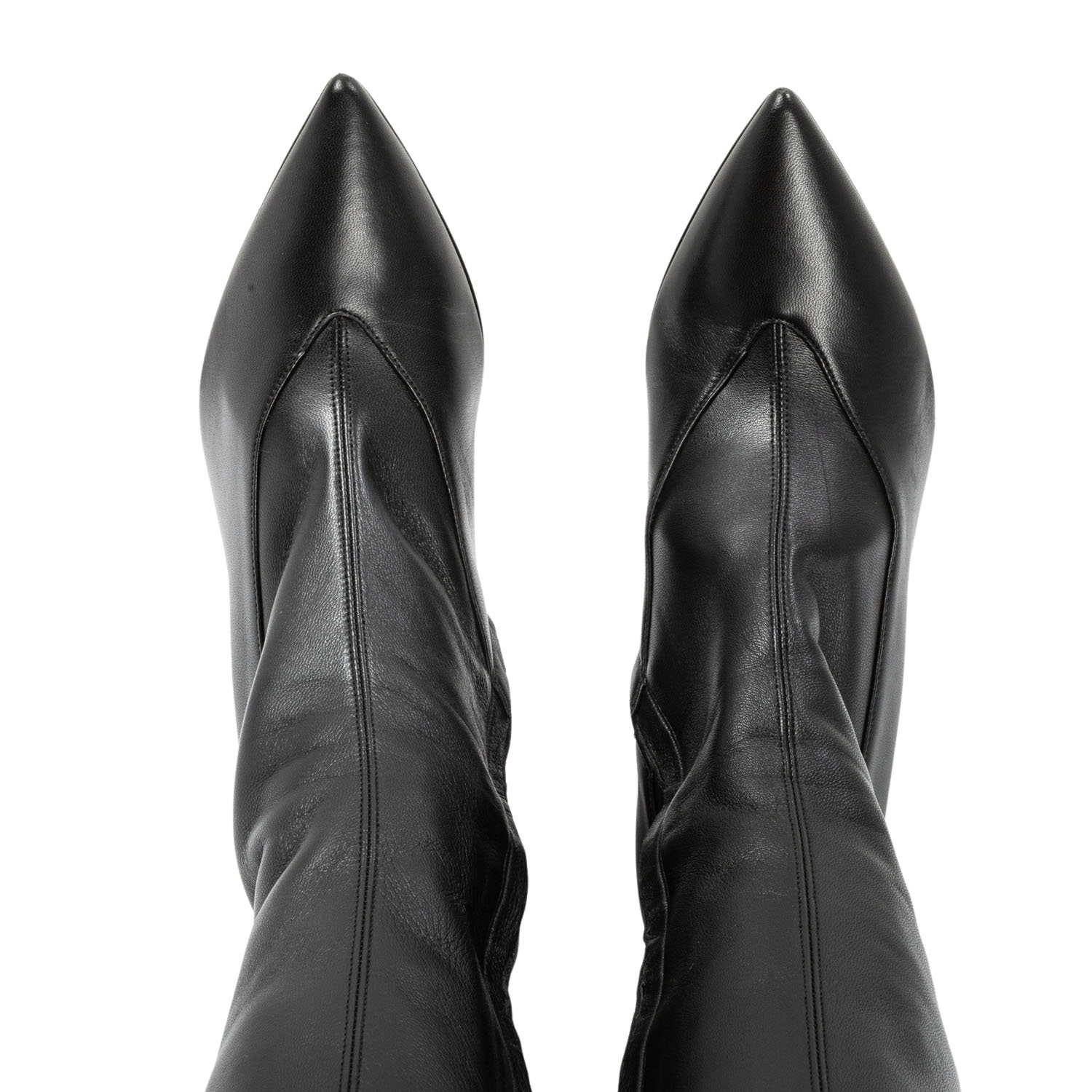 Hochschaftstiefel aus Leder in Schwarz mit seitlichem Reißverschluss, spitzer Schuhform und einer Absatzhöhe von ca. 9cm. Sehr guter Erhalt. Box und Staubbeutel anbei.