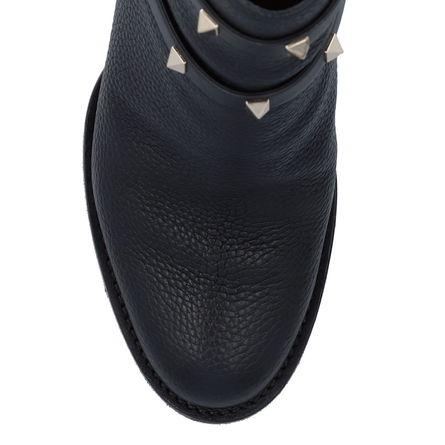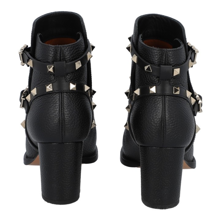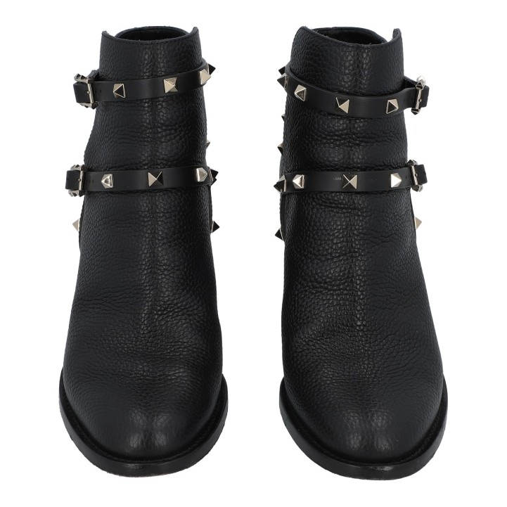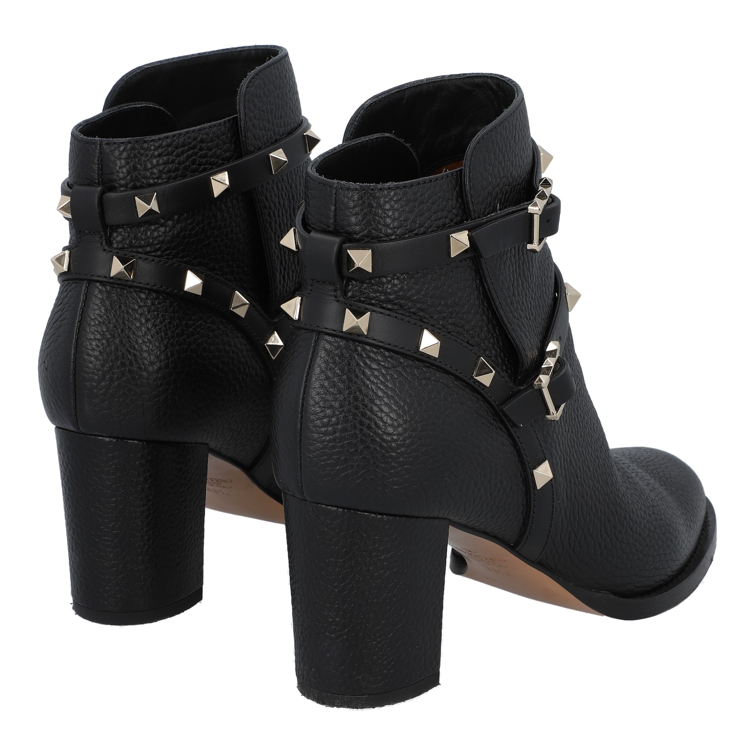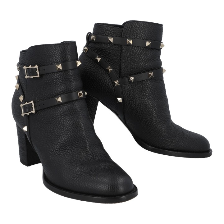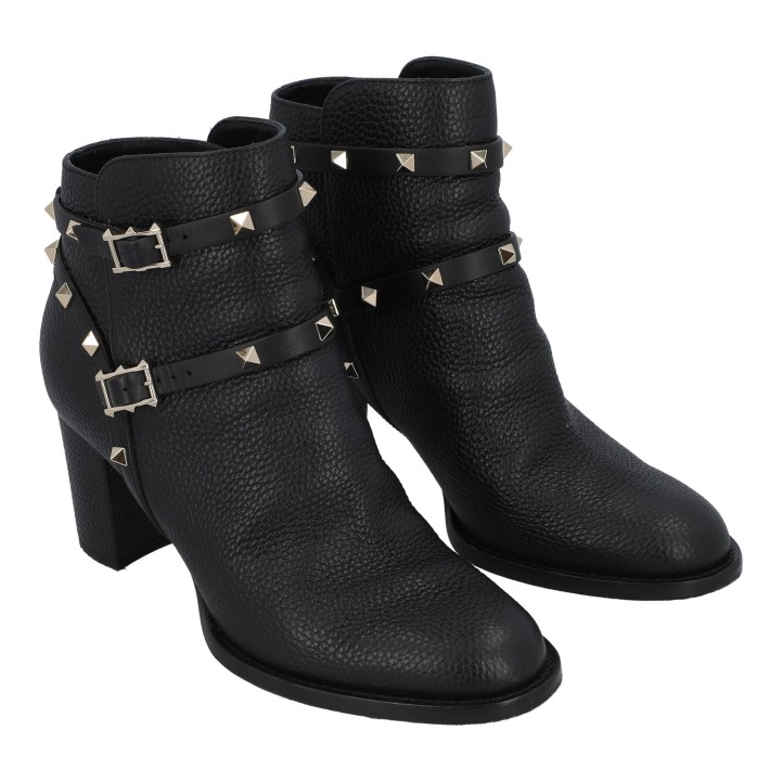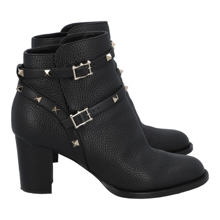 Grob genarbtes Leder in Schwarz mit Rockstud-Dekor und dekorativen Riemen. Breiter Absatz, Höhe ca. 7cm. Box anbei. Leichte Tragespuren vorhanden.