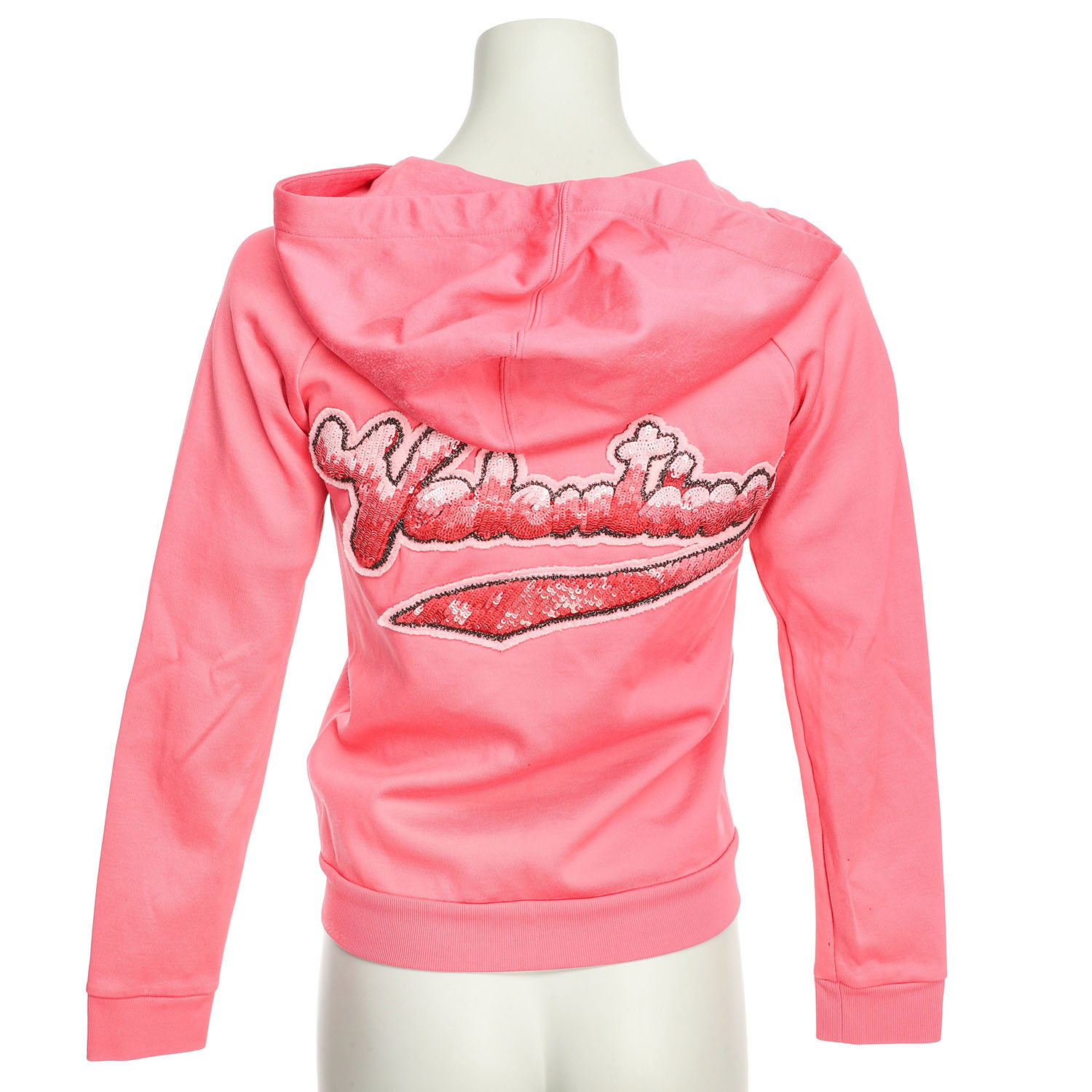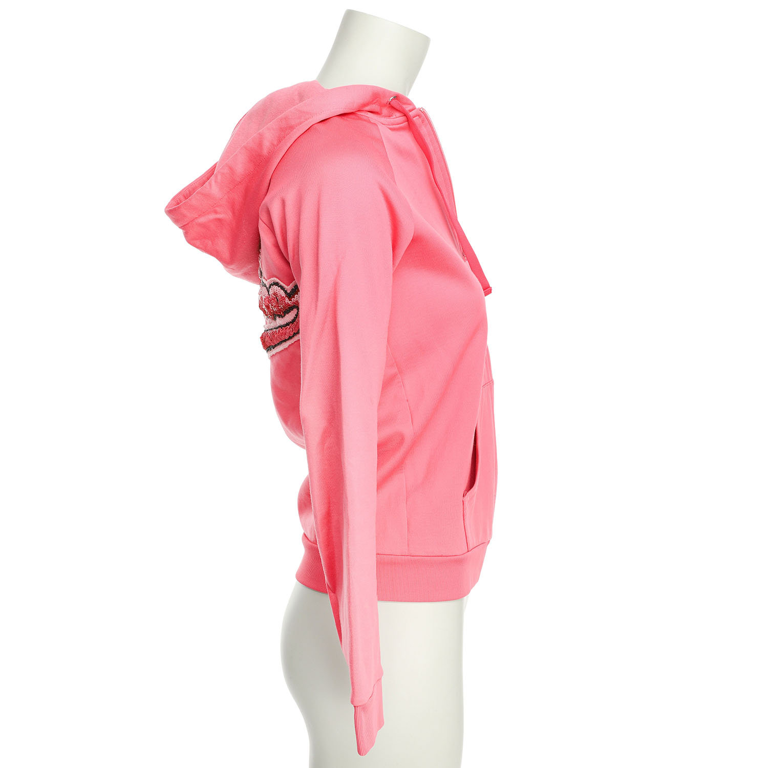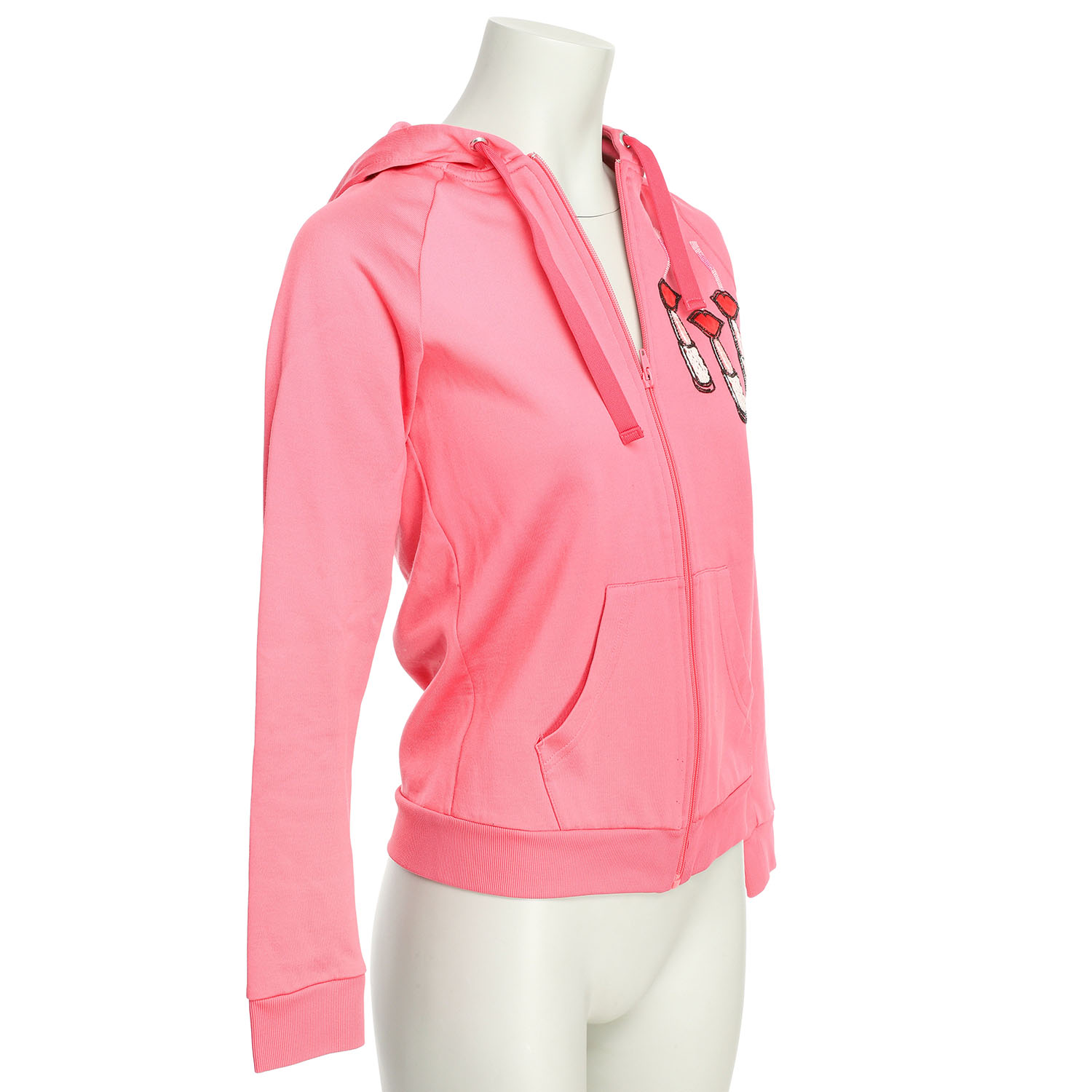 Textilgemisch in Rosa mit Reißverschluss, Kapuze, seitlichen Eingriftaschen und elastischen Bündchen. Front mit dekorativem Patch mit Perlenstickerei in Form eines Lippenstiftes sowie Kussmund. Rückseite mit Pailletten besticktem Logo-Patch. Leichte Tragespuren vorhanden.