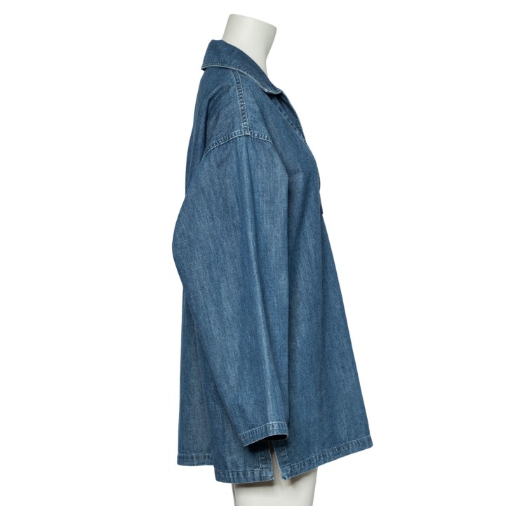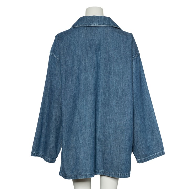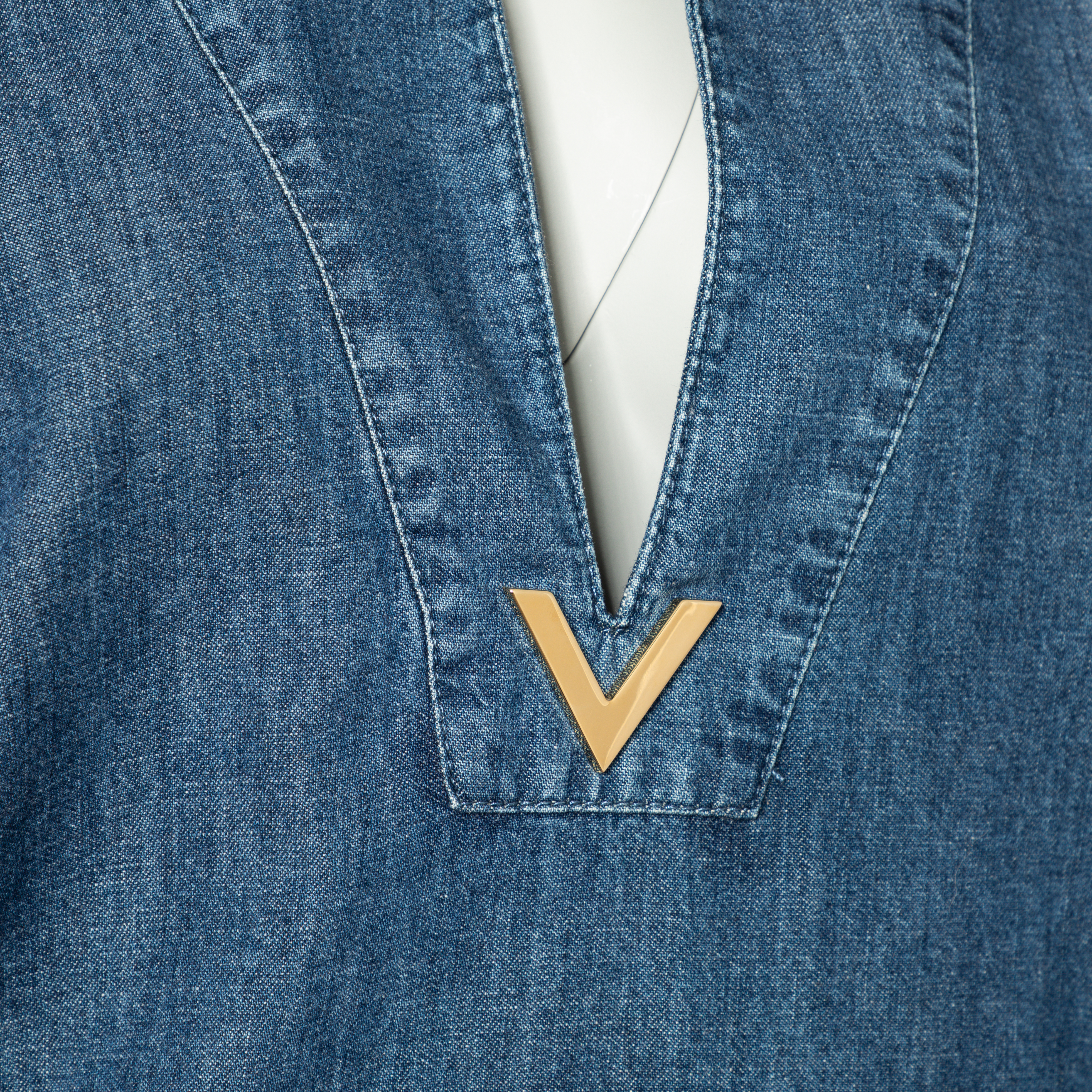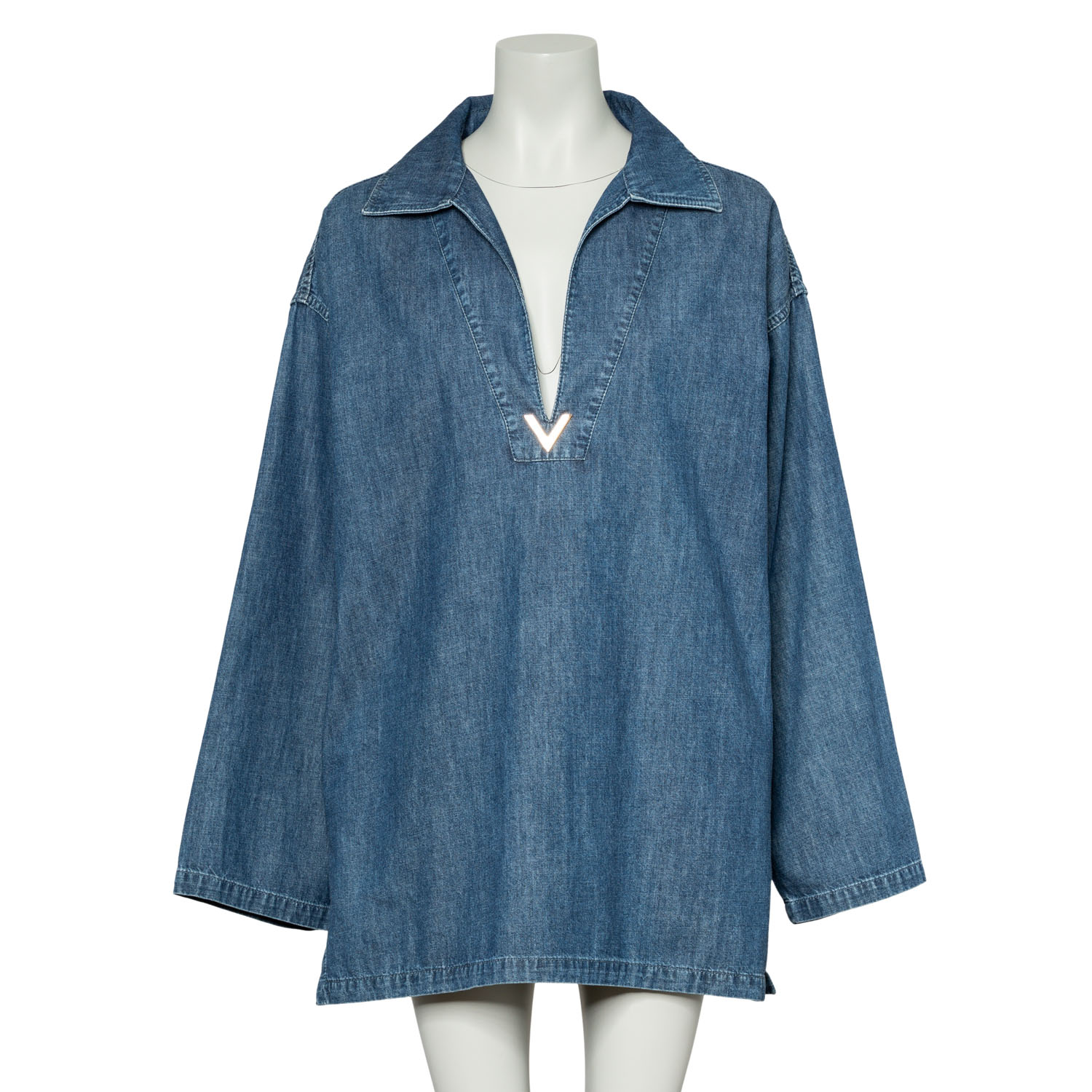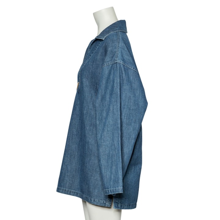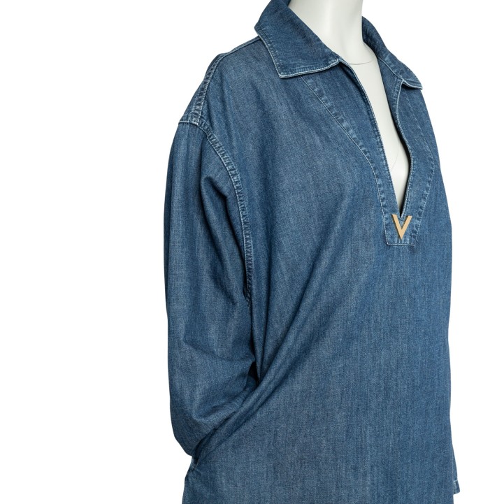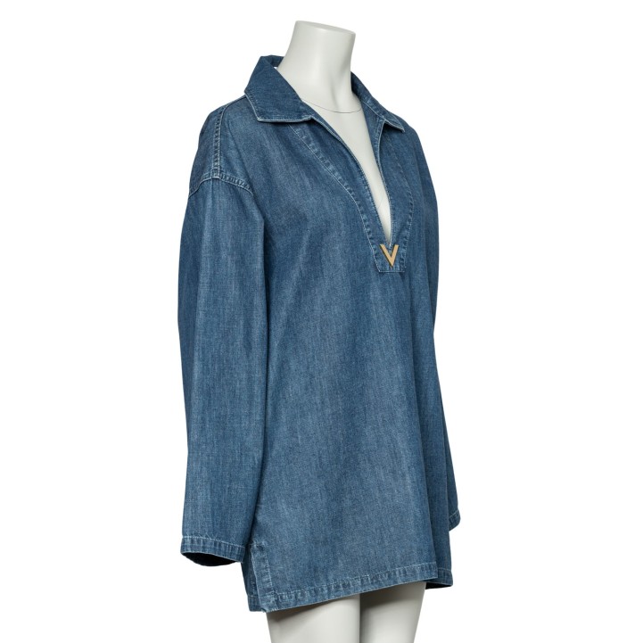 Denim mit V-Ausschnitt, Umlegekragen, goldfarbenem Dekor am Ausschnitt sowie langen, weiten Ärmeln. Tragespuren vorhanden.