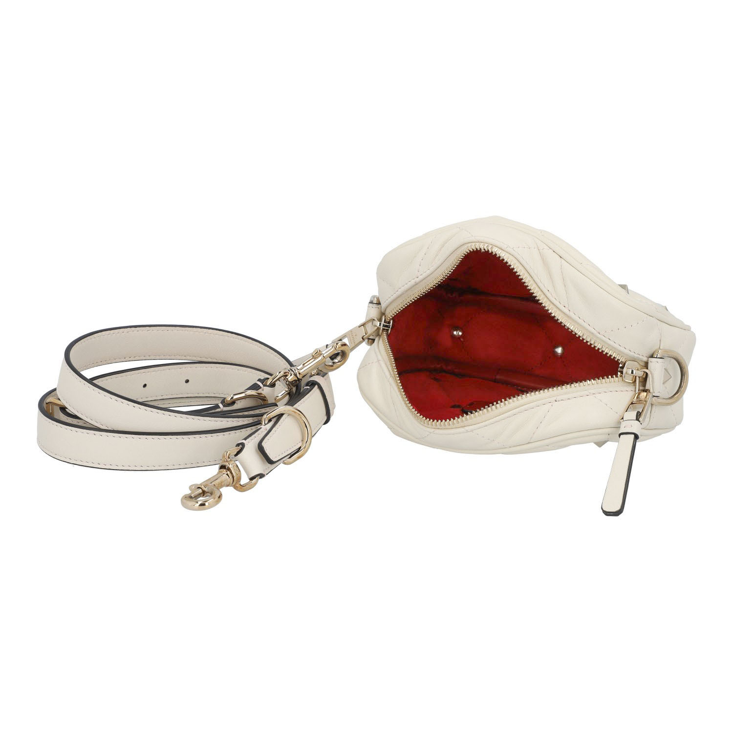 Kleines Modell aus Leder in Weiß mit großer Rautensteppung und goldfarbener Hardware Innenleben in Rot. Längenverstellbarer Trageriemen und ein Staubbeutel anbei. Leichte Gebrauchsspuren vorhanden. 16x5x9,5cm.