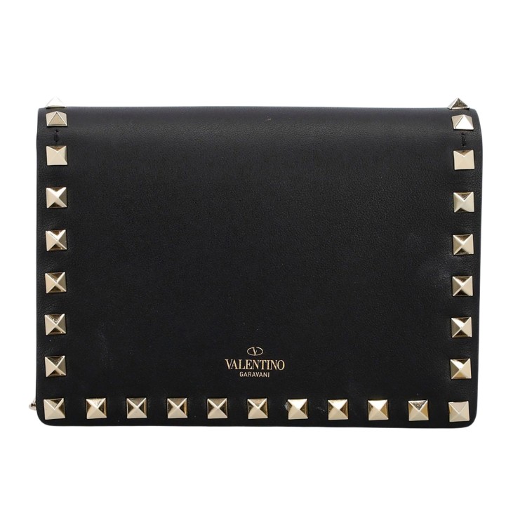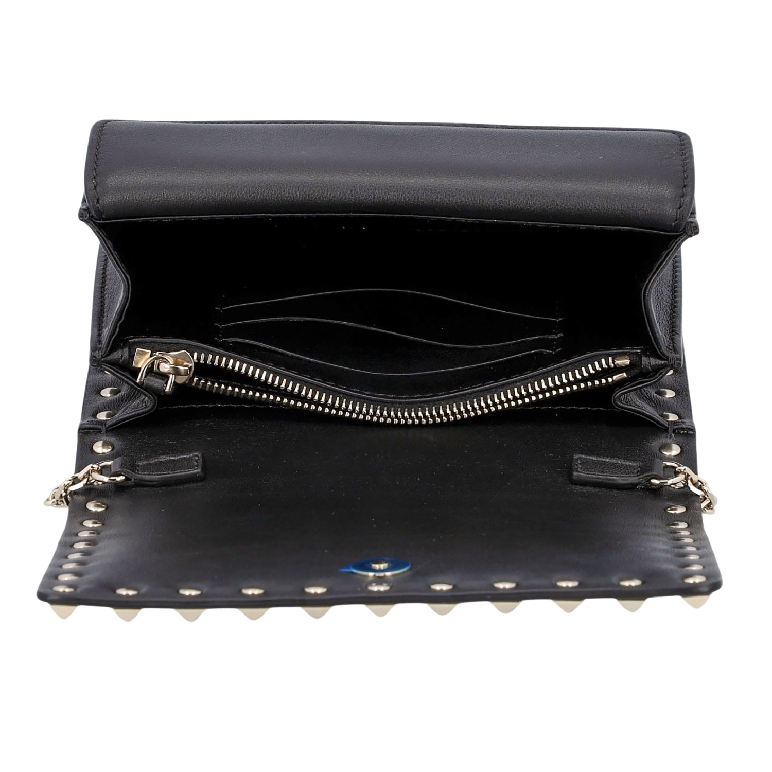 Schwarzes Leder mit goldfarbener Hardware, Nietendekor an den Kanbte, Kettenriemen, amgebtischer Überschlag und Außenfach. Innenraum mit drei Abteilen, mittiges mit Reißverschluss und drei KArtenfächer. Box und Staubbeutel anbei. Neuwertig. 16 x 5 x 12 cm.