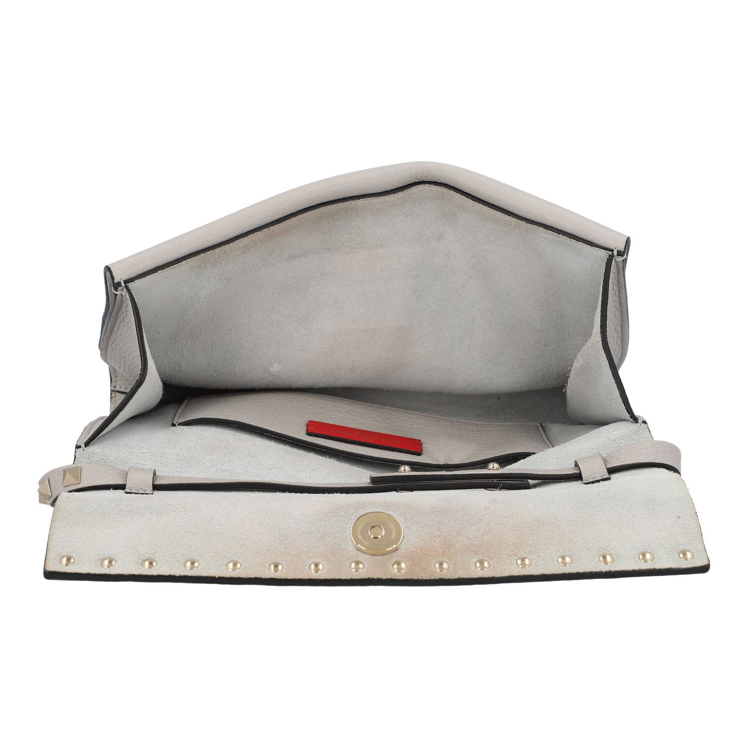 Graues Leder mit goldfarbener Hardware, Rockstud-Dekor, doppelter Überschlag mit Steckschließe und Schulterriemen. Innenraum mit einem Fach. Staubbeutel anbei. Guter Zustand. 23,5 x 16 cm.