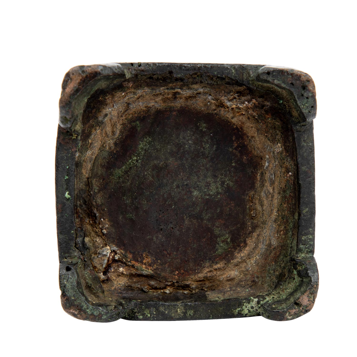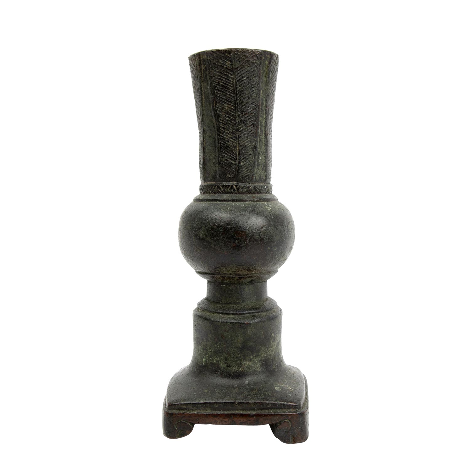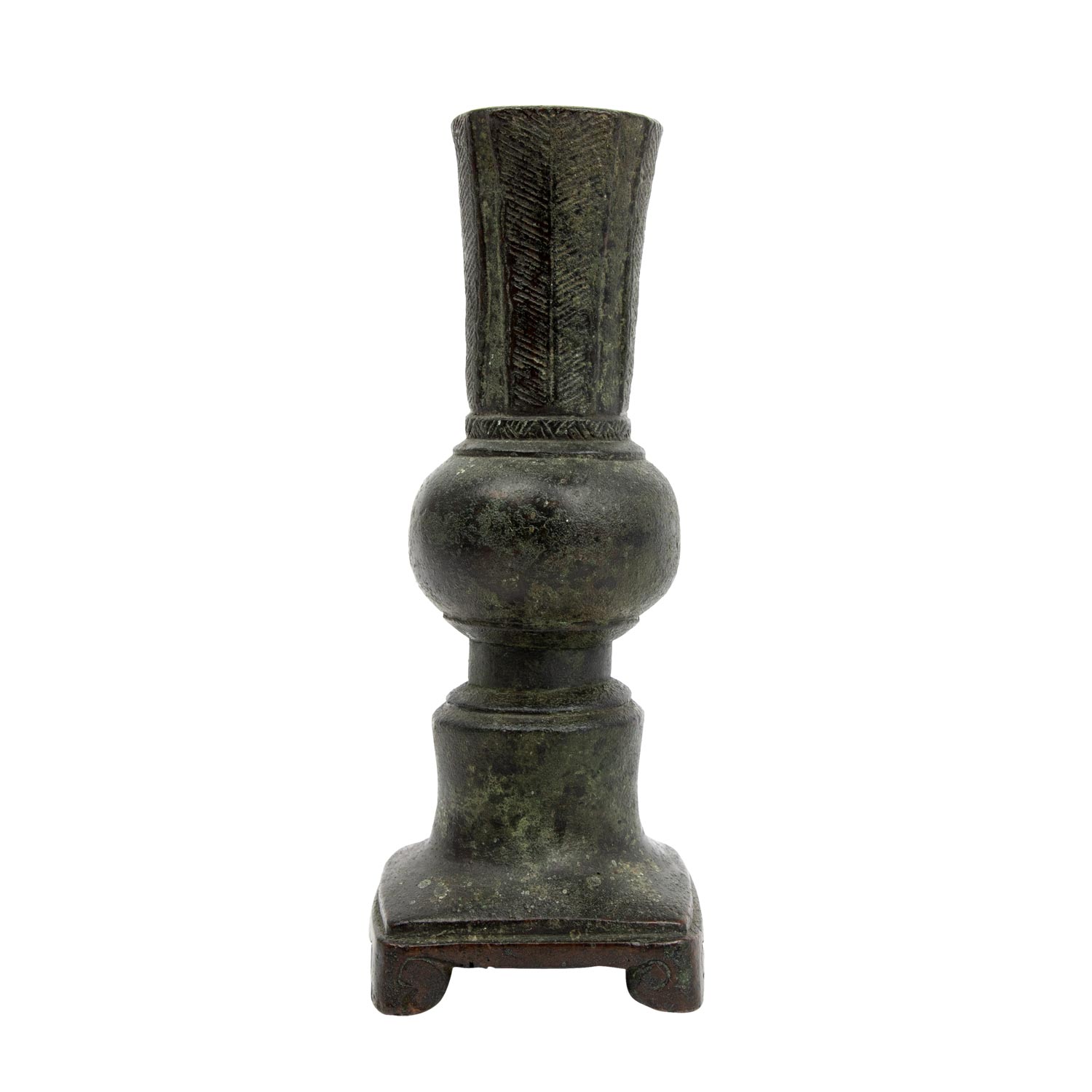 | A bronze vase on an integral square base on four low feet. CHINA. Spherical body with high neck decorated with relief decor in archaic style, h: 18 cm. Beautiful age patina.