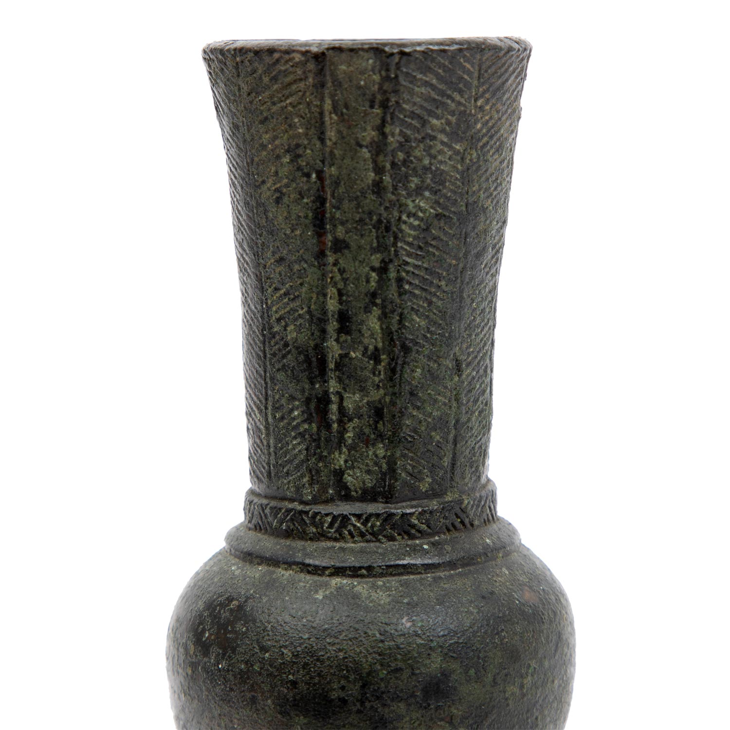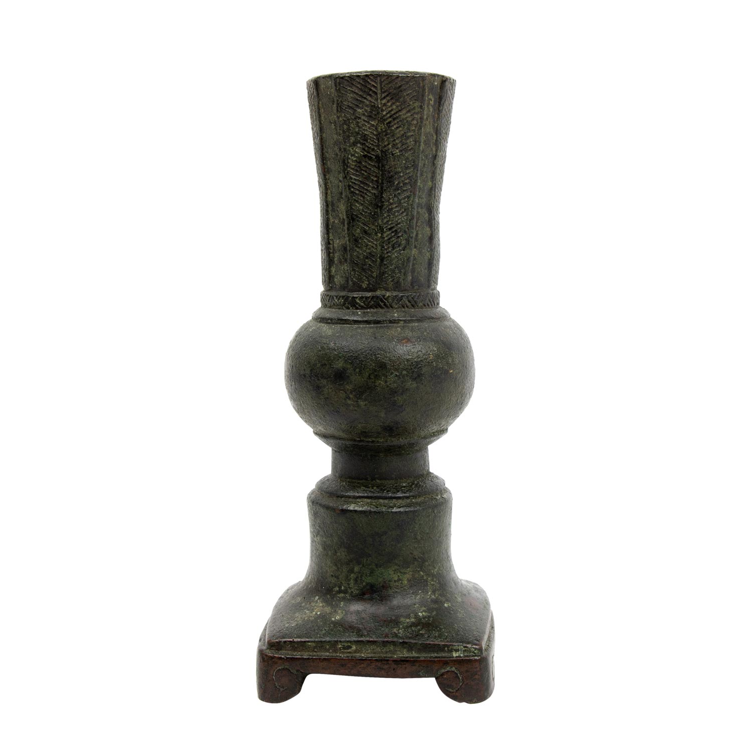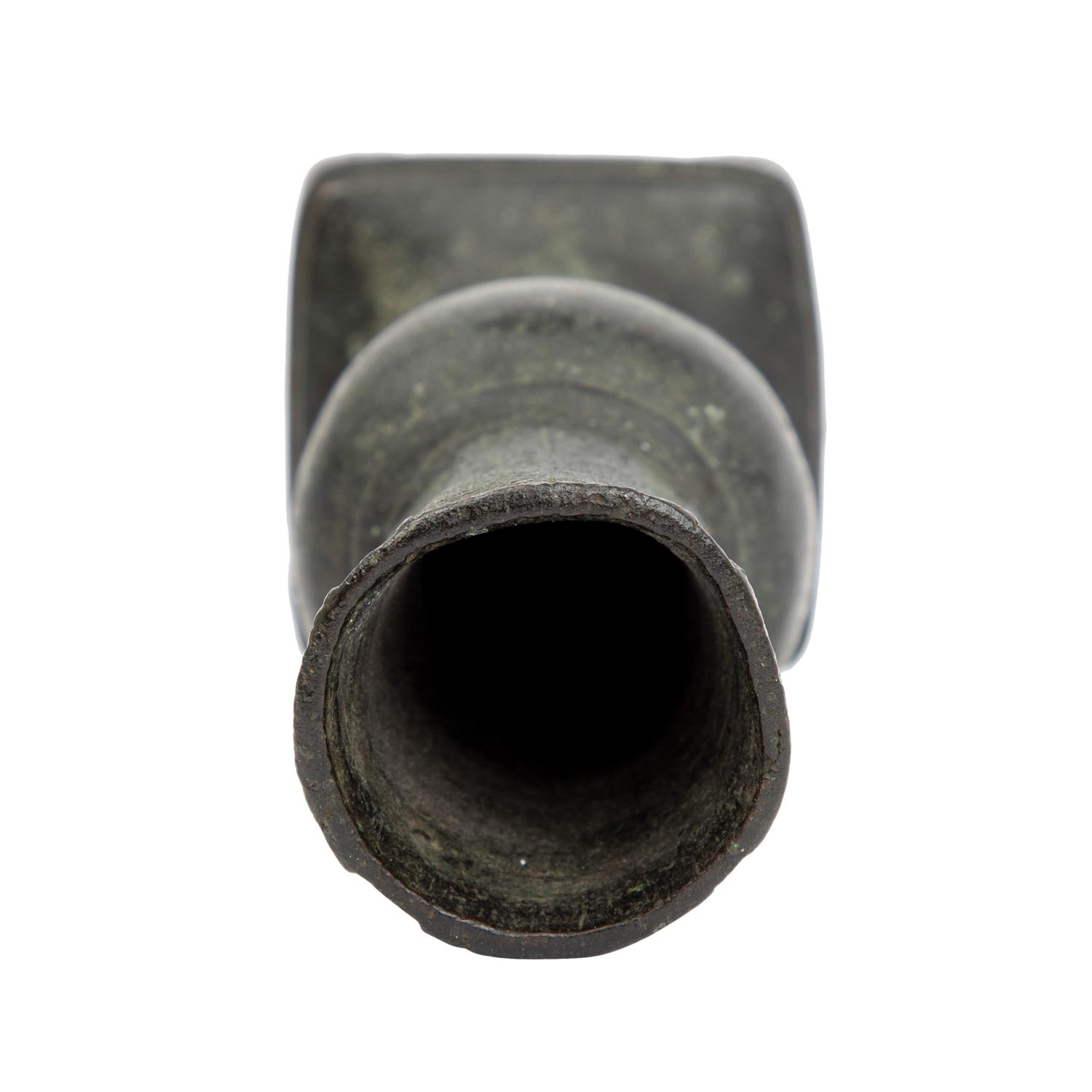 Bronzevase auf quadratischem Sockel auf vier niedrigen Füßen. Kugeliger Korpus mit hohem Hals, der mit Reliefdekor im archaischen Stil verziert ist, H: 18 cm. Schöne Alterspatina.