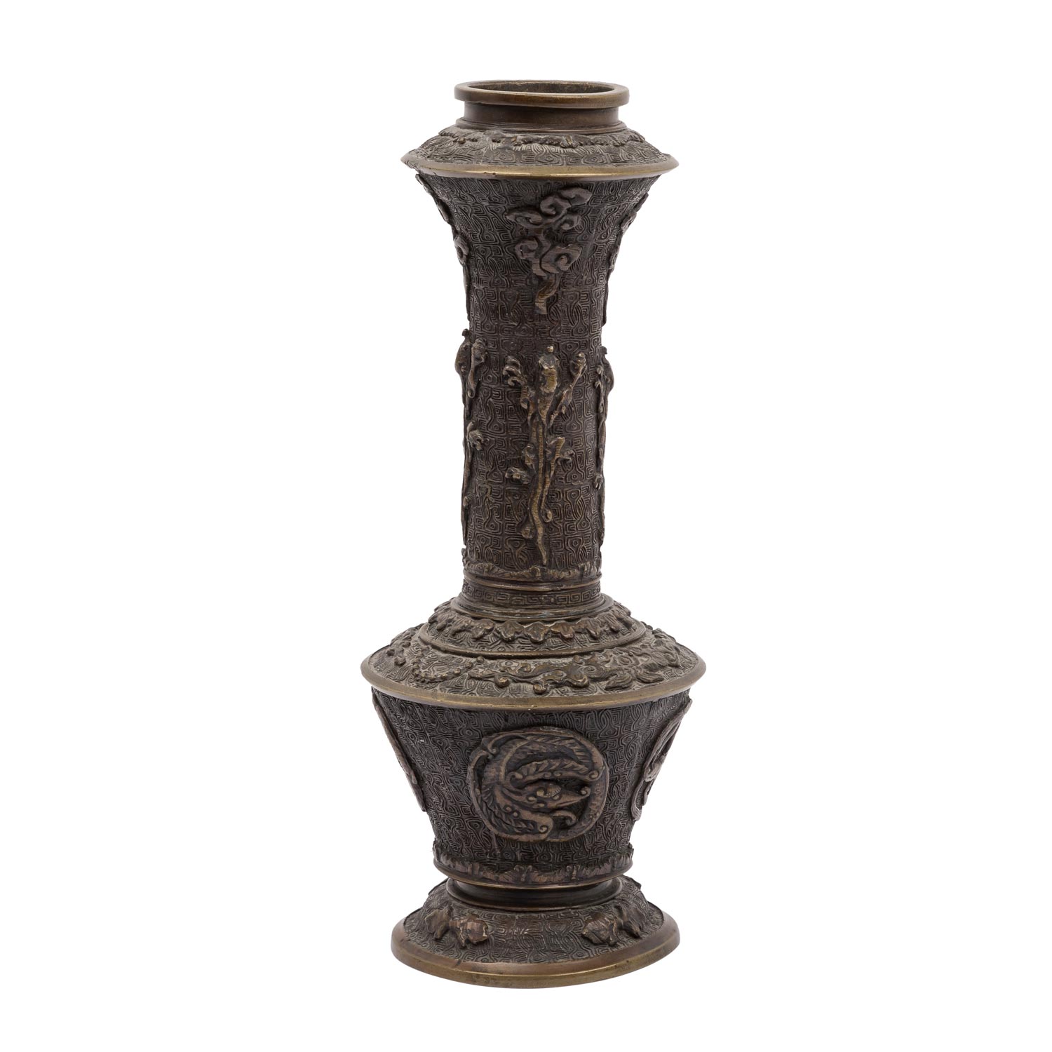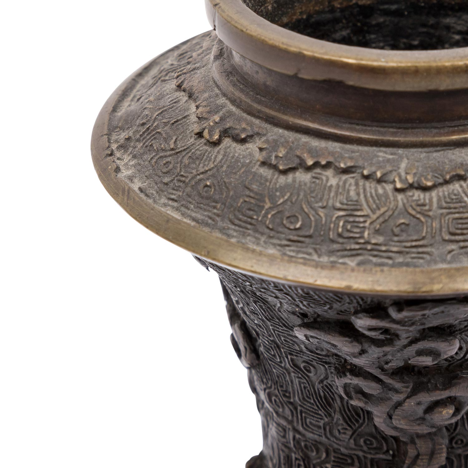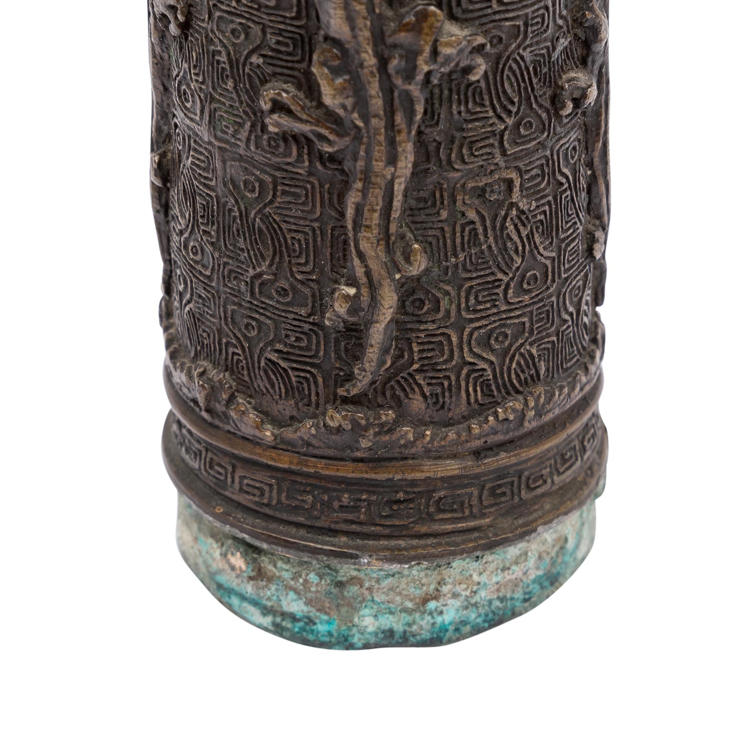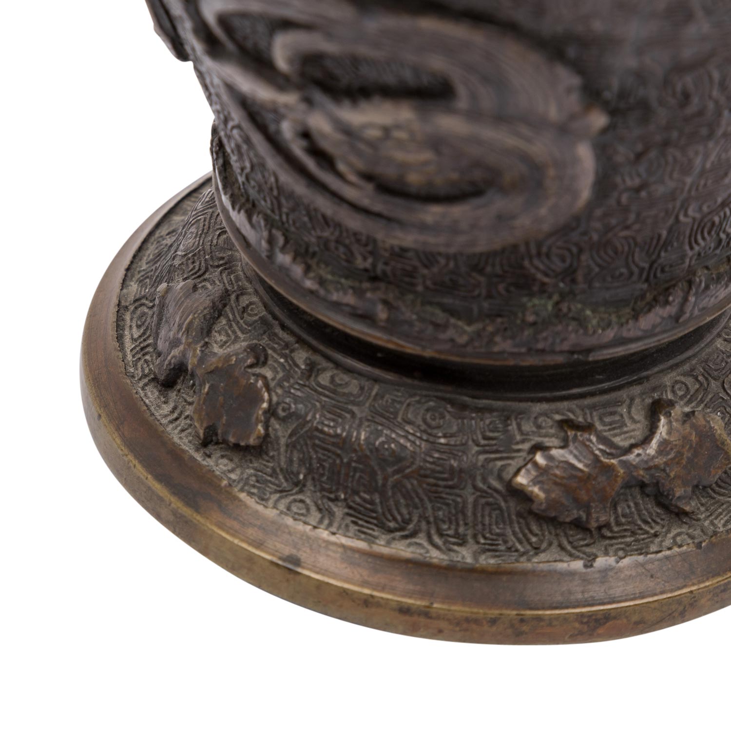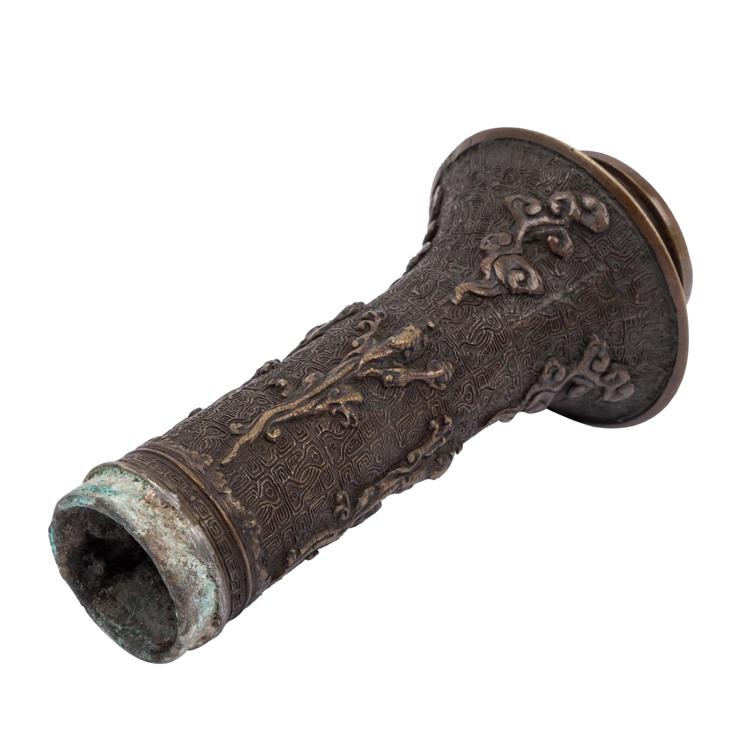 | Bronze vase. CHINA, conical form on round base with high, detachable narrow neck. Two-piece vase in archaic style, ornamentally patterned over the whole surface and decorated in relief with clouds lizards and other animals, h: 25,5 cm. Traces due to age.