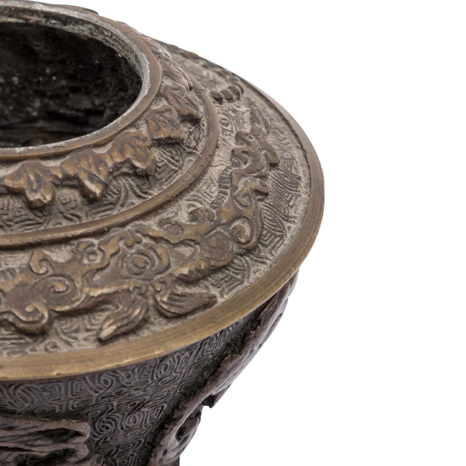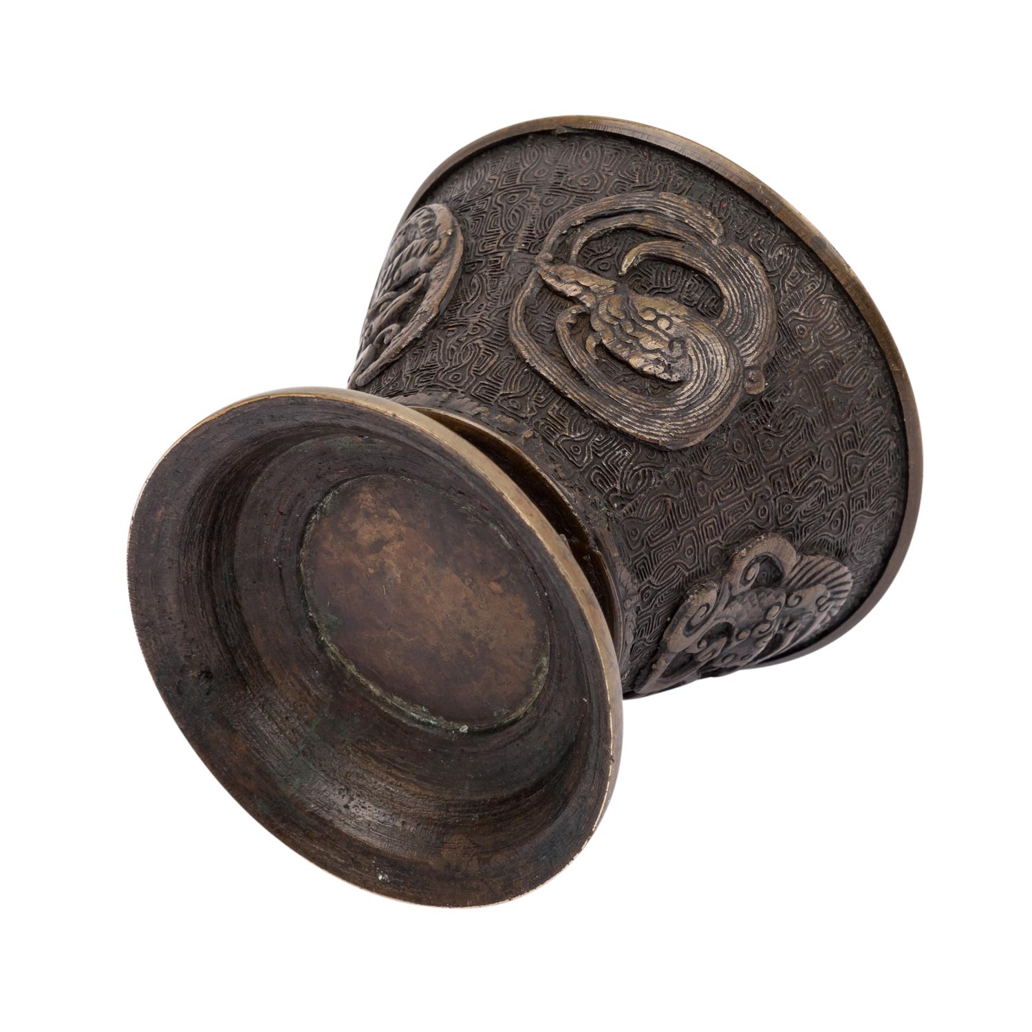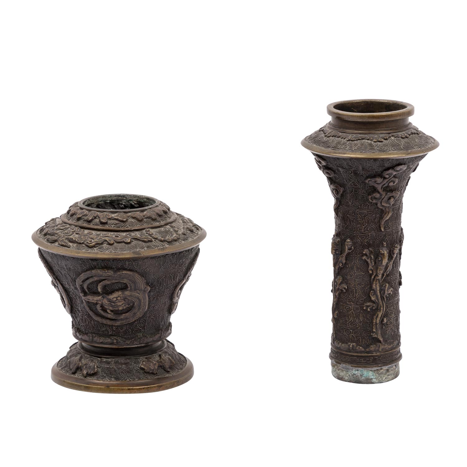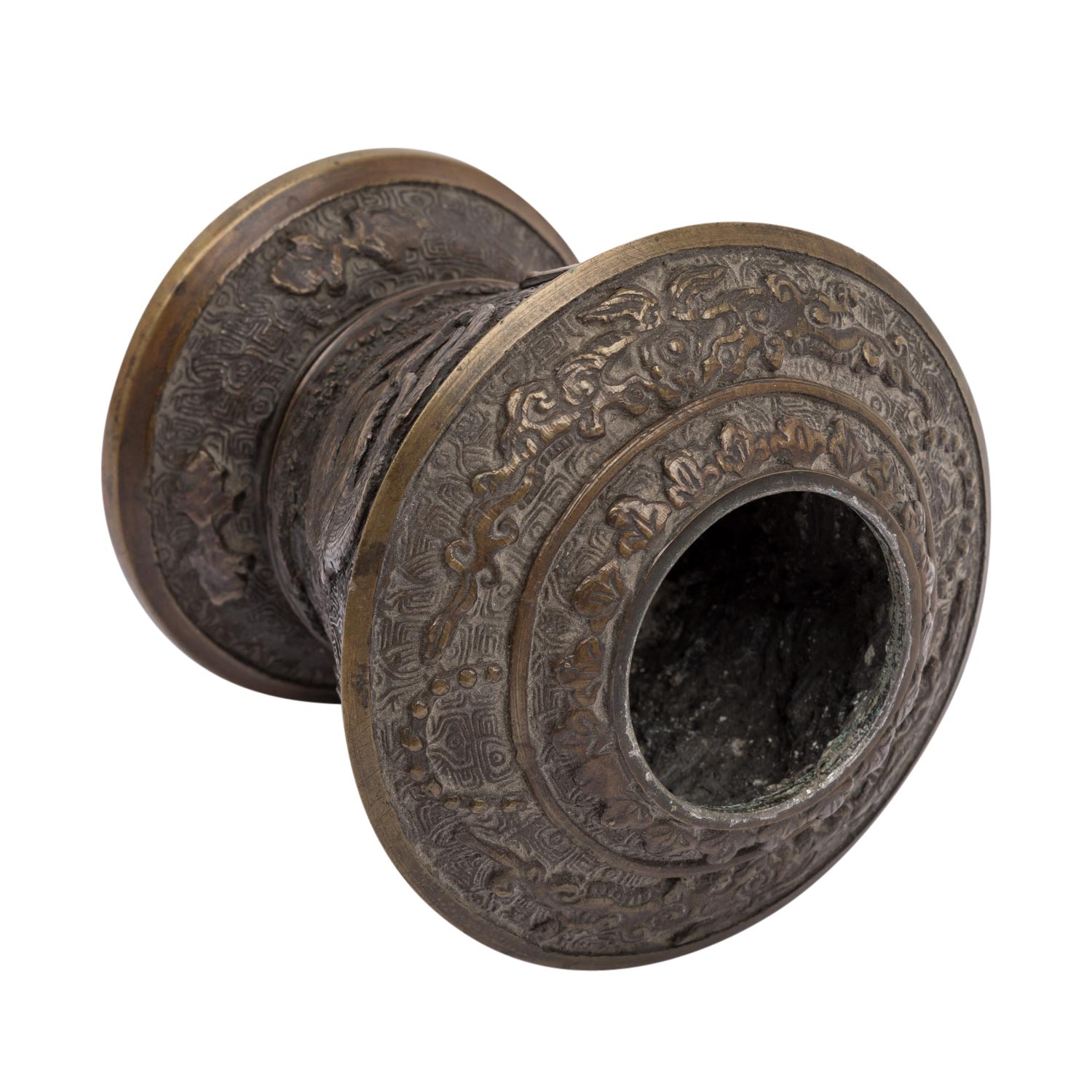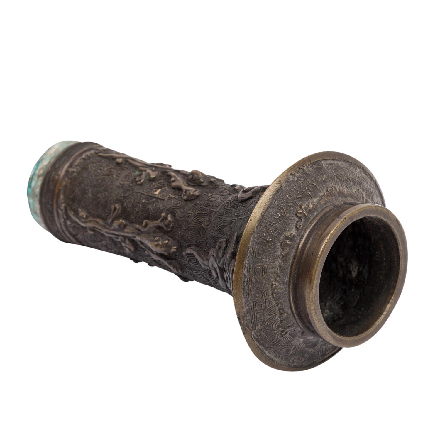 | Bronze vase. CHINA, conical form on round base with high, detachable narrow neck. Two-piece vase in archaic style, ornamentally patterned over the whole surface and decorated in relief with clouds lizards and other animals, h: 25,5 cm. Traces due to age.