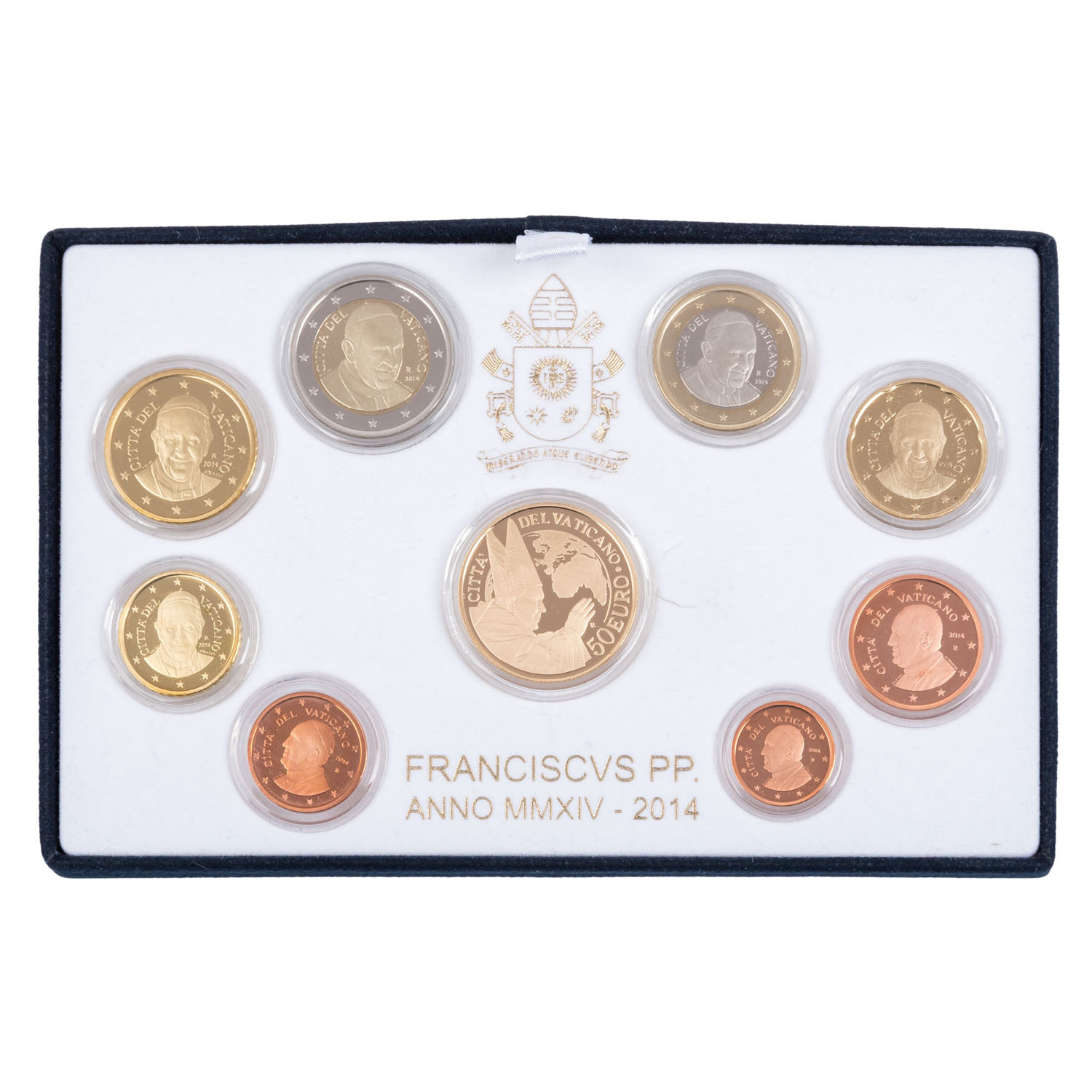 mit zusätzlicher Goldmünze von 50€, ca. 13,7g Gold fein, Papst Franziskus, PP, KMS gekapselt in Samt-Etui und Umverpackung. Steuerbefreit nach § 25c UStG.