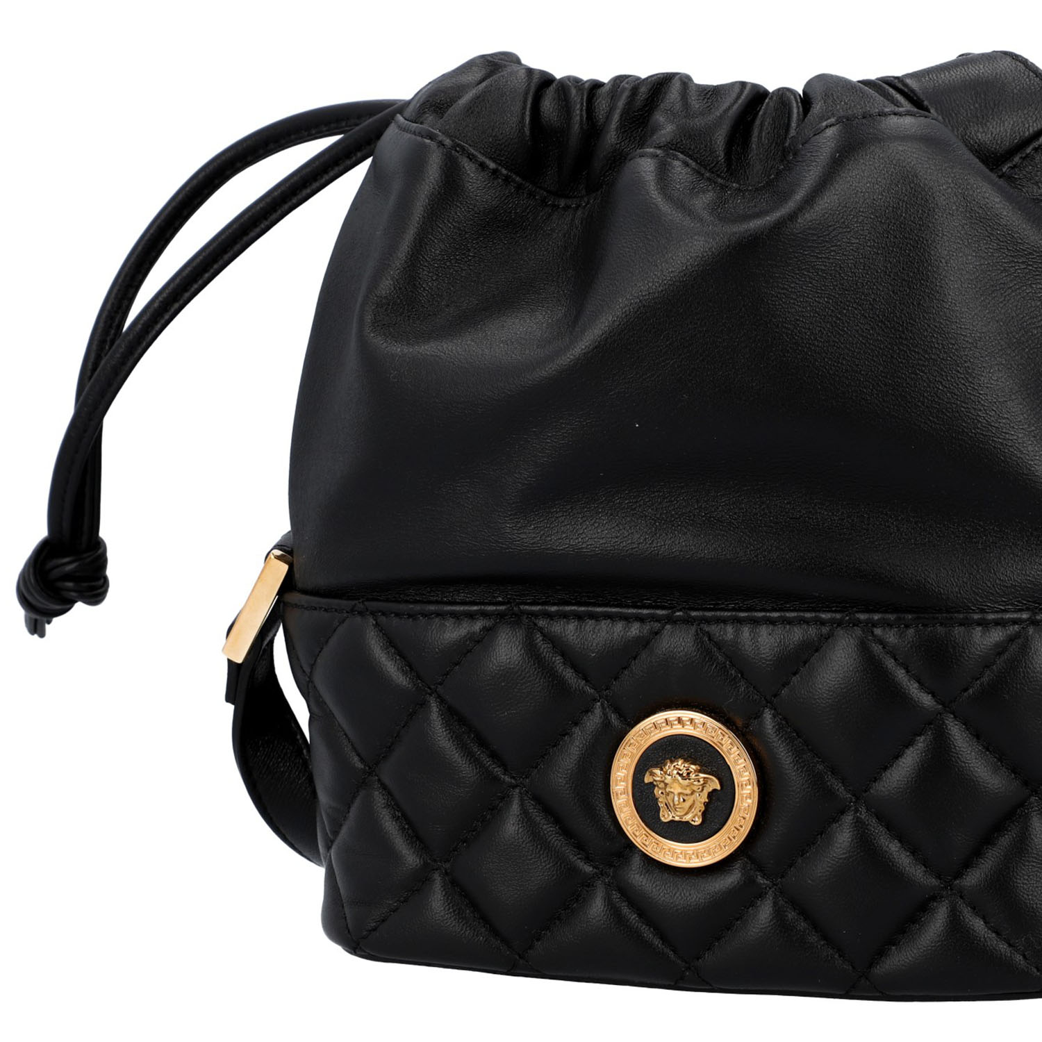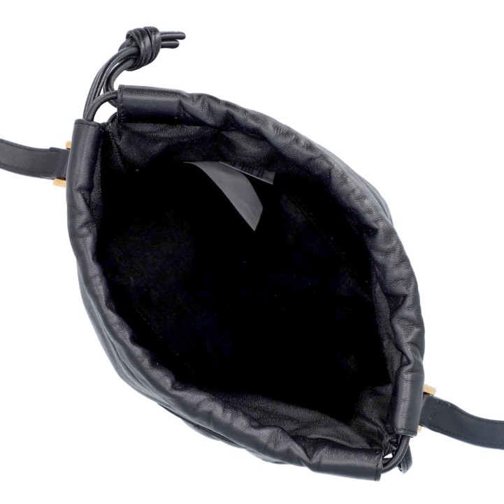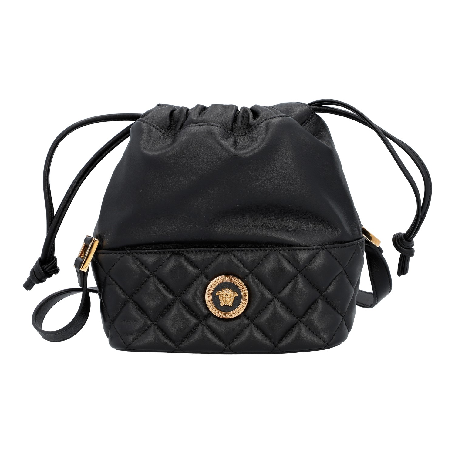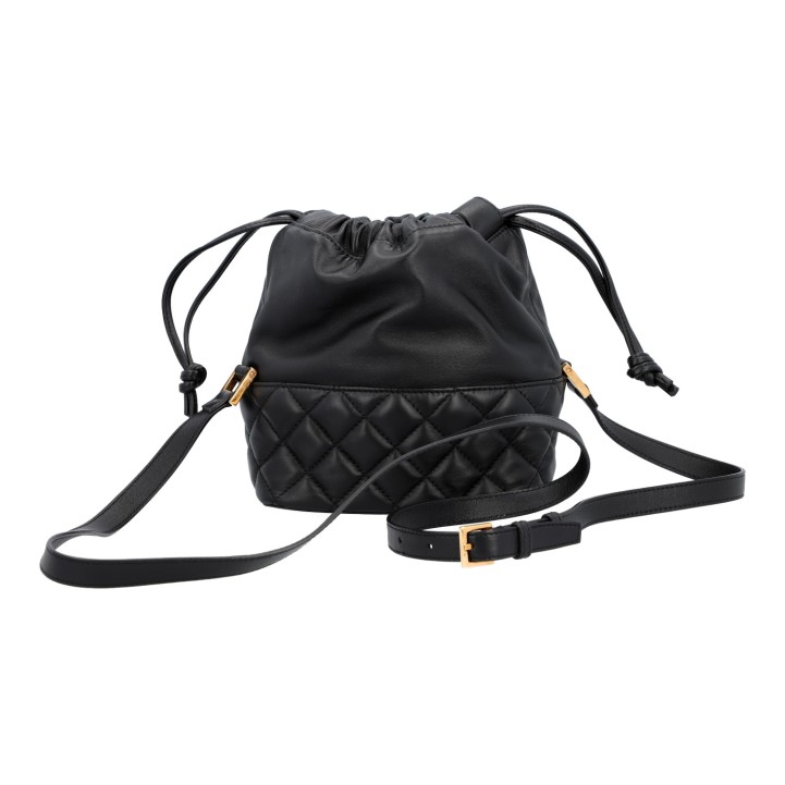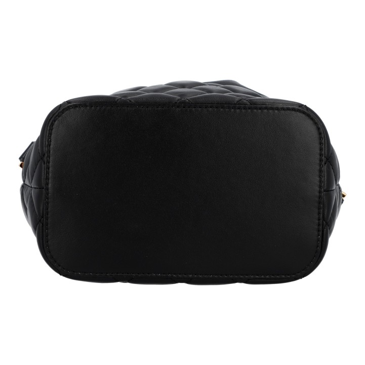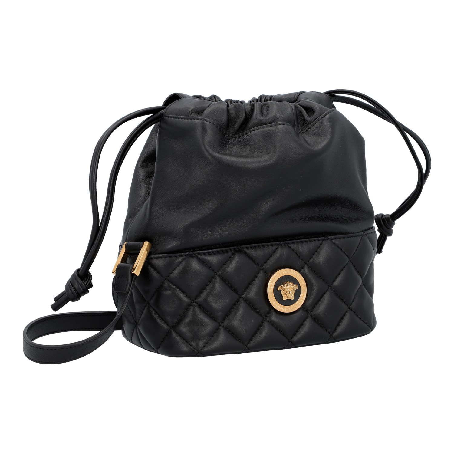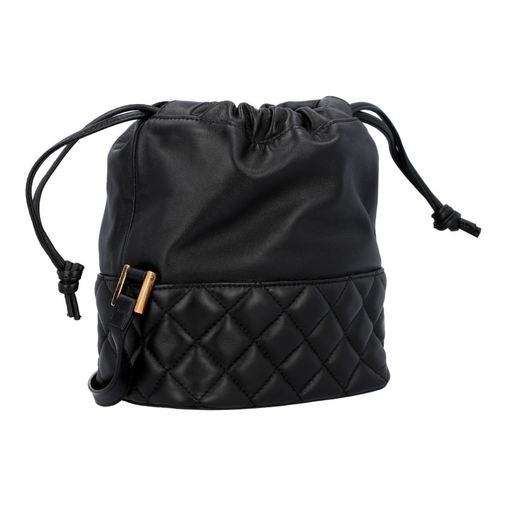 Aus Lammleder in Schwarz, zum Teil mit Rautensteppung. Hauptfach mit Zugband, Front mit goldfarbener Applikation. Längenverstellbarer Trageriemen. Staubbeutel anbei. Sehr guter Erhalt. 16x10x20cm.