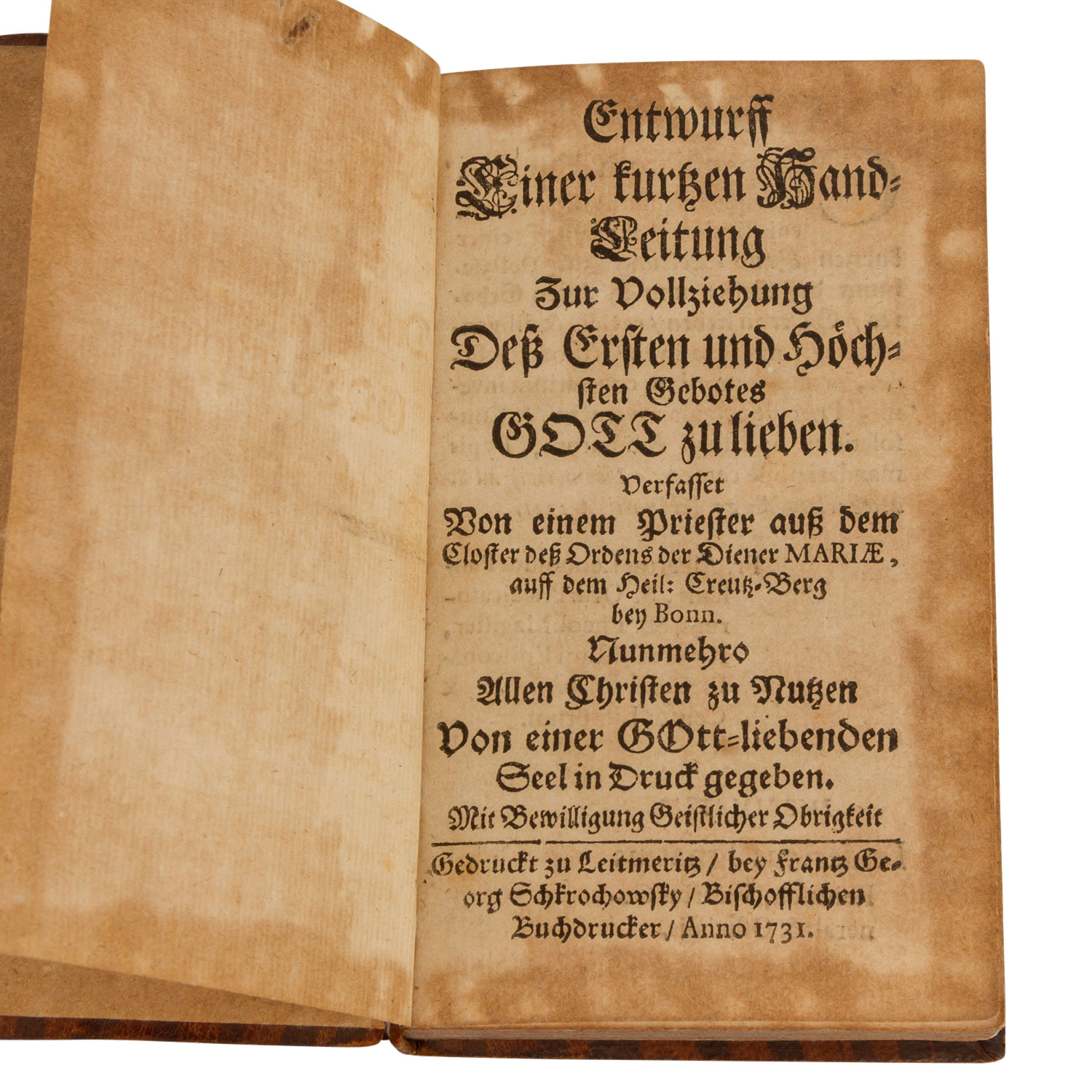 CAMILLO ETTORI 'Holy Wasteland... '1728, Publisher: Clementin. Buchdr., Prag, 1728, Heilige Einöde in welcher binnen acht oder zehn Tage durch Betrachtung der ewigen Wahrheiten und Grundsätzen unsers Glauben nach Anweisung der geistl. Exercises of S. Ignatii de Lojola...HxW: 17/12 cm. Signs of age. FRANTZ GEORG SCHKROCHOWSKY 'Draft of a Short Hand Guide...1731, Draft of a Short Manual for the Execution of the First and Highest Commandment to Love God /Written by a Priest from the Monastery of the Order of the Servants of Mary, on the Heil. Creutz-Berg near Bonn. Now published for the benefit of all Christians by a God-loving soul /Printed in Leitmeritz by Frantz Georg Schkrochowsky, Bischofflicher Buchdrucker, 1731, HxW: 14/8 cm. Signs of age. A.M. FIEGER 'Gesandtschafft des betrangten....' 1751 Fieger, Angelus Maria, Gesandtschafft des bedrangten Teutschlands zur Trösterin der Betrübten Das ist Verträuliche Unterredungen mit Maria in allen Nöthen, HxW: 18/12 cm. Signs of age. A.M. FIEGER 'Gesandtschafft des betrangten....' (Mission of the afflicted....) 1739