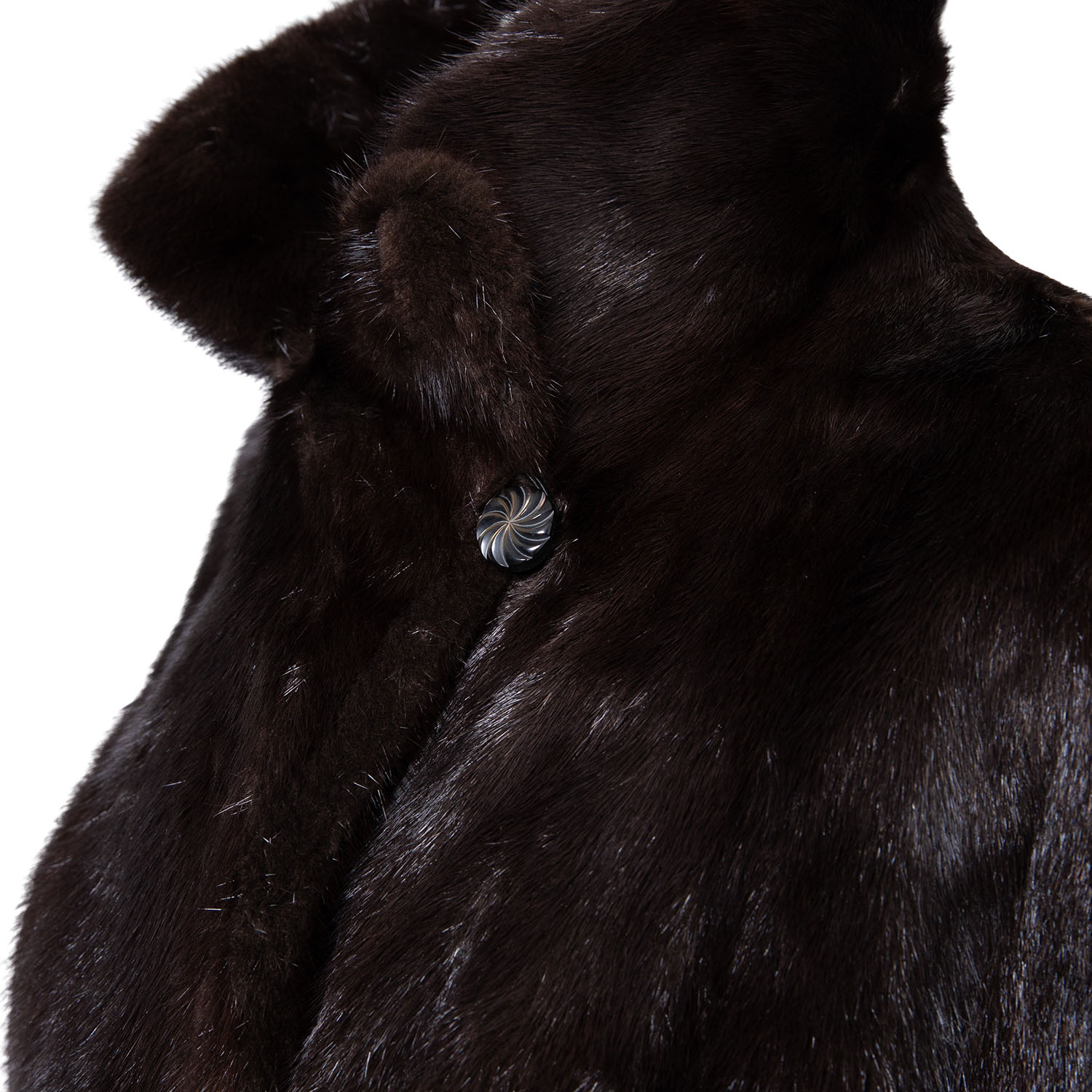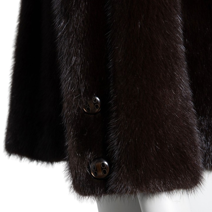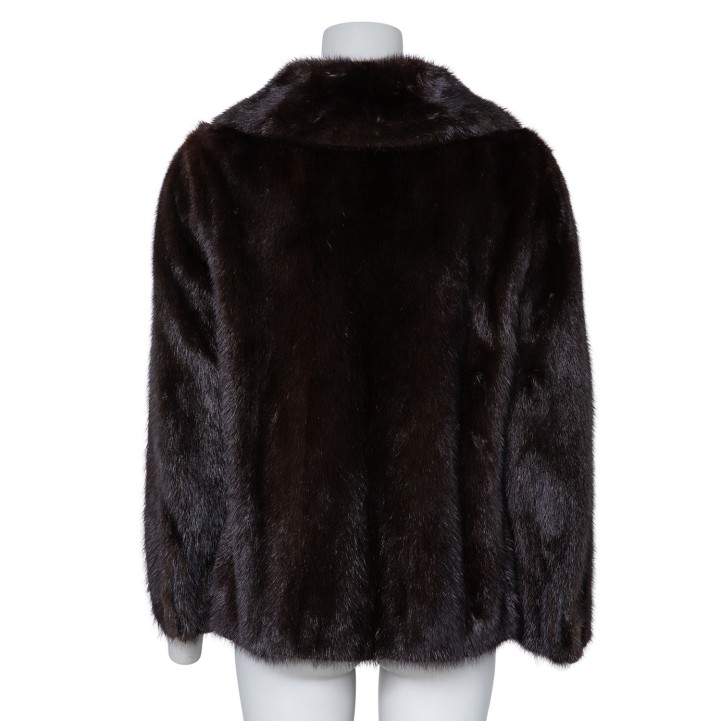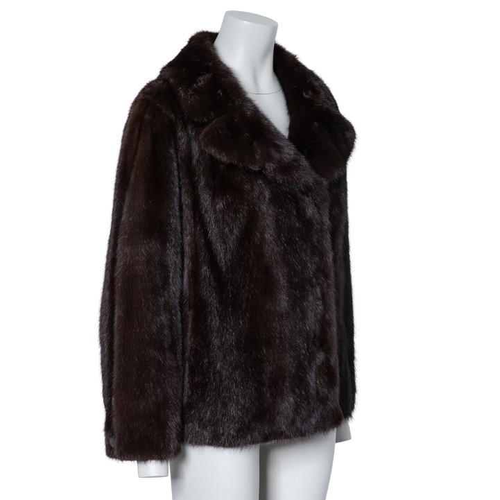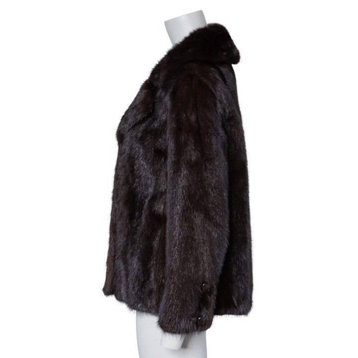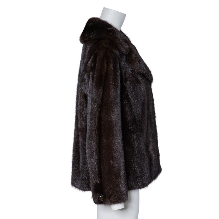 Braune Nerzfelle mit Reverskragen, Eingrifftasche sowie Haken- und Ösenverschluss. Tragespuren vorhanden.