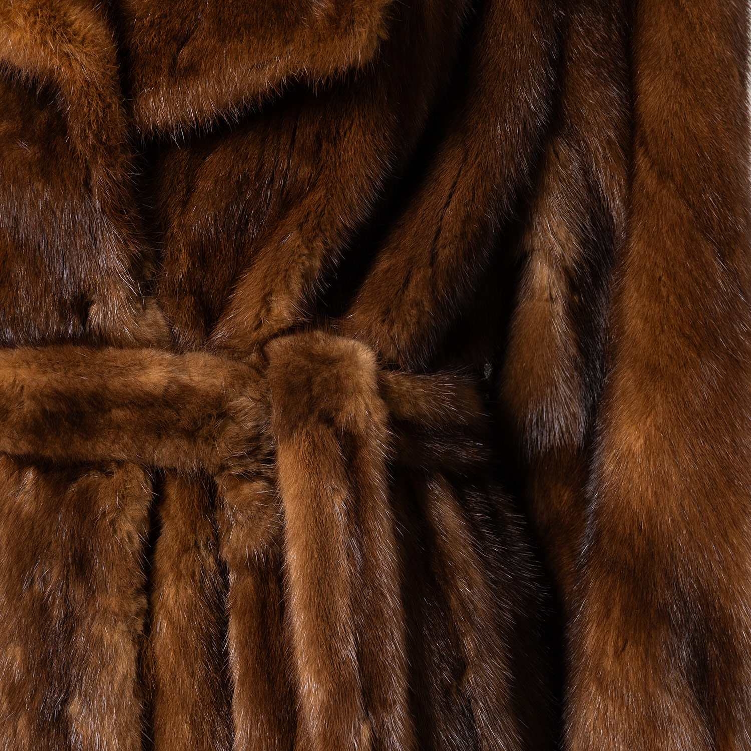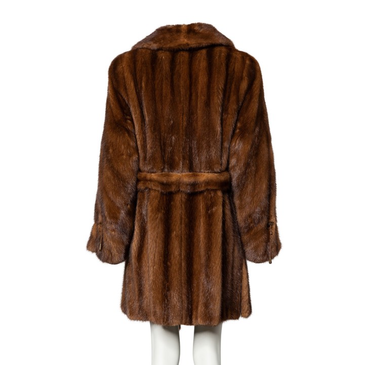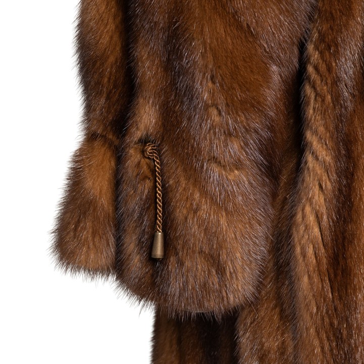 Hellbraune Saga-Nerzfelle mit Reverskragen, Eingrifftaschen sowie Haken- und Ösenverschluss. Gürtel anbei. Tragespuren vorhanden.